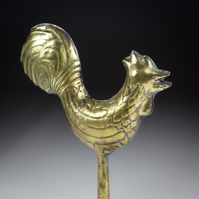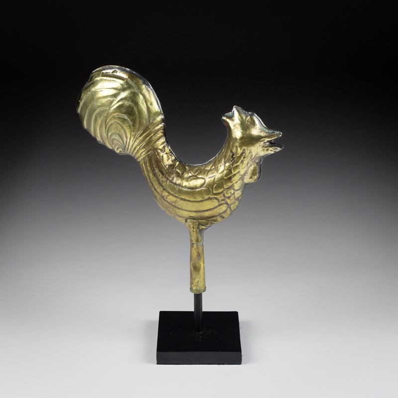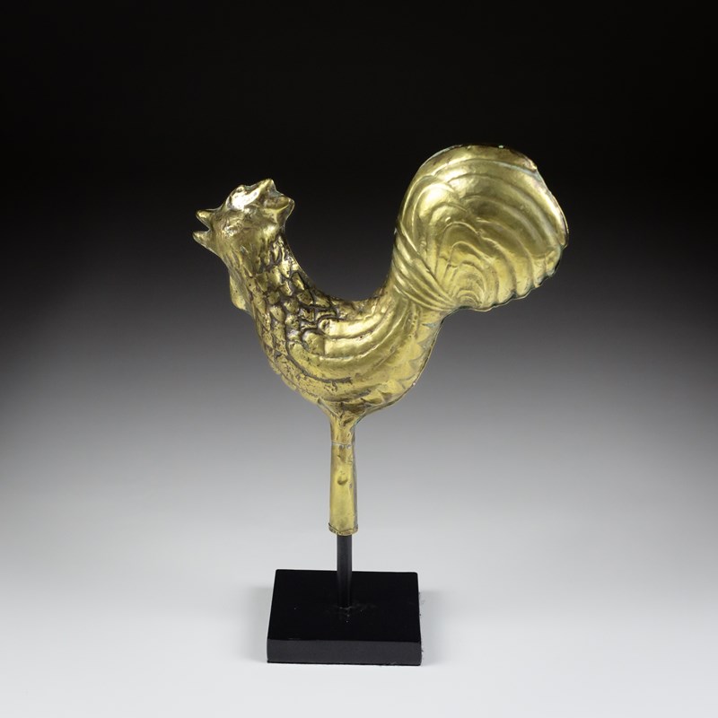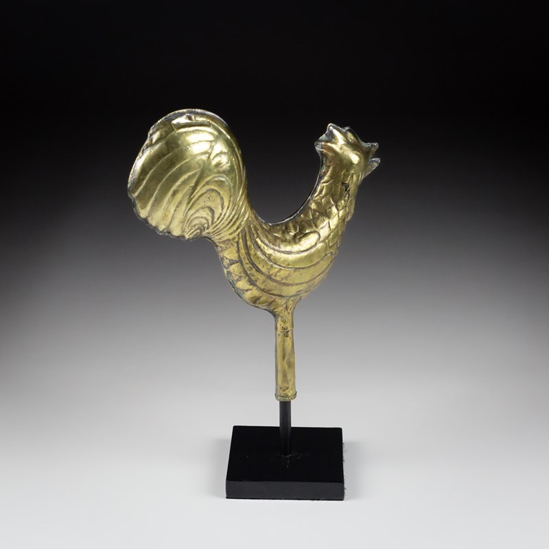 Diminutive Full Bodied Cockerel Weathervane. Brass, Circa 1880. Later Museum Stand.