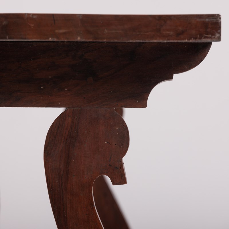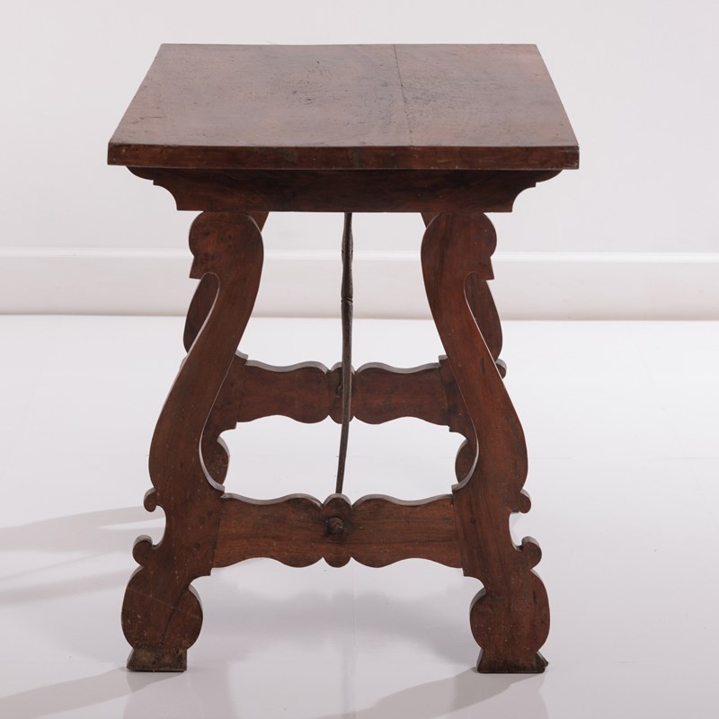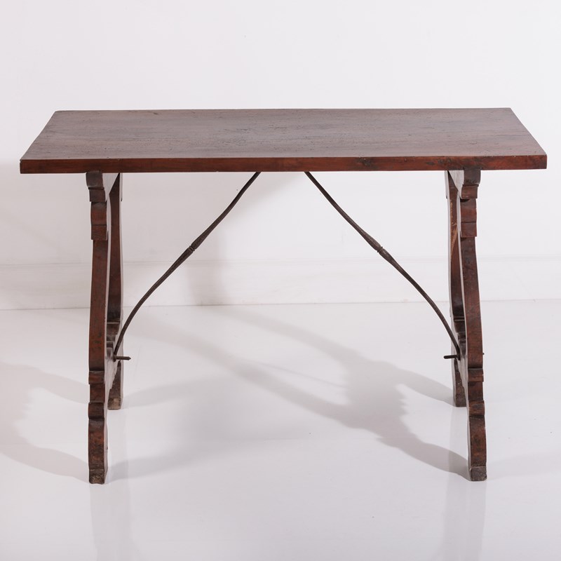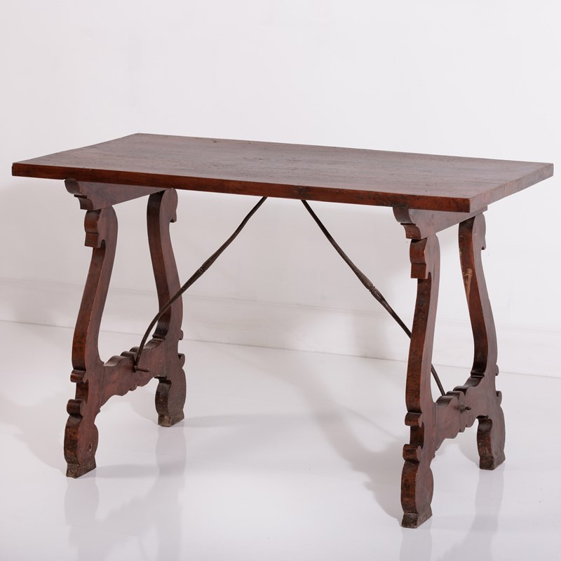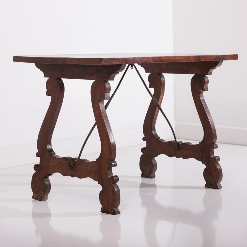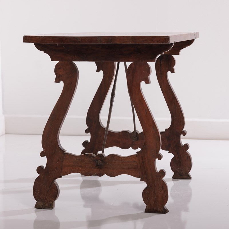 Late 19th Century Spanish Table. Lyre Legs with the appearance of swan heads. Wrought iron cross stretcher. Good patina. As expected wear commensurate with age. Spain, Circa 1880.