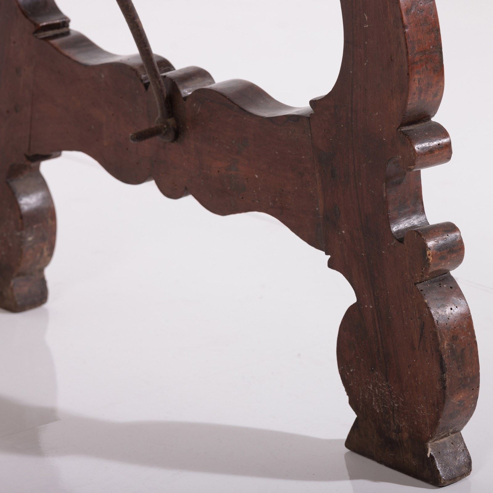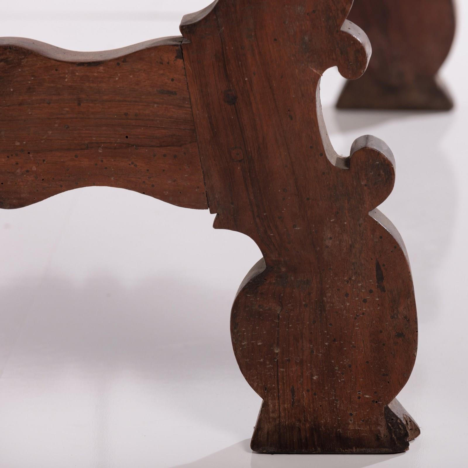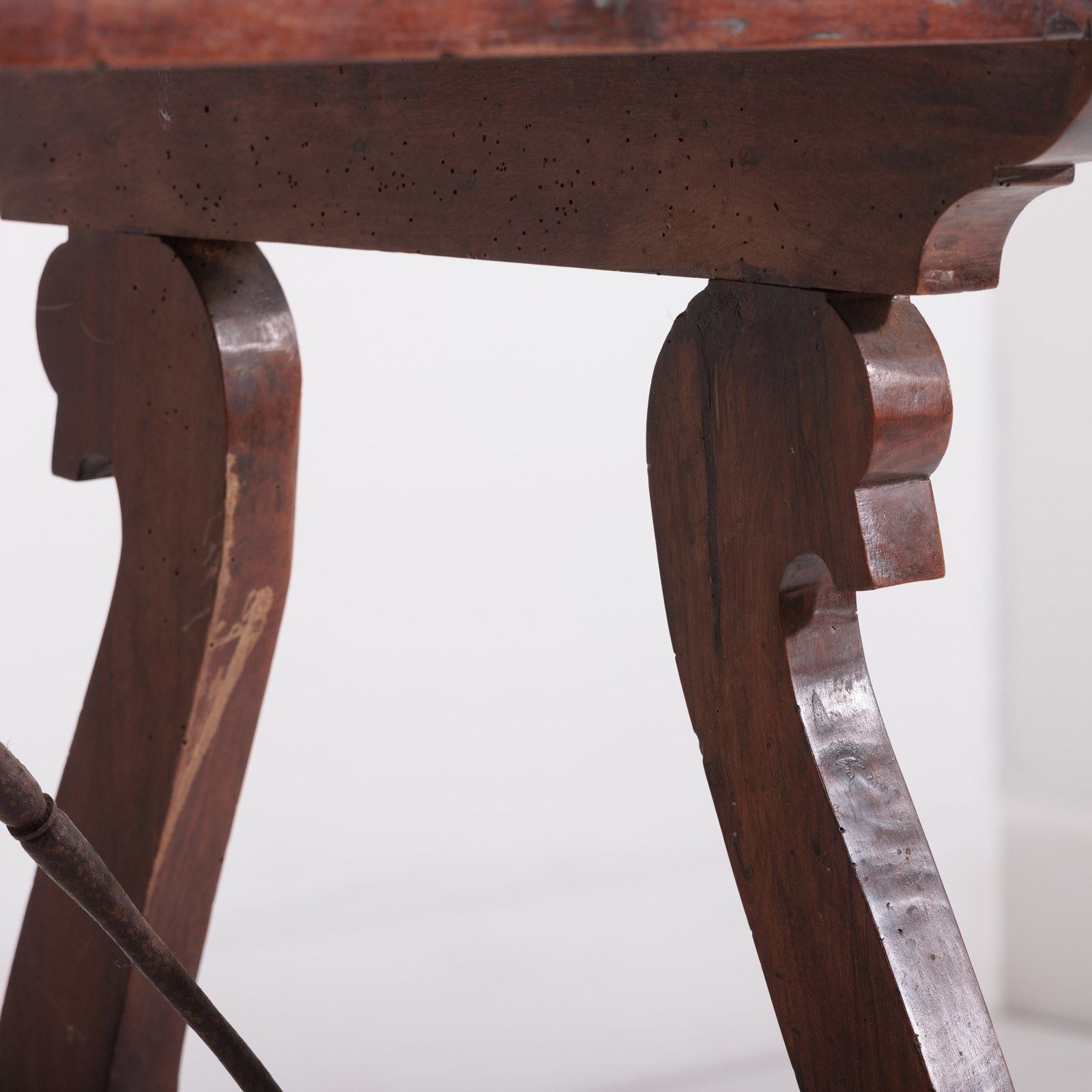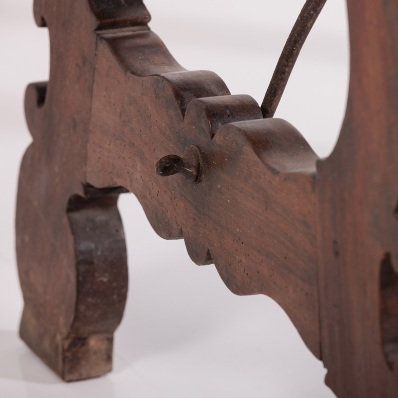 Late 19th Century Spanish Table. Lyre Legs with the appearance of swan heads. Wrought iron cross stretcher. Good patina. As expected wear commensurate with age. Spain, Circa 1880.