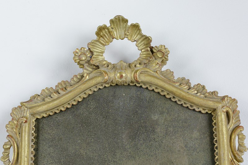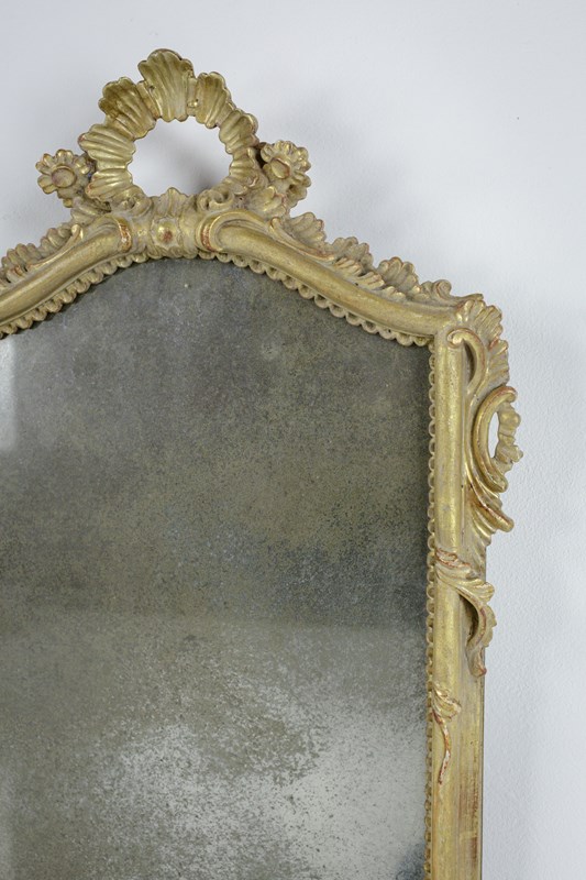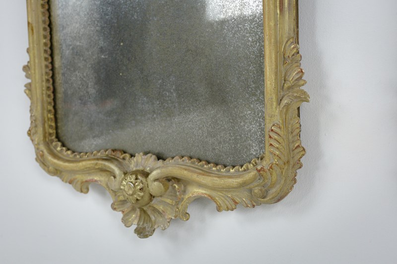 Pair of 18th Century Style Gilt Framed Mirrors. This refined pair of mirrors in the 18th Century style, gently arched crests, with intricately decorated foliate scrolls and floral motifs with a central cartouche surmounting the frame. Heavily distressed mirror plates, with their mottled, almost cloud like appearance housed in their softly distressed gilded frames evoke the grandeur and refinement of 18th Century Interiors. Italy, Circa 1920.