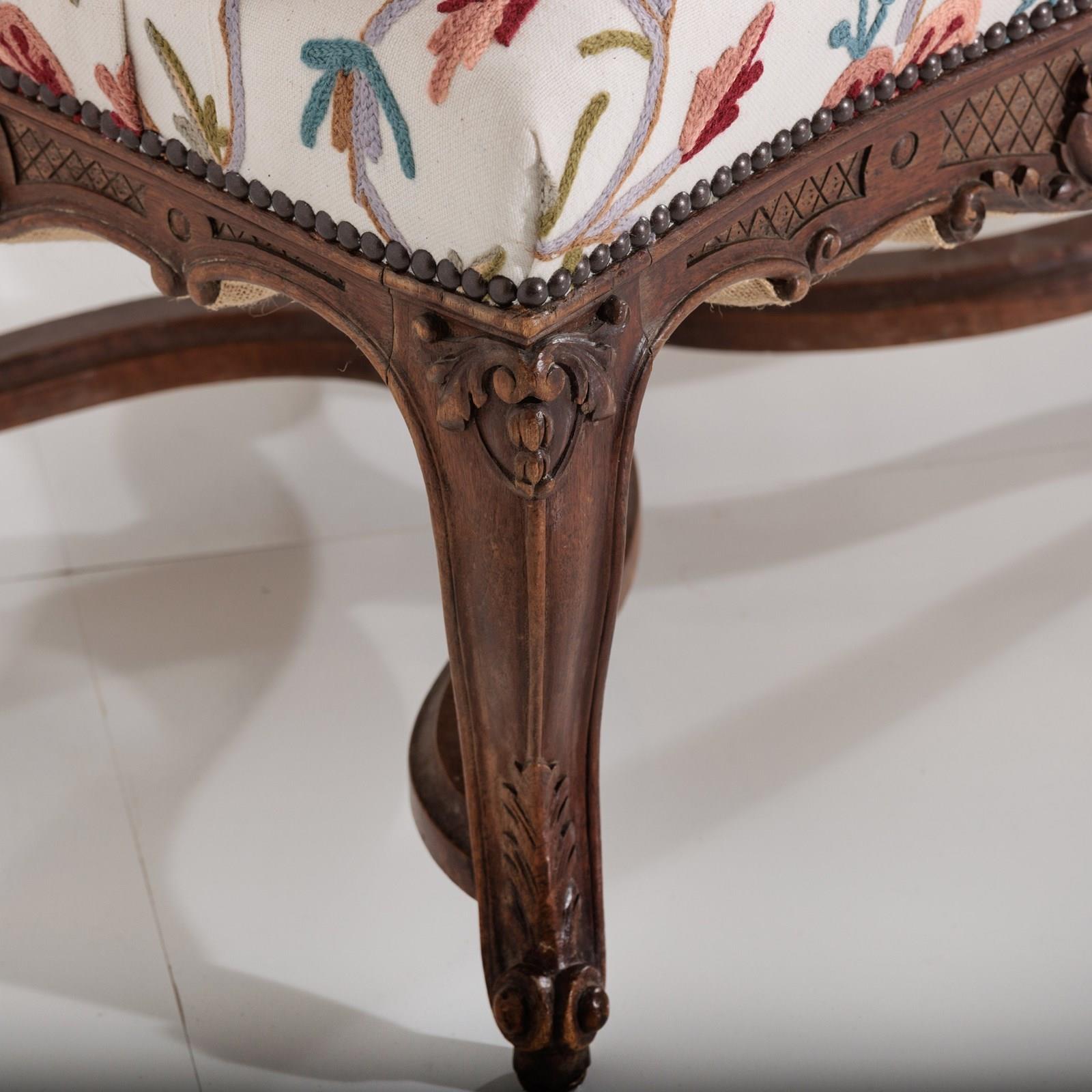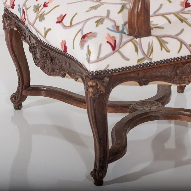 Pair of 19th Century Open armchairs with X stretcher. Recently Reupholstered in vintage crewel work fabric. France, Circa 1880.