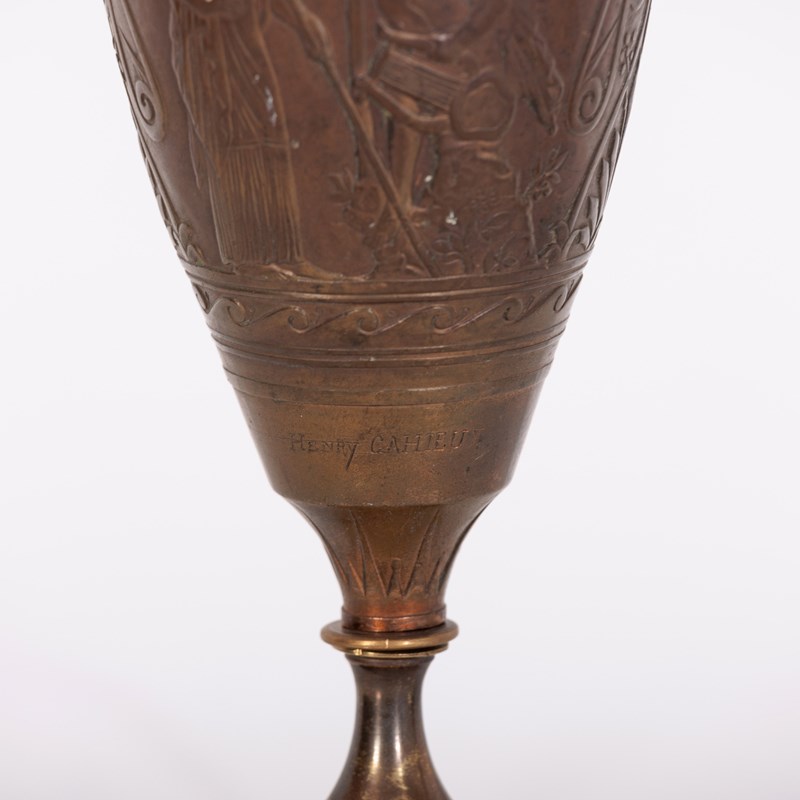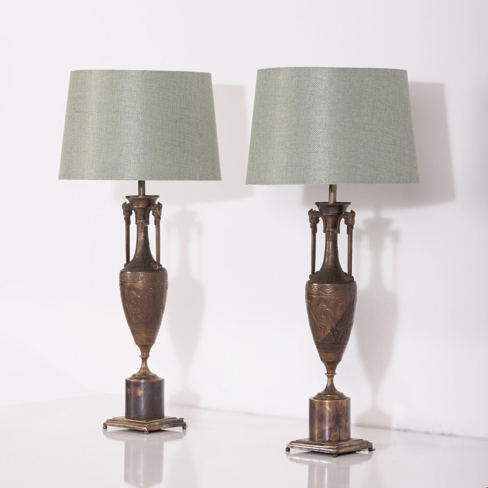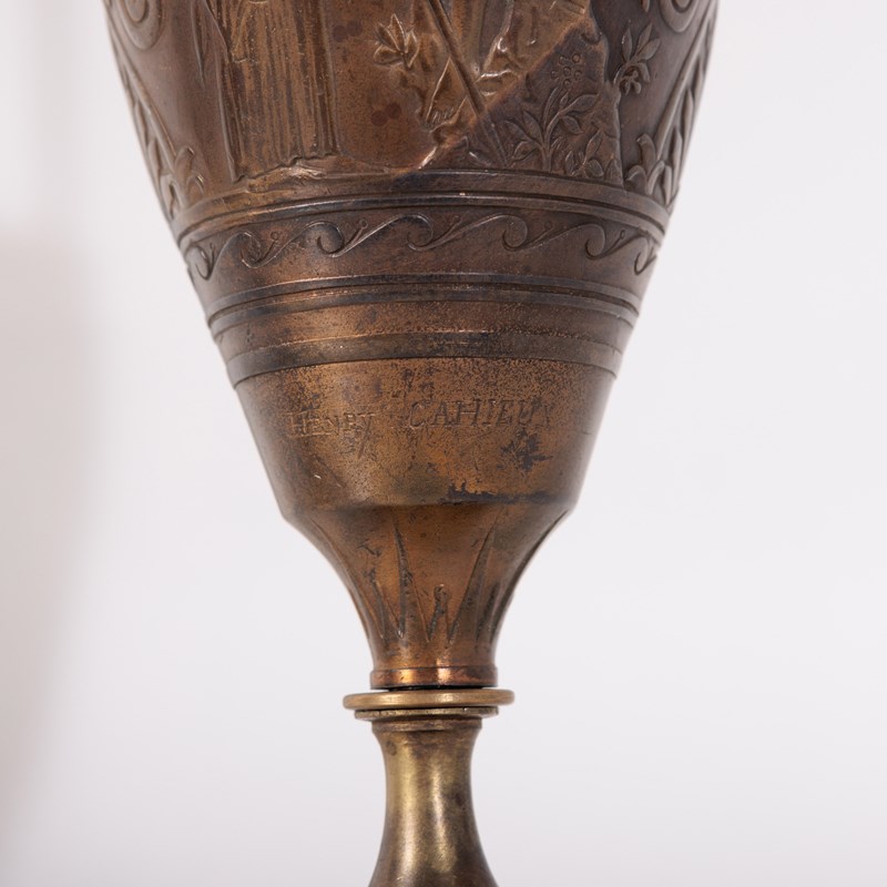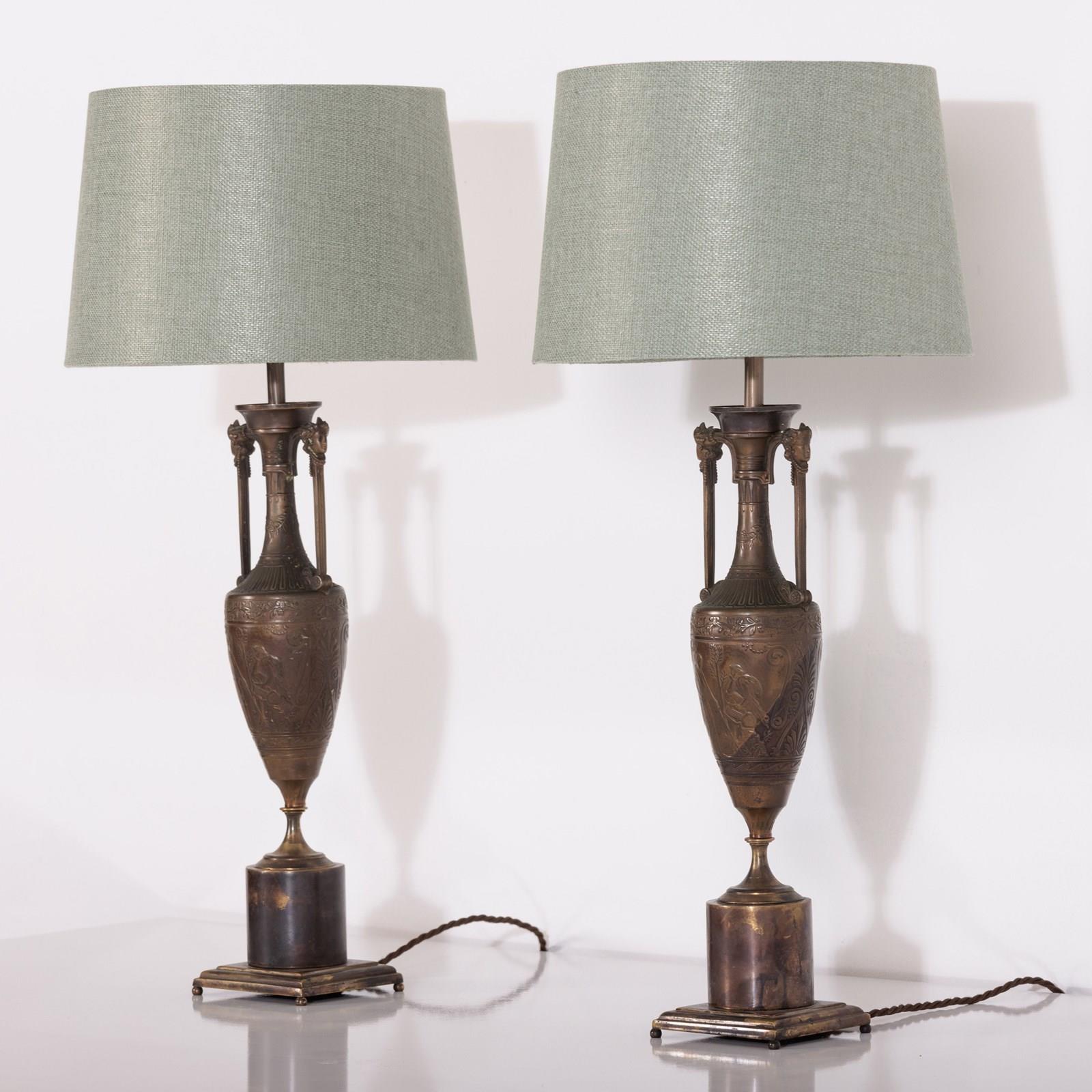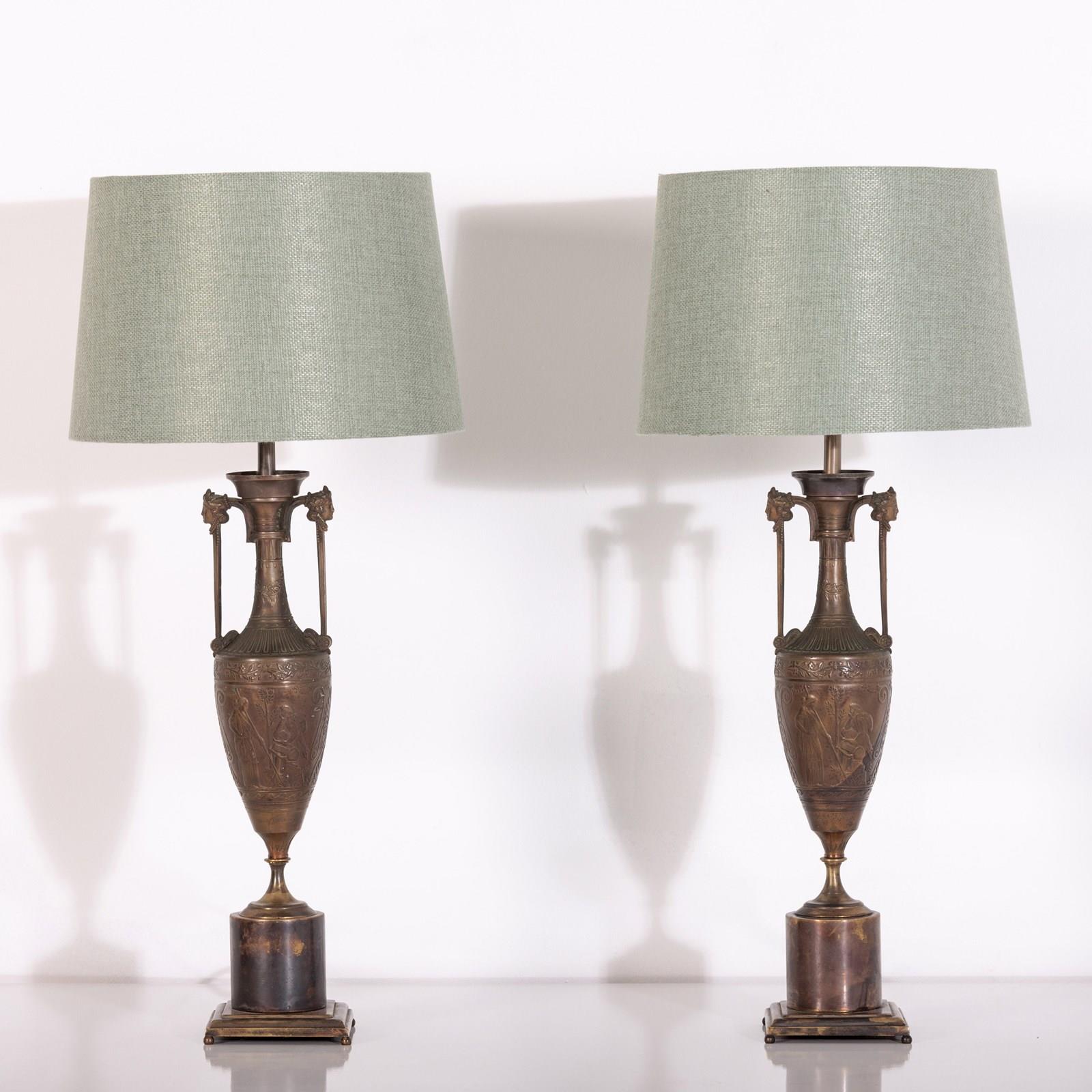 A Pair of Néo-Grec Grand Tour Patinated Bronze Vases Mounted as Lamps, Cast by Ferdinand Barbedienne from a Model by Henry Cahieux. Each vase features herm-headed handles framing a slender, elongated neck above a tapering body finely relief-cast with classical figures and anthemion motifs, set on square bases and later adapted to be mounted as lamps. Signed 'F. BARBEDIENNE FONDEUR' and 'HENRY CAHIEUX', this model was exhibited by Barbedienne at the 1855 Paris Exposition Universelle to great acclaim, where it was praised for its refined classical inspiration. The tall, elegant form-with its flaring mouth and twin handles is derived from ancient Greek loutrophoroi, ceremonial vases used in marriage rituals. Henry Cahieux (1825-1854), a Parisian sculptor, provided Barbedienne with exclusive models in the néo-grec, Egyptian, and Japanese styles. He exhibited at the Salon from 1850 to 1853, with all his works cast by Barbedienne. As lamps, Rewired and PAT tested. Circa 1850.