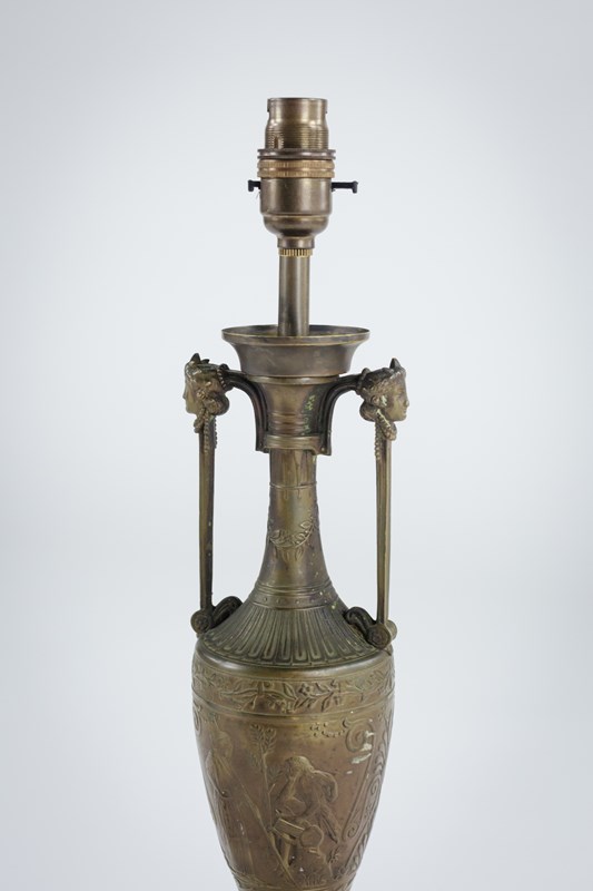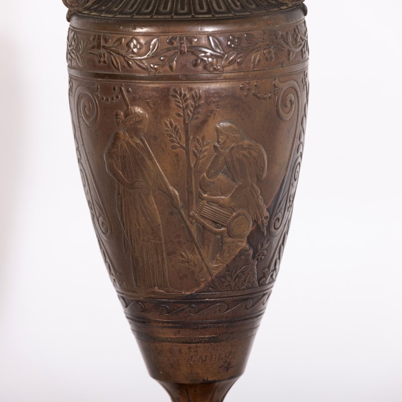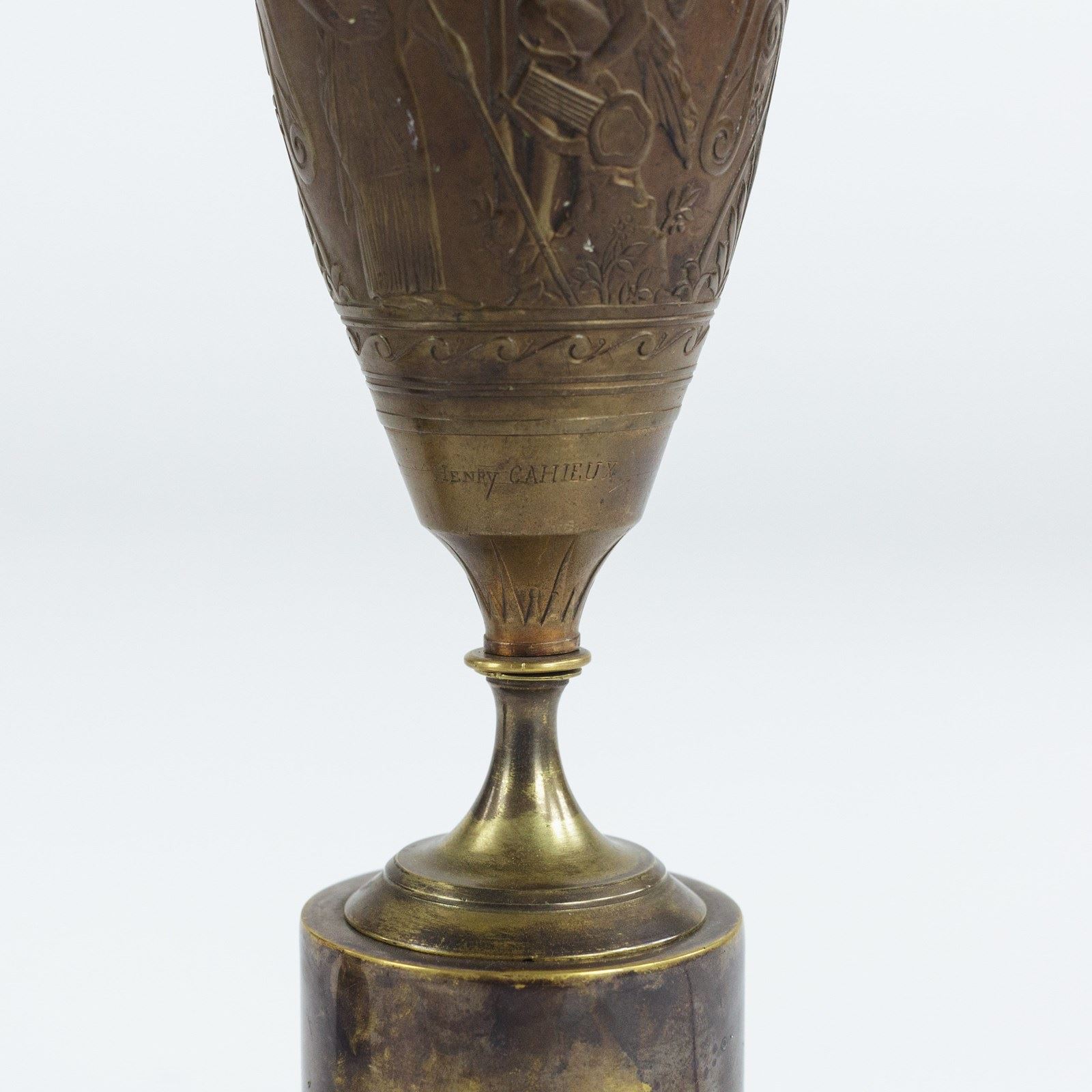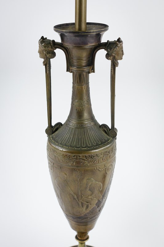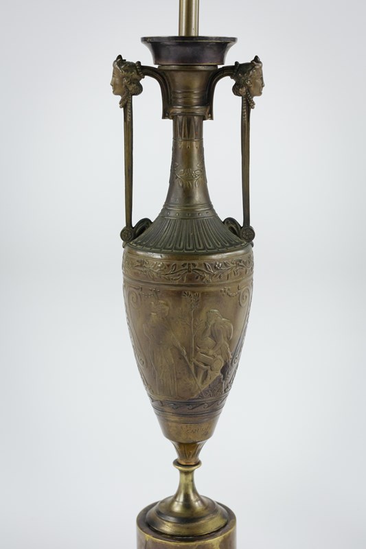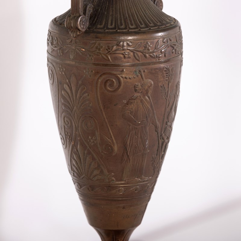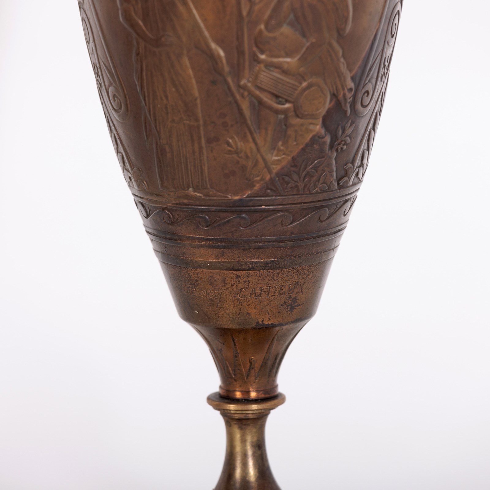 A Pair of Néo-Grec Grand Tour Patinated Bronze Vases Mounted as Lamps, Cast by Ferdinand Barbedienne from a Model by Henry Cahieux. Each vase features herm-headed handles framing a slender, elongated neck above a tapering body finely relief-cast with classical figures and anthemion motifs, set on square bases and later adapted to be mounted as lamps. Signed 'F. BARBEDIENNE FONDEUR' and 'HENRY CAHIEUX', this model was exhibited by Barbedienne at the 1855 Paris Exposition Universelle to great acclaim, where it was praised for its refined classical inspiration. The tall, elegant form-with its flaring mouth and twin handles is derived from ancient Greek loutrophoroi, ceremonial vases used in marriage rituals. Henry Cahieux (1825-1854), a Parisian sculptor, provided Barbedienne with exclusive models in the néo-grec, Egyptian, and Japanese styles. He exhibited at the Salon from 1850 to 1853, with all his works cast by Barbedienne. As lamps, Rewired and PAT tested. Circa 1850.