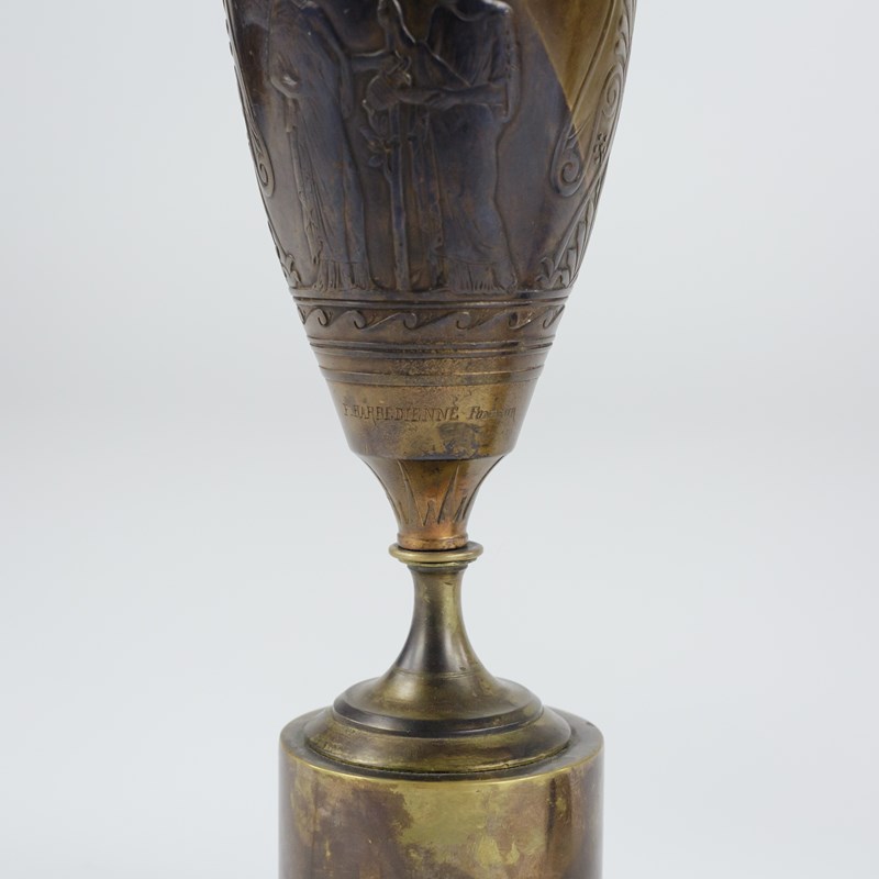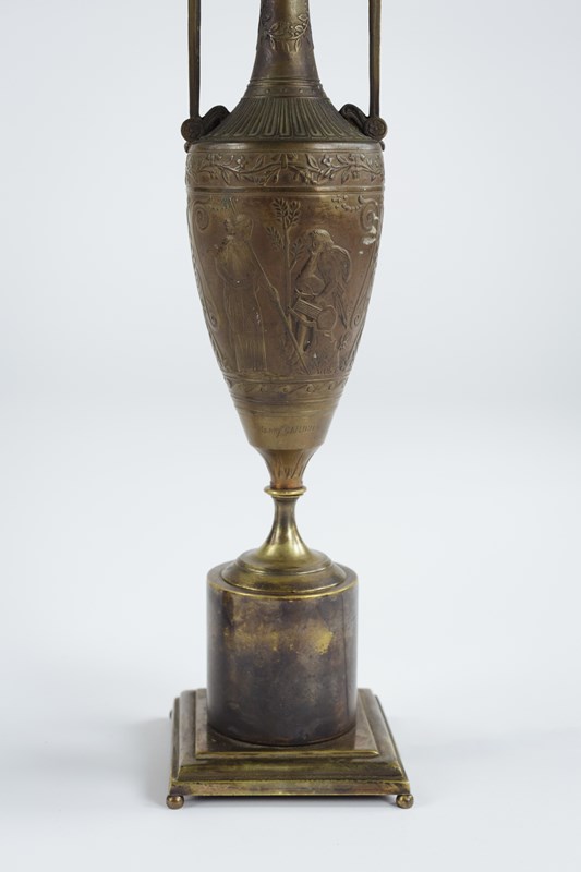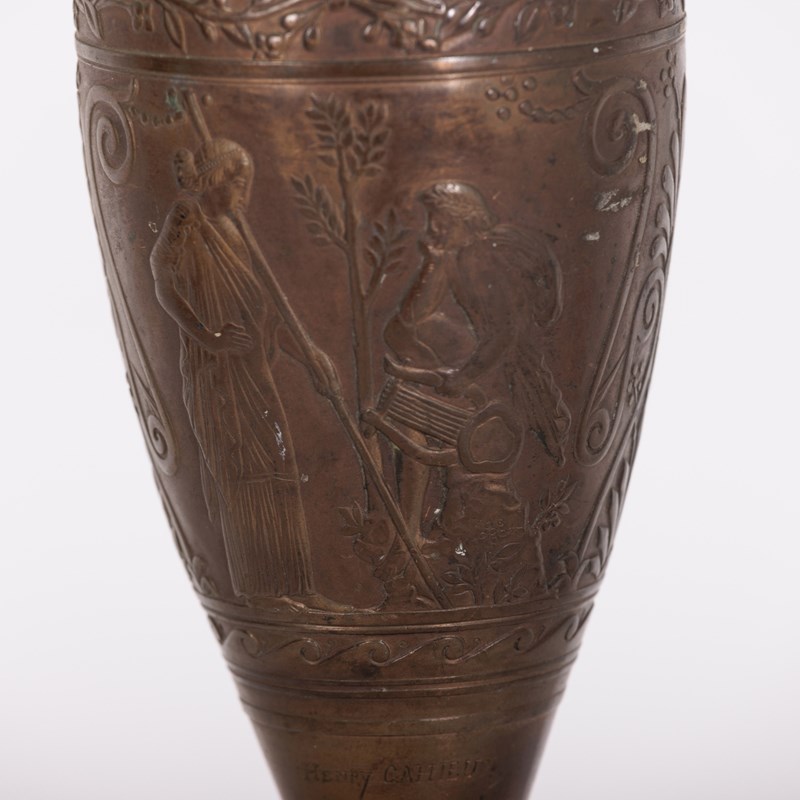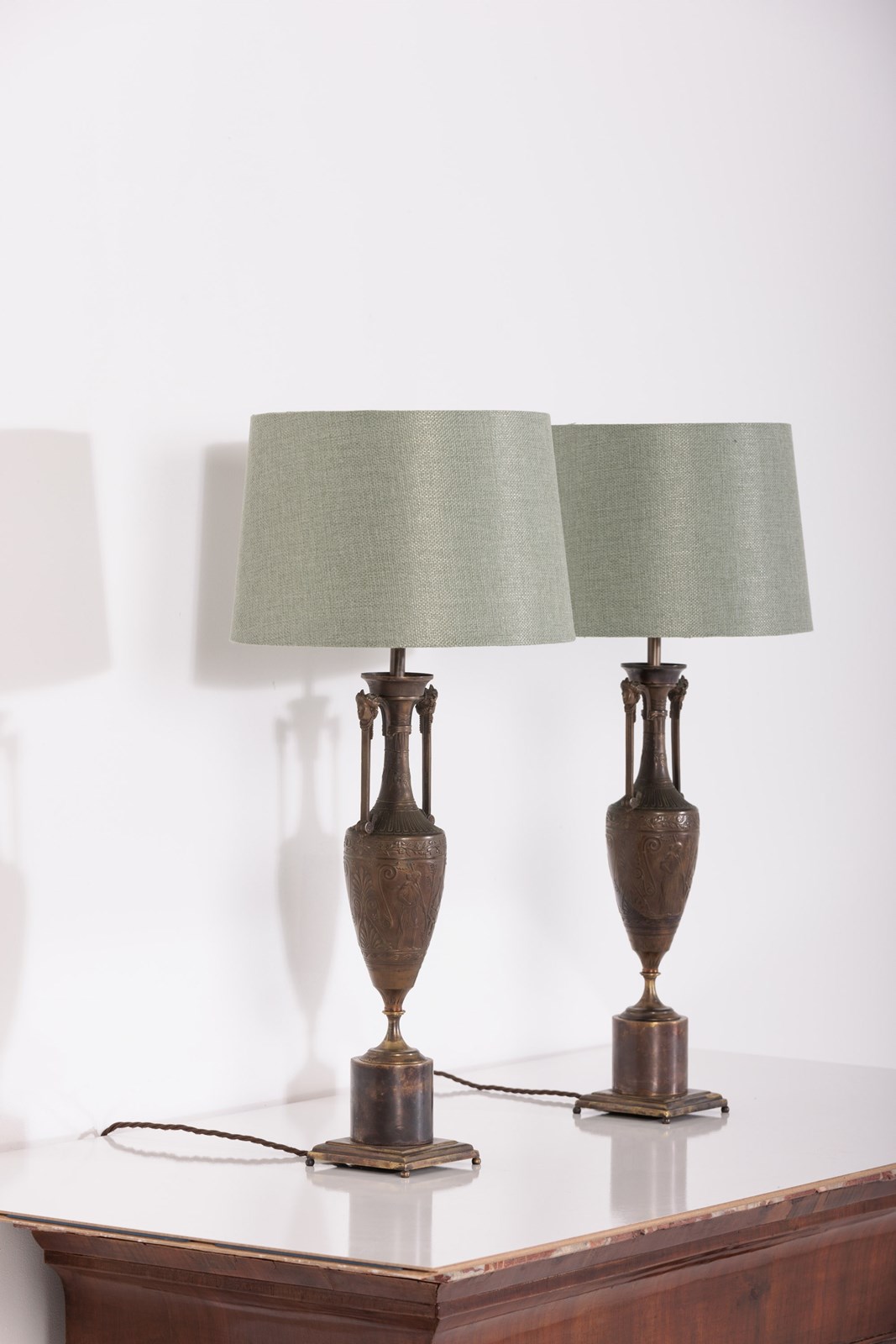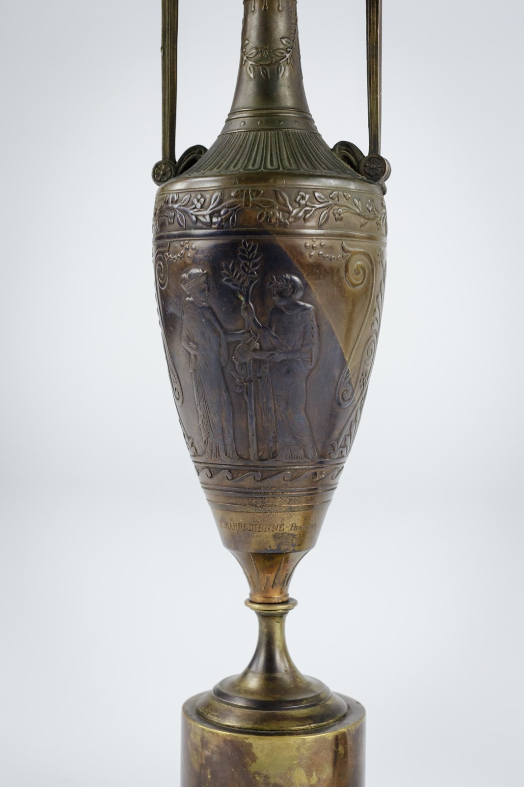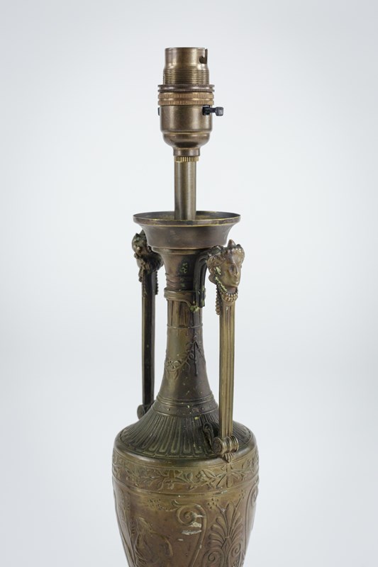A Pair of Néo-Grec Grand Tour Patinated Bronze Vases Mounted as Lamps, Cast by Ferdinand Barbedienne from a Model by Henry Cahieux. Each vase features herm-headed handles framing a slender, elongated neck above a tapering body finely relief-cast with classical figures and anthemion motifs, set on square bases and later adapted to be mounted as lamps. Signed 'F. BARBEDIENNE FONDEUR' and 'HENRY CAHIEUX', this model was exhibited by Barbedienne at the 1855 Paris Exposition Universelle to great acclaim, where it was praised for its refined classical inspiration. The tall, elegant form-with its flaring mouth and twin handles is derived from ancient Greek loutrophoroi, ceremonial vases used in marriage rituals. Henry Cahieux (1825-1854), a Parisian sculptor, provided Barbedienne with exclusive models in the néo-grec, Egyptian, and Japanese styles. He exhibited at the Salon from 1850 to 1853, with all his works cast by Barbedienne. As lamps, Rewired and PAT tested. Circa 1850.