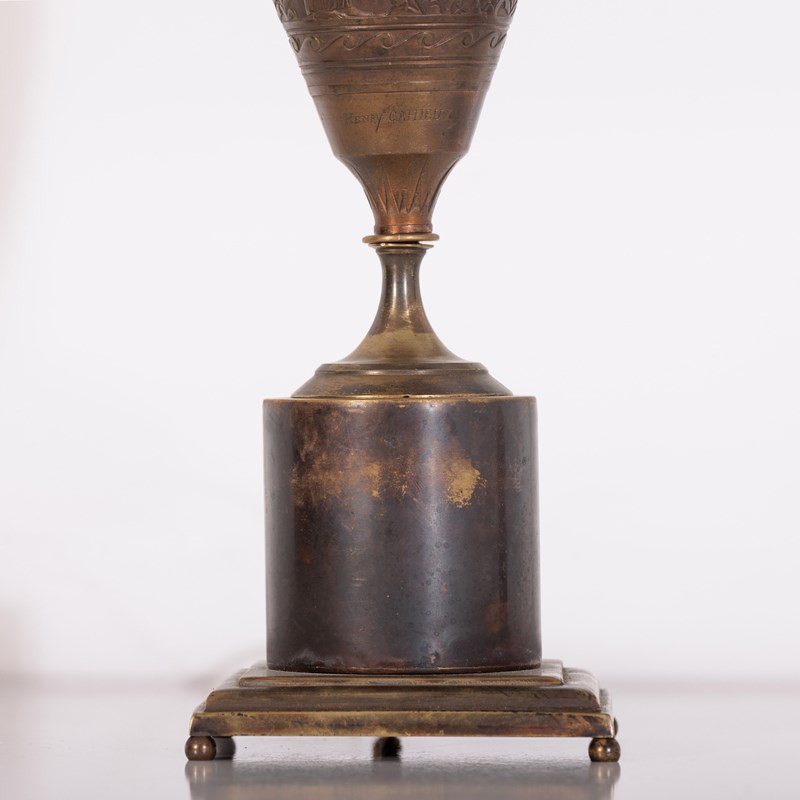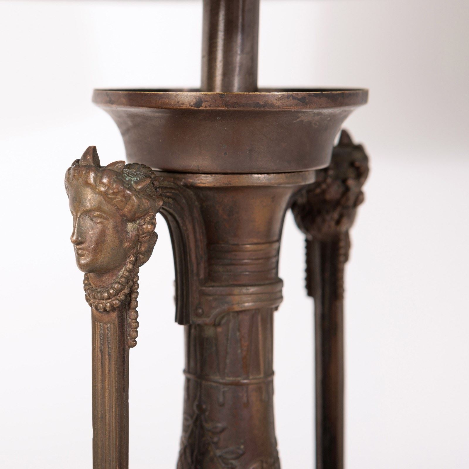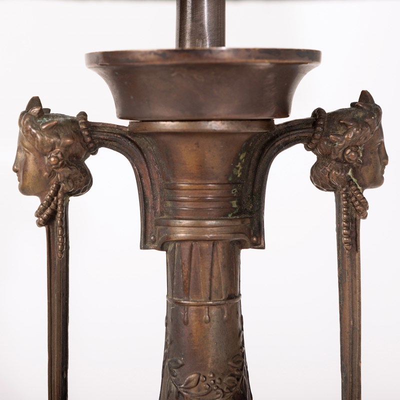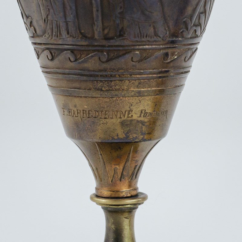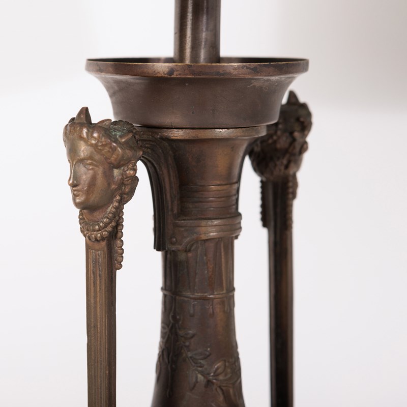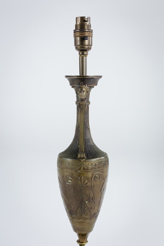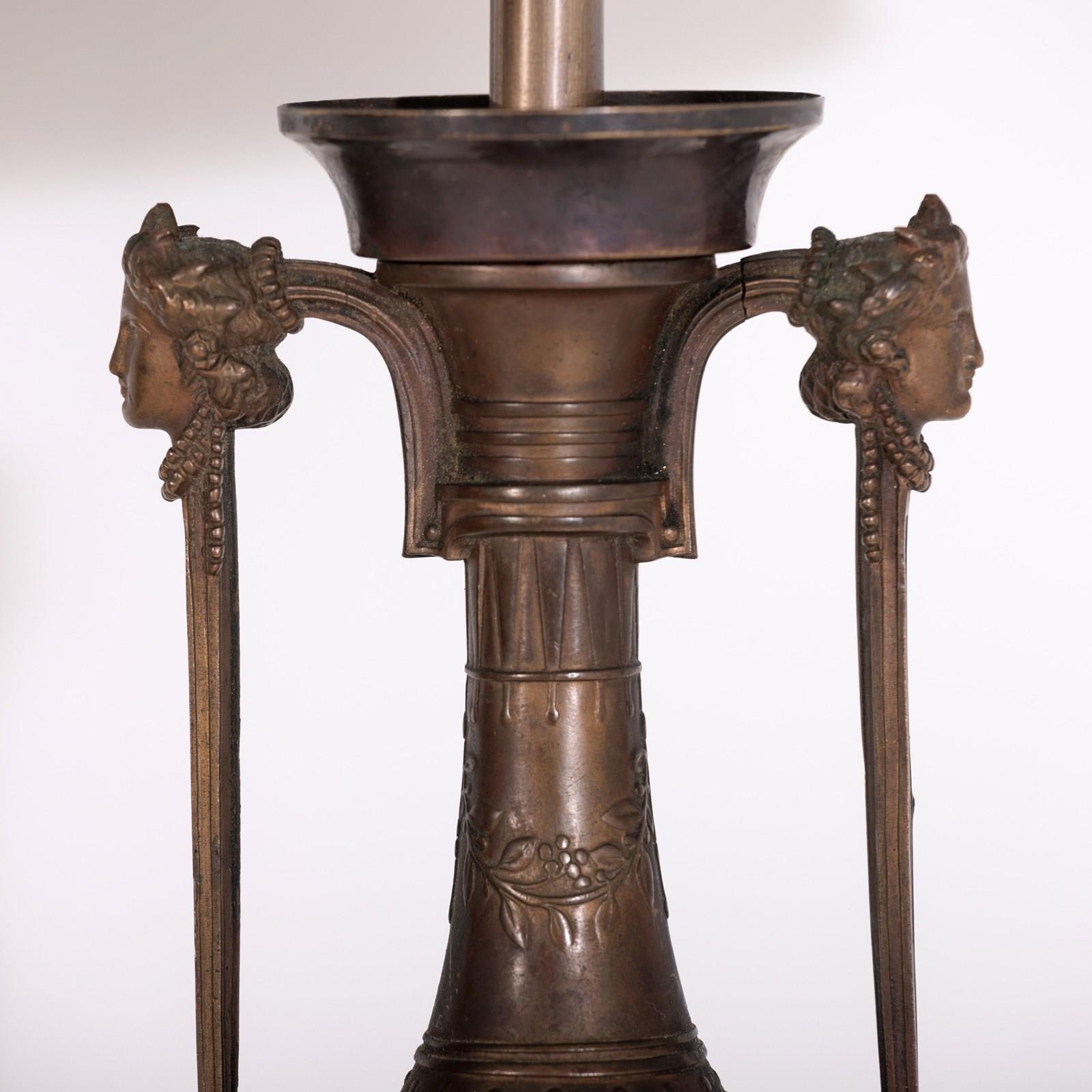 A Pair of Néo-Grec Grand Tour Patinated Bronze Vases Mounted as Lamps, Cast by Ferdinand Barbedienne from a Model by Henry Cahieux. Each vase features herm-headed handles framing a slender, elongated neck above a tapering body finely relief-cast with classical figures and anthemion motifs, set on square bases and later adapted to be mounted as lamps. Signed 'F. BARBEDIENNE FONDEUR' and 'HENRY CAHIEUX', this model was exhibited by Barbedienne at the 1855 Paris Exposition Universelle to great acclaim, where it was praised for its refined classical inspiration. The tall, elegant form-with its flaring mouth and twin handles is derived from ancient Greek loutrophoroi, ceremonial vases used in marriage rituals. Henry Cahieux (1825-1854), a Parisian sculptor, provided Barbedienne with exclusive models in the néo-grec, Egyptian, and Japanese styles. He exhibited at the Salon from 1850 to 1853, with all his works cast by Barbedienne. As lamps, Rewired and PAT tested. Circa 1850.