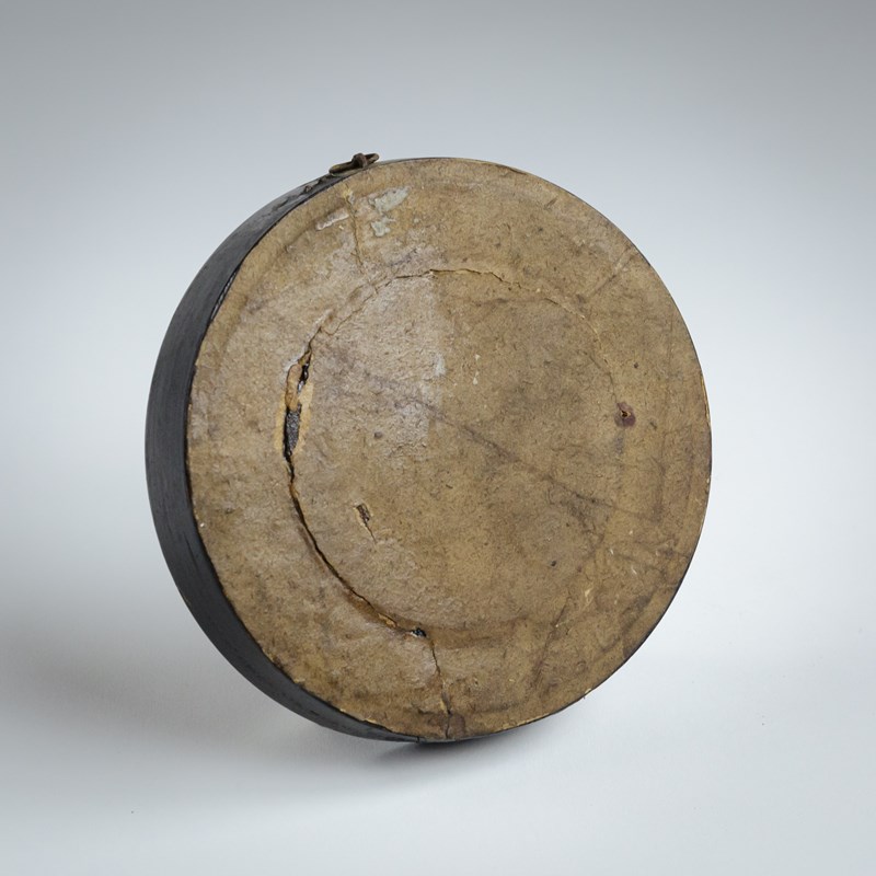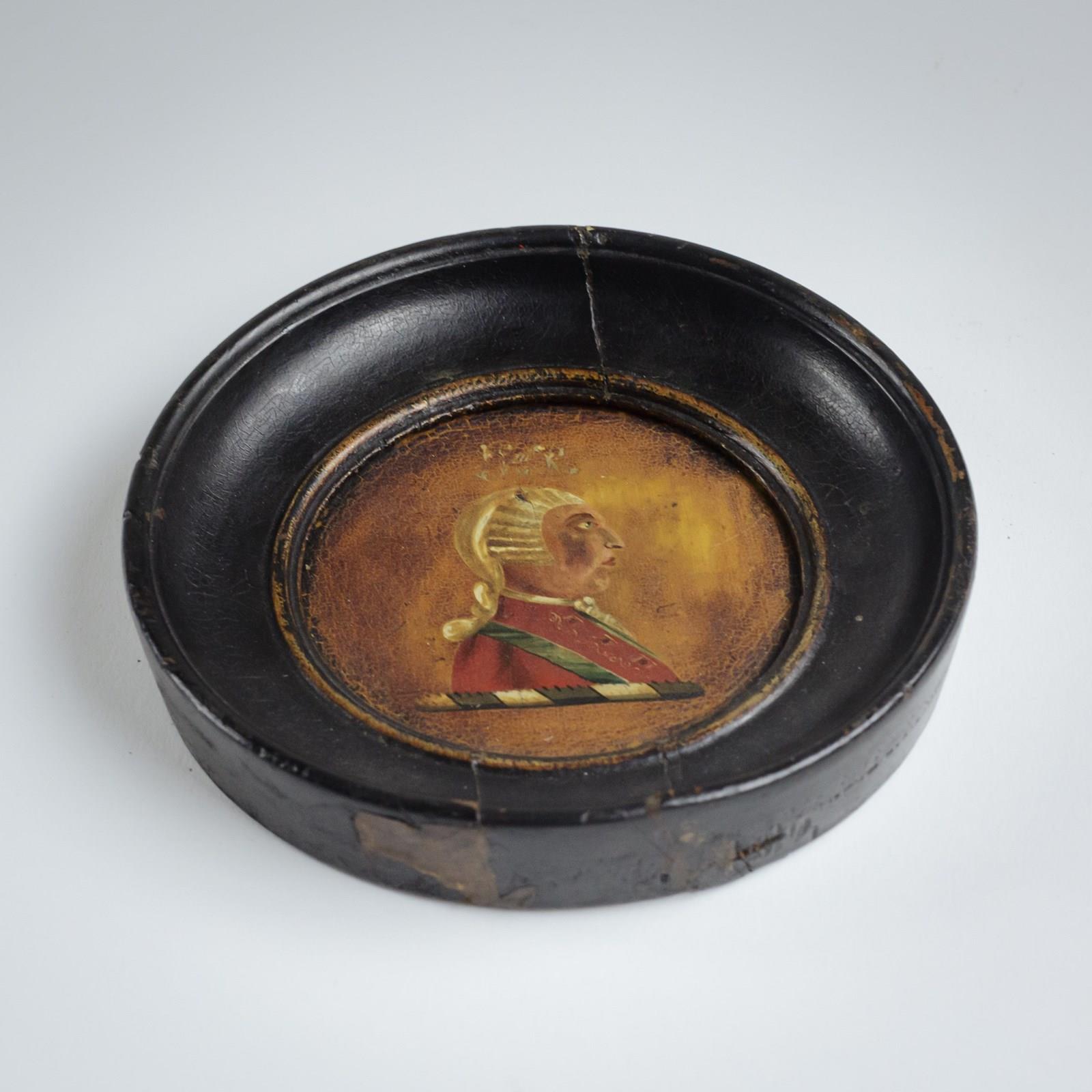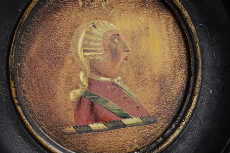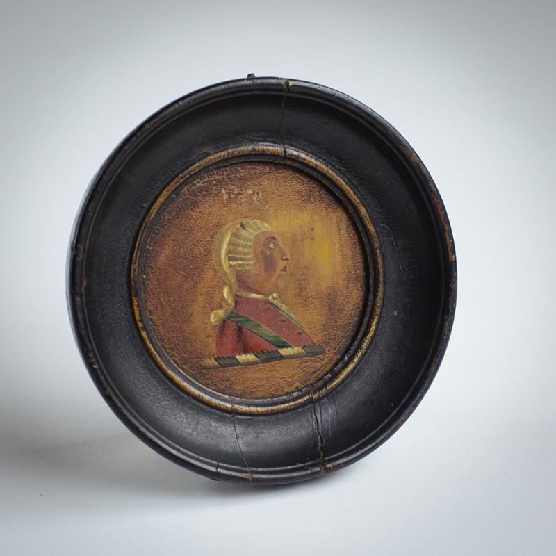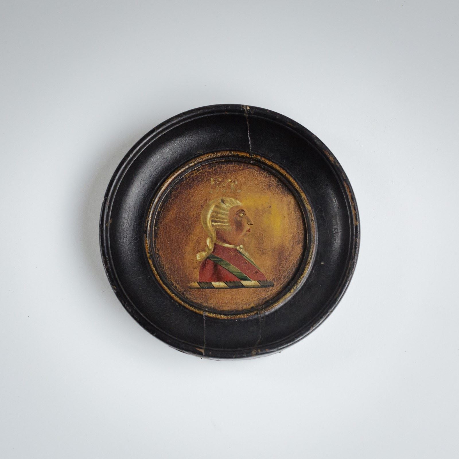 This small oil on board portrait presents a profile of King George III (1738 - 1820). rendered in a simplified yet striking manner typical of vernacular British portrait miniatures of the late Georgian era. In right facing profile, wearing a powdered wig and red military coat adorned with a dark blue sash. Untouched with cracquelure. Artist:- Unknown Date:- Late 18th Century Medium:- Oil on Board Titled :- "GR III"