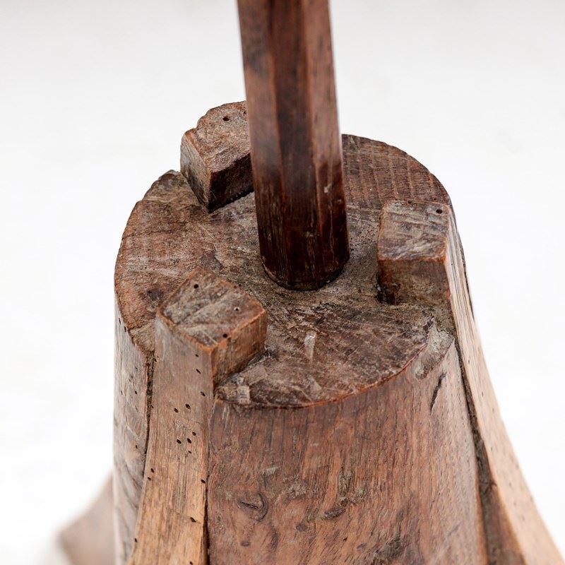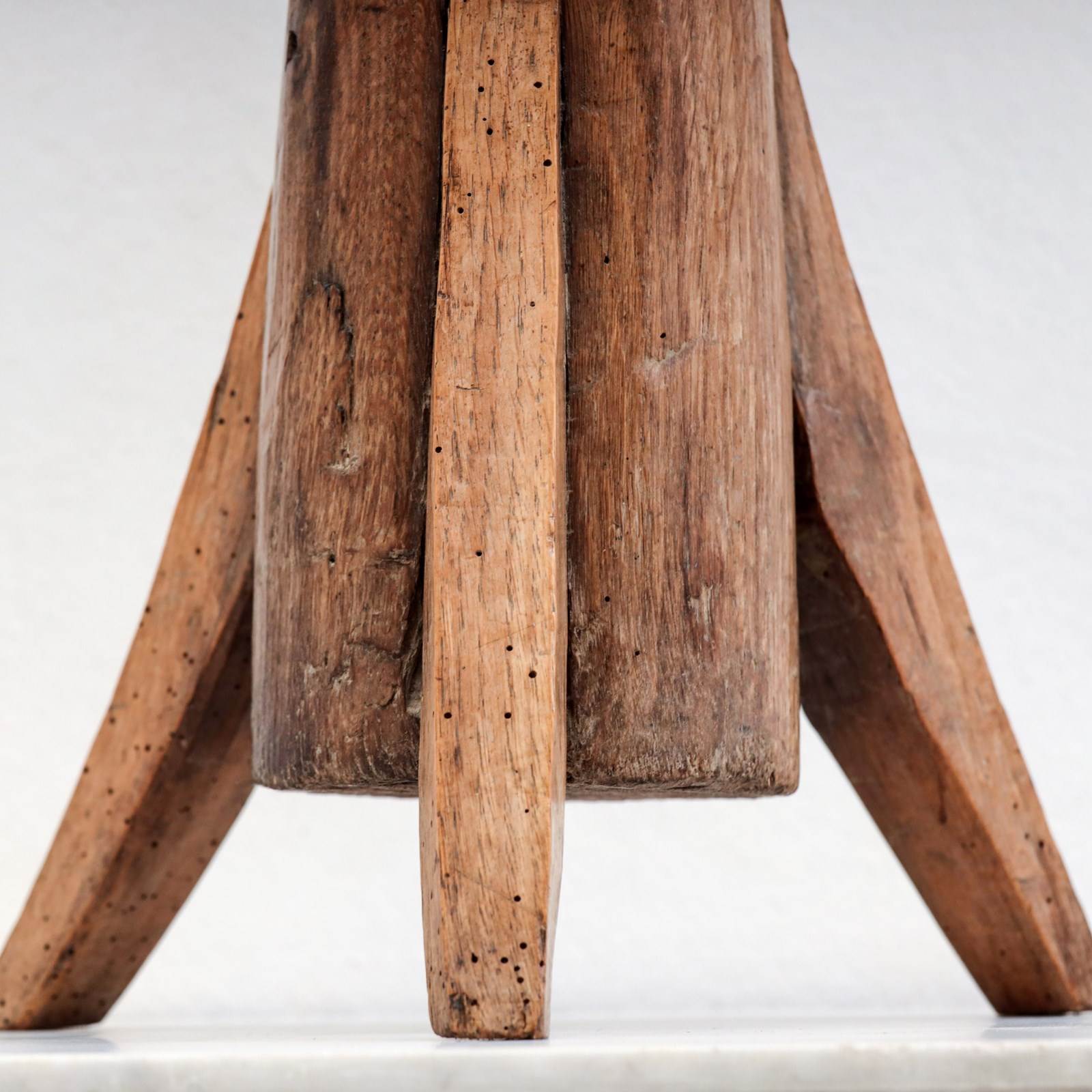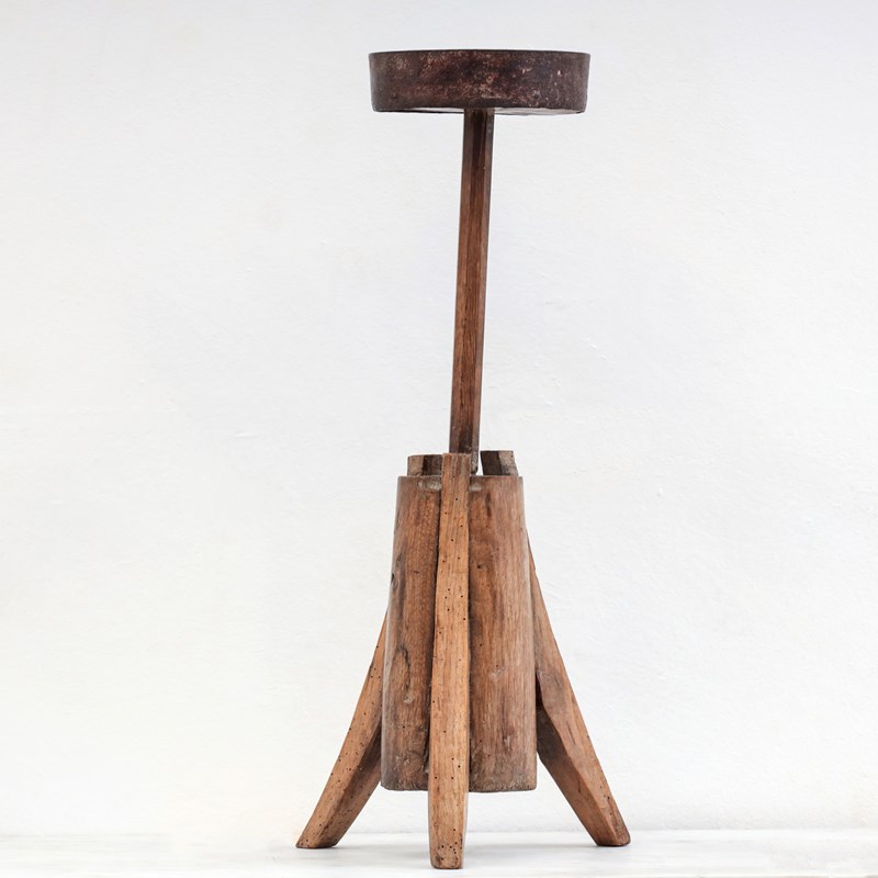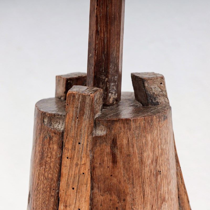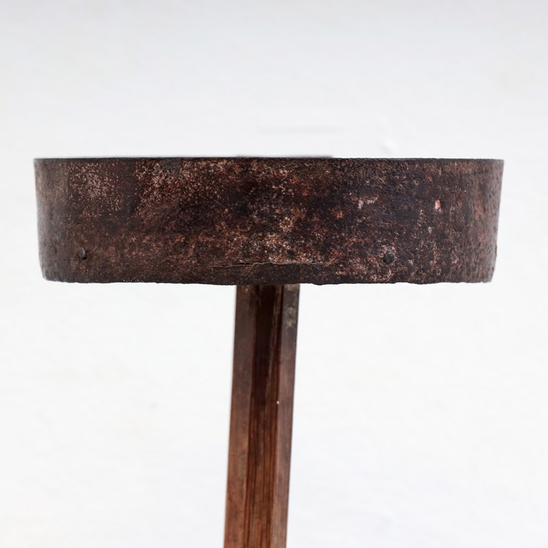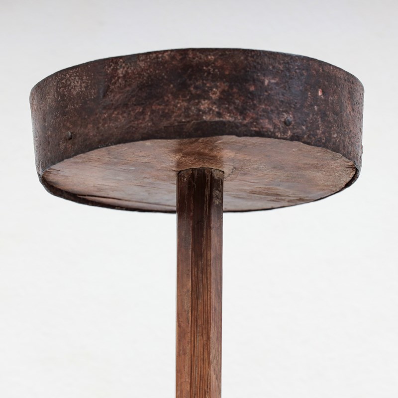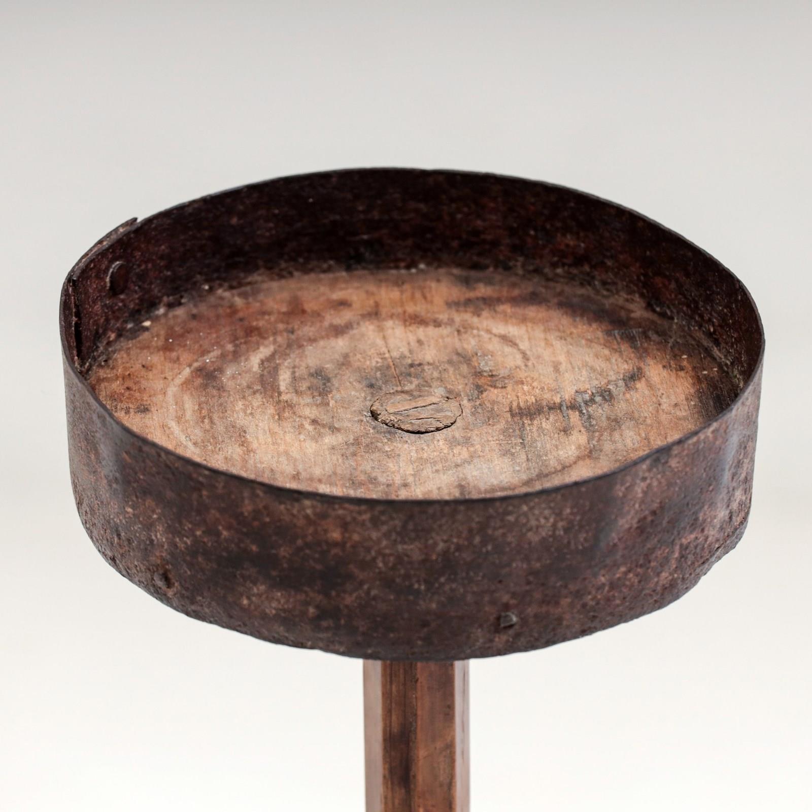 Primitive late 18th century candlestand. Weighted heavy base with three applied splayed legs. Fixed top on a stem with wrought iron lip. Evidence of historical worm. Treated. Circa 1780, West Country or Wales. UK.