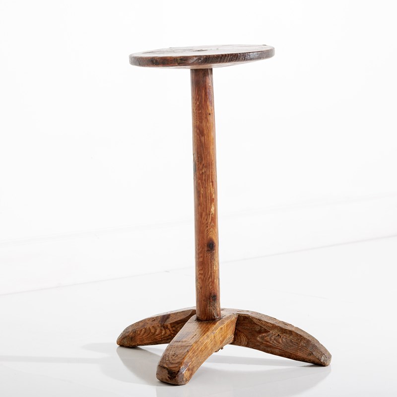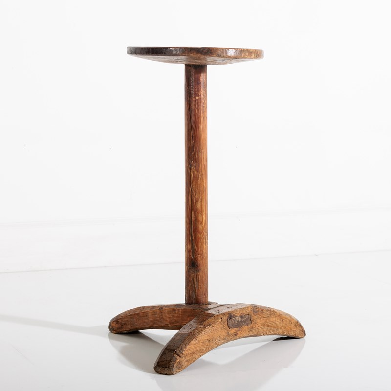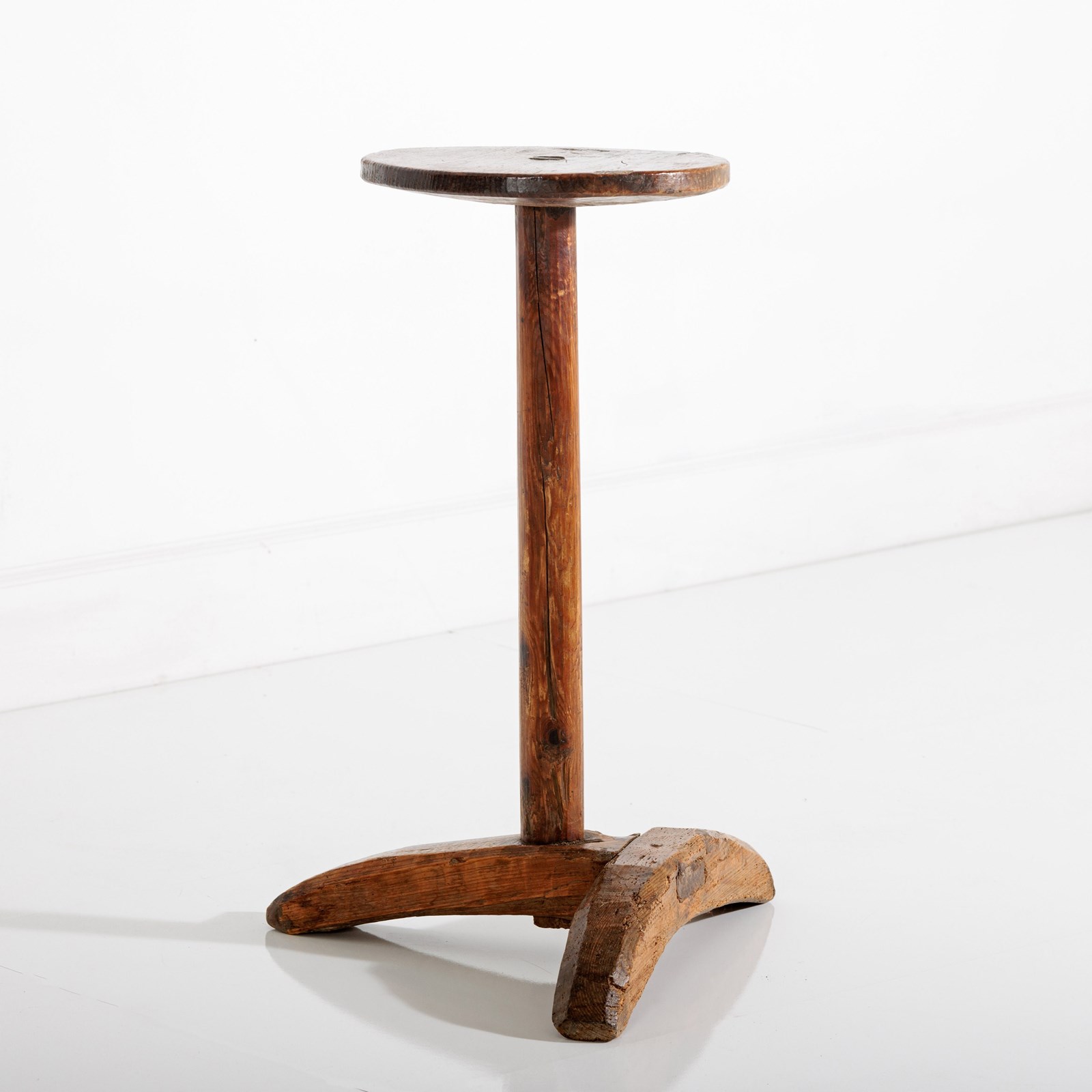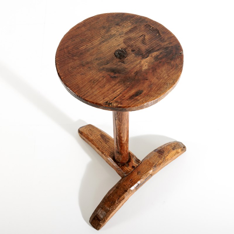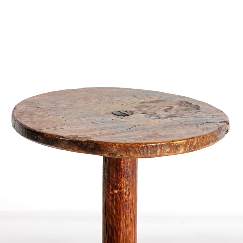 Extraordinary 18th Century Primitive Side Table. or Candle Stand Unusual T Foot mortise and tenon base. turned support, Single piece Cheese Top, through tenon. Excellent wear and patina. New England, USA. Slow Grown Pine. Circa 1780 - 1800 Diam of Top 32 cm. Similar Skinners Auction 11/08/2013 Lot 48