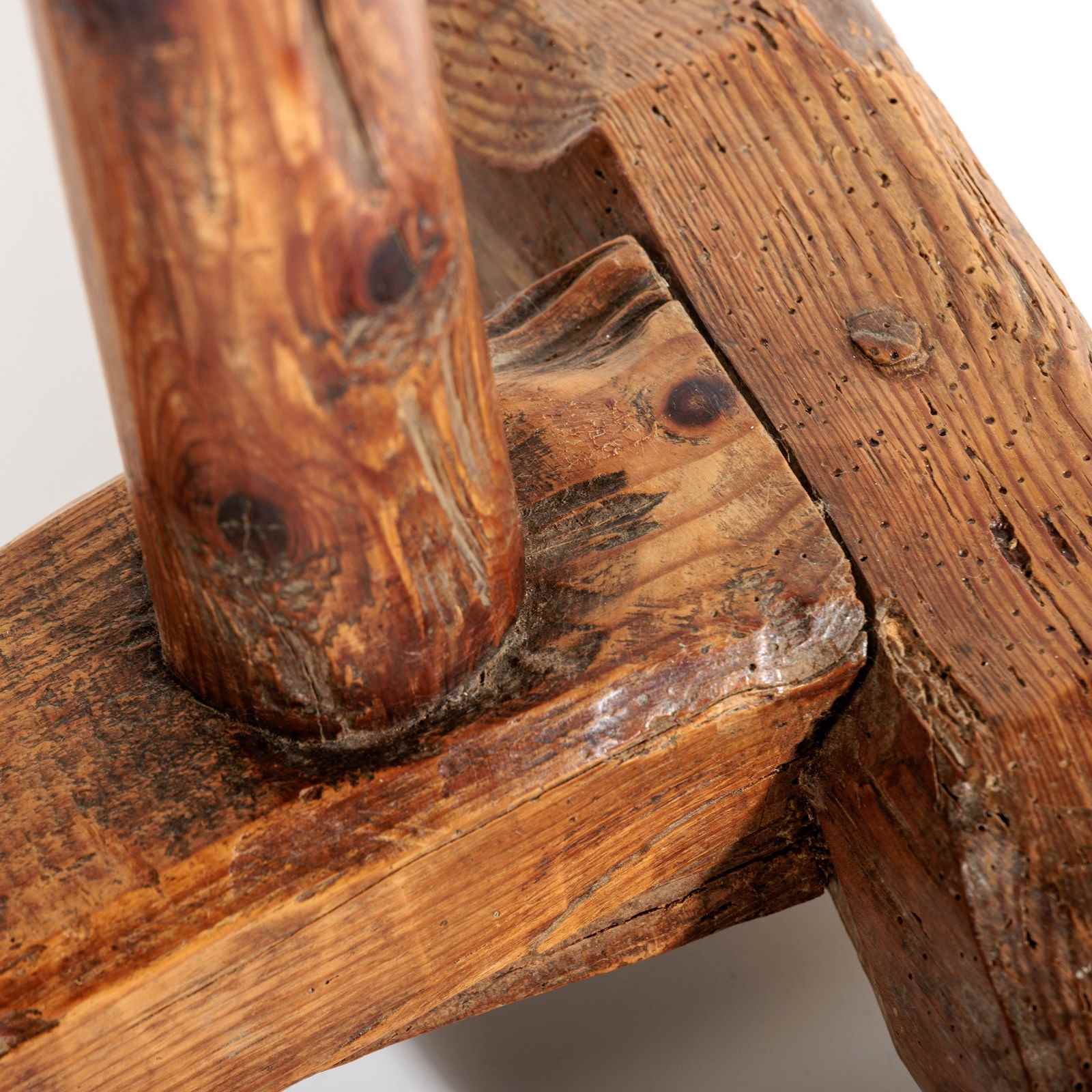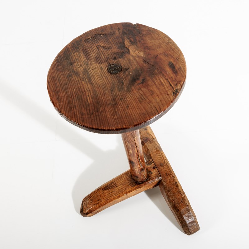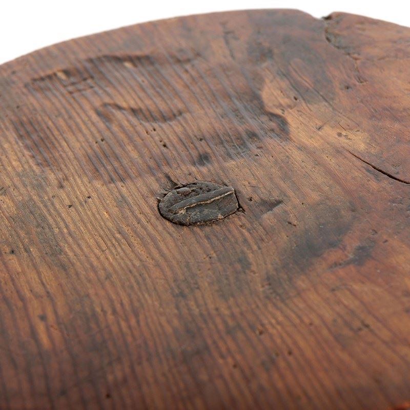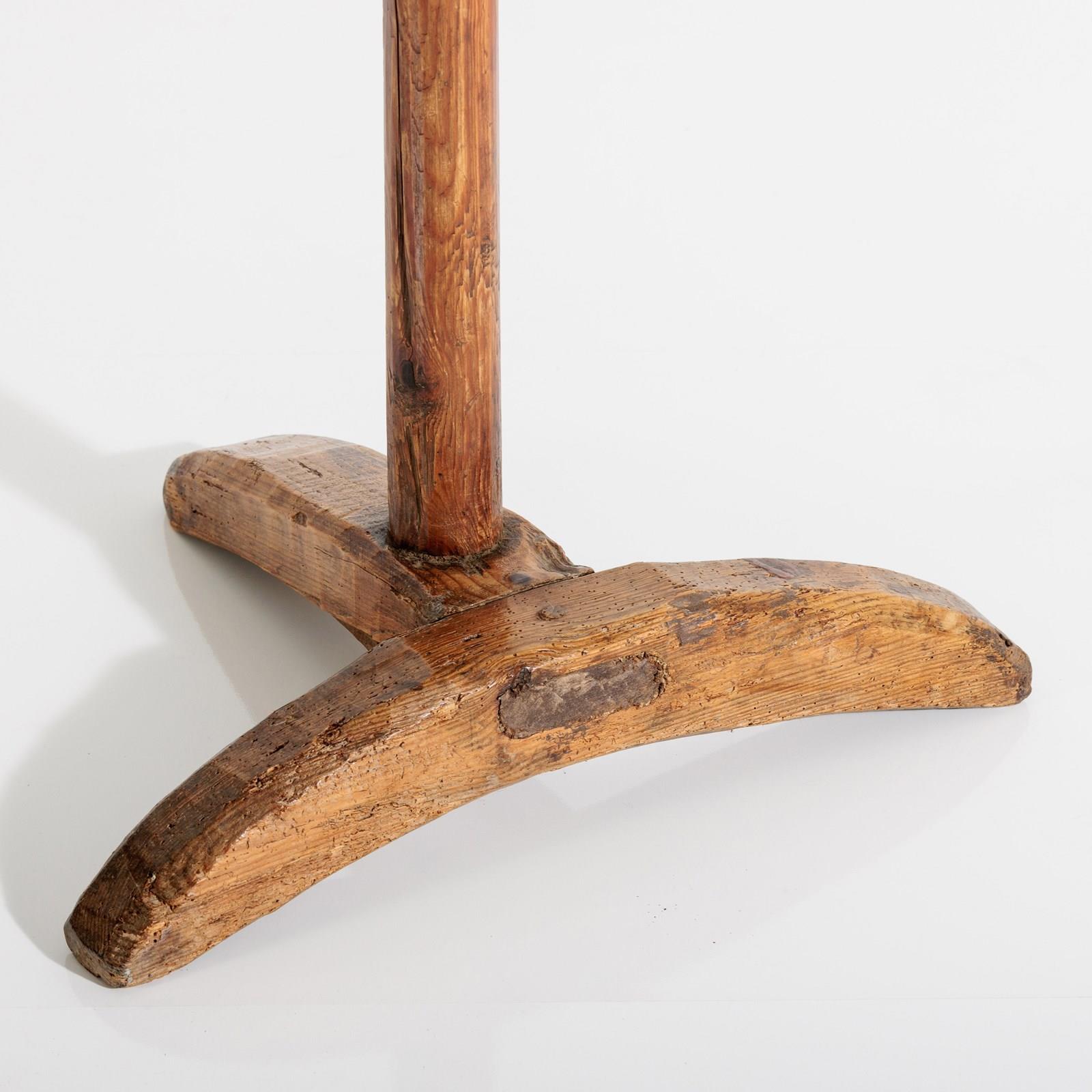 Extraordinary 18th Century Primitive Side Table. or Candle Stand Unusual T Foot mortise and tenon base. turned support, Single piece Cheese Top, through tenon. Excellent wear and patina. New England, USA. Slow Grown Pine. Circa 1780 - 1800 Diam of Top 32 cm. Similar Skinners Auction 11/08/2013 Lot 48