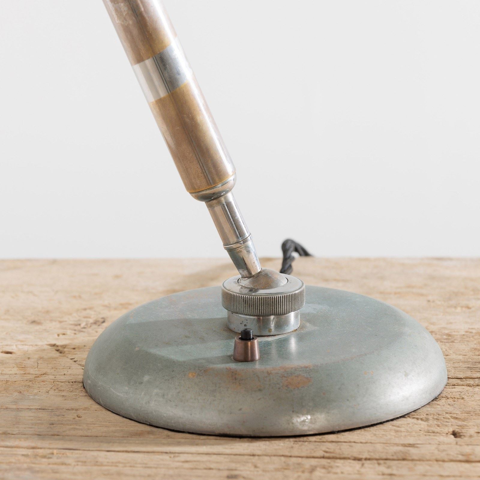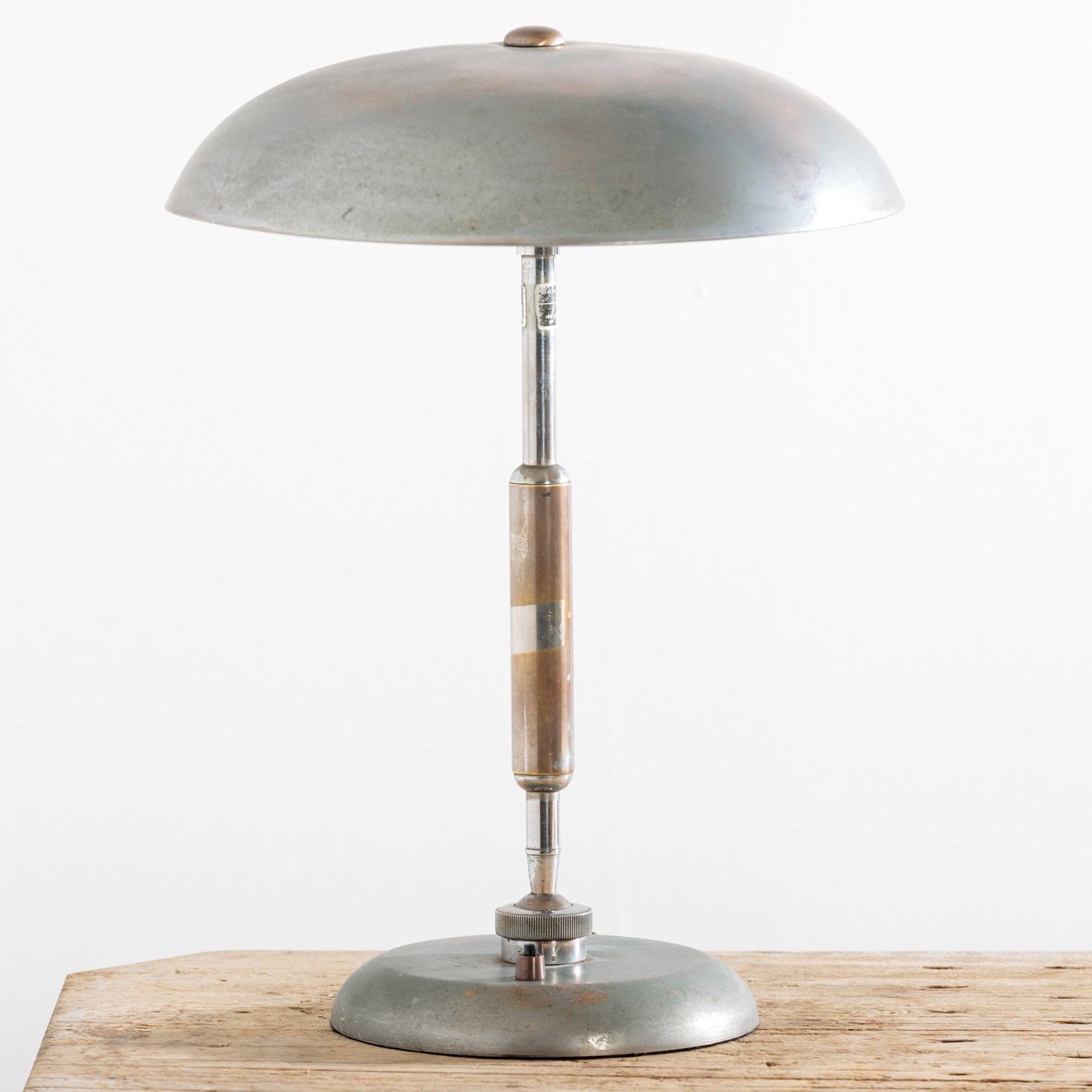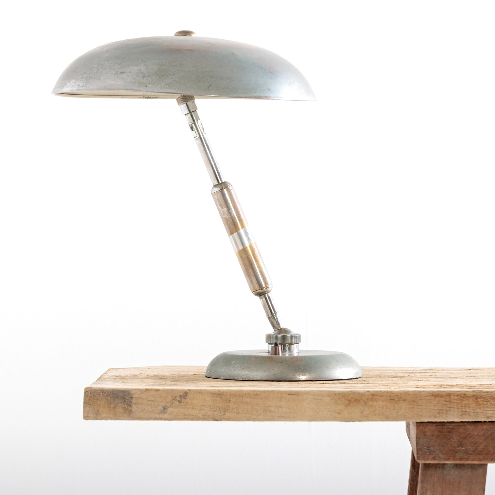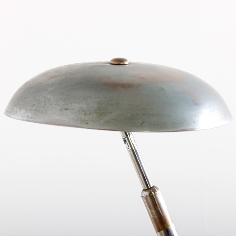 Elegant lamp designed by the architect Giovanni Michelucci and made in 1940 by Lariolux. It is a striking example of the Italian architect's mastery of form and material. The warm aged patina of the Nickel Plated brass surface exudes a rich character. Michelucci, known for blending organic shapes with modernist principles. The lamp has clearly been made with both function and artistry in mind and embodies Michelucci's ability to transform everyday items into enduring works of design. It is 360 degrees adjustable thanks to the ingenious ball joint at its base, with a simple screw mechanism to fix it in place. This example has a double bulb holder under the shade. Rewired with antique style flex and PAT tested. Italy. Circa 1940.