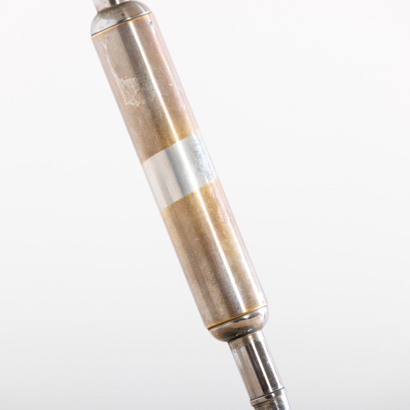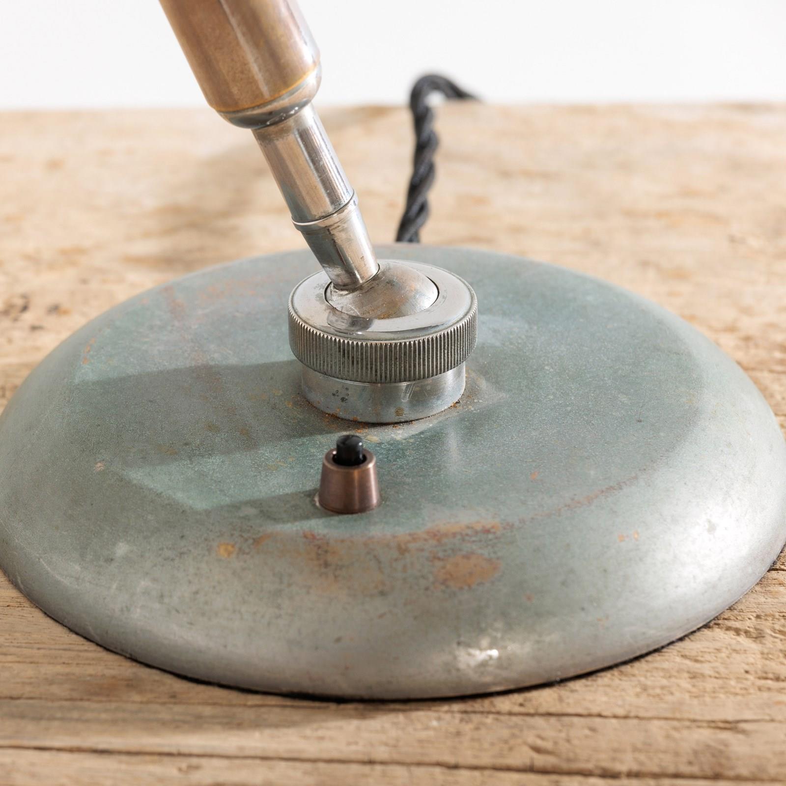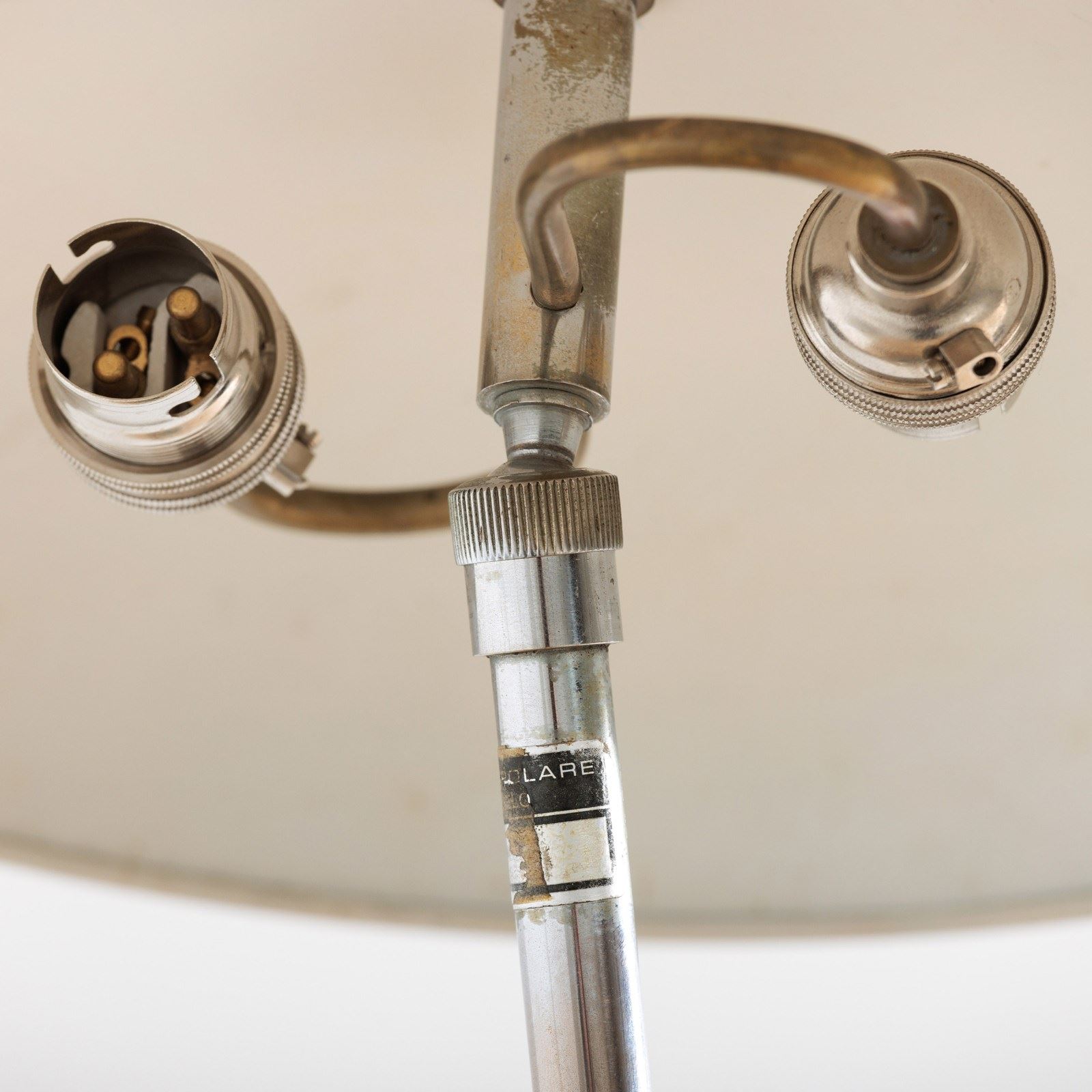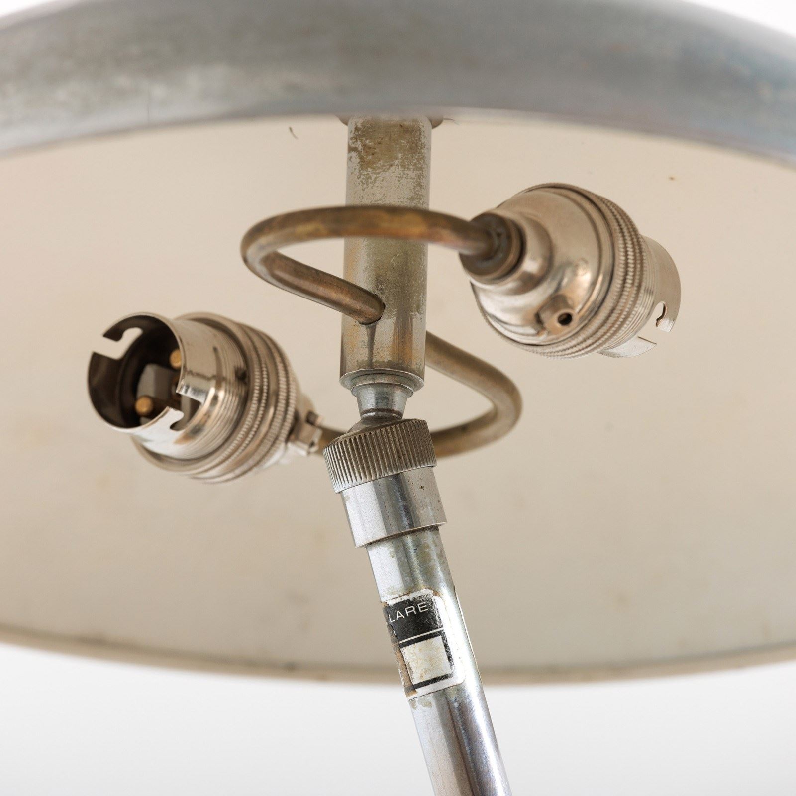 Elegant lamp designed by the architect Giovanni Michelucci and made in 1940 by Lariolux. It is a striking example of the Italian architect's mastery of form and material. The warm aged patina of the Nickel Plated brass surface exudes a rich character. Michelucci, known for blending organic shapes with modernist principles. The lamp has clearly been made with both function and artistry in mind and embodies Michelucci's ability to transform everyday items into enduring works of design. It is 360 degrees adjustable thanks to the ingenious ball joint at its base, with a simple screw mechanism to fix it in place. This example has a double bulb holder under the shade. Rewired with antique style flex and PAT tested. Italy. Circa 1940.
