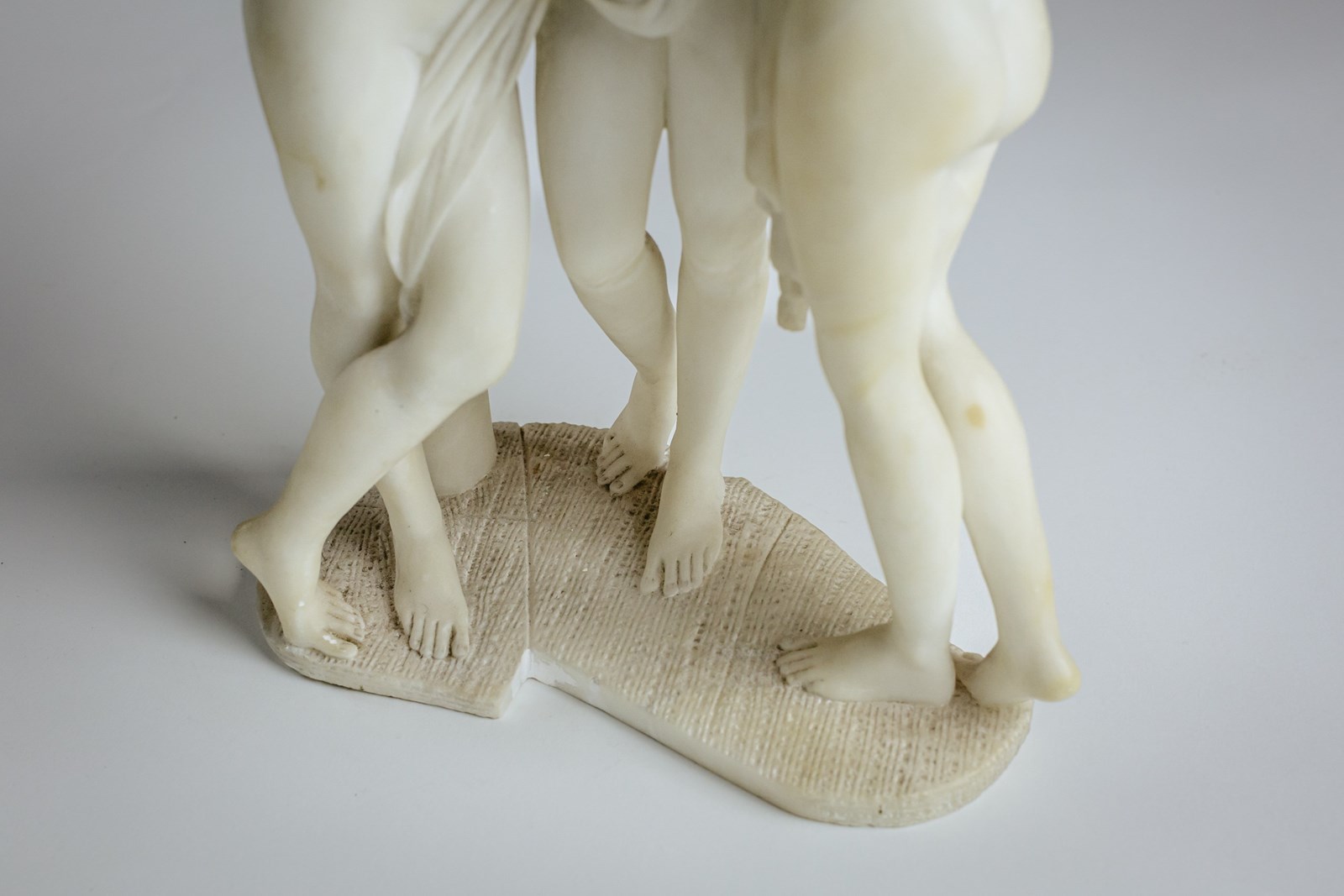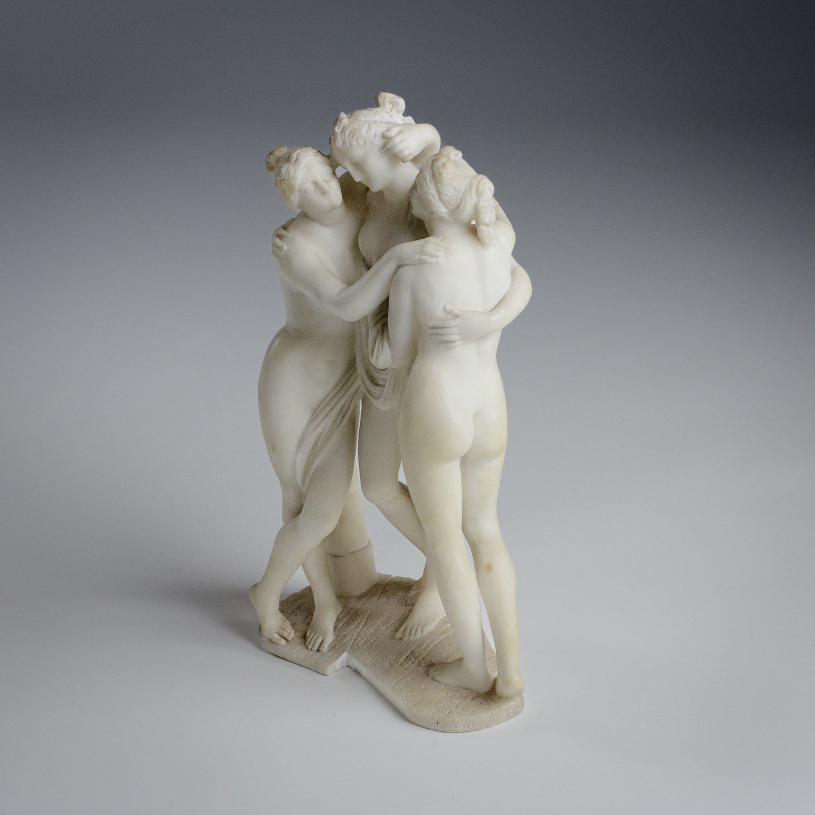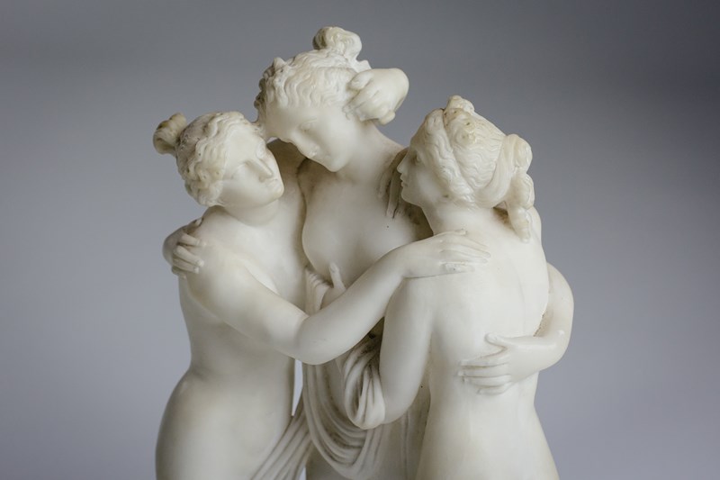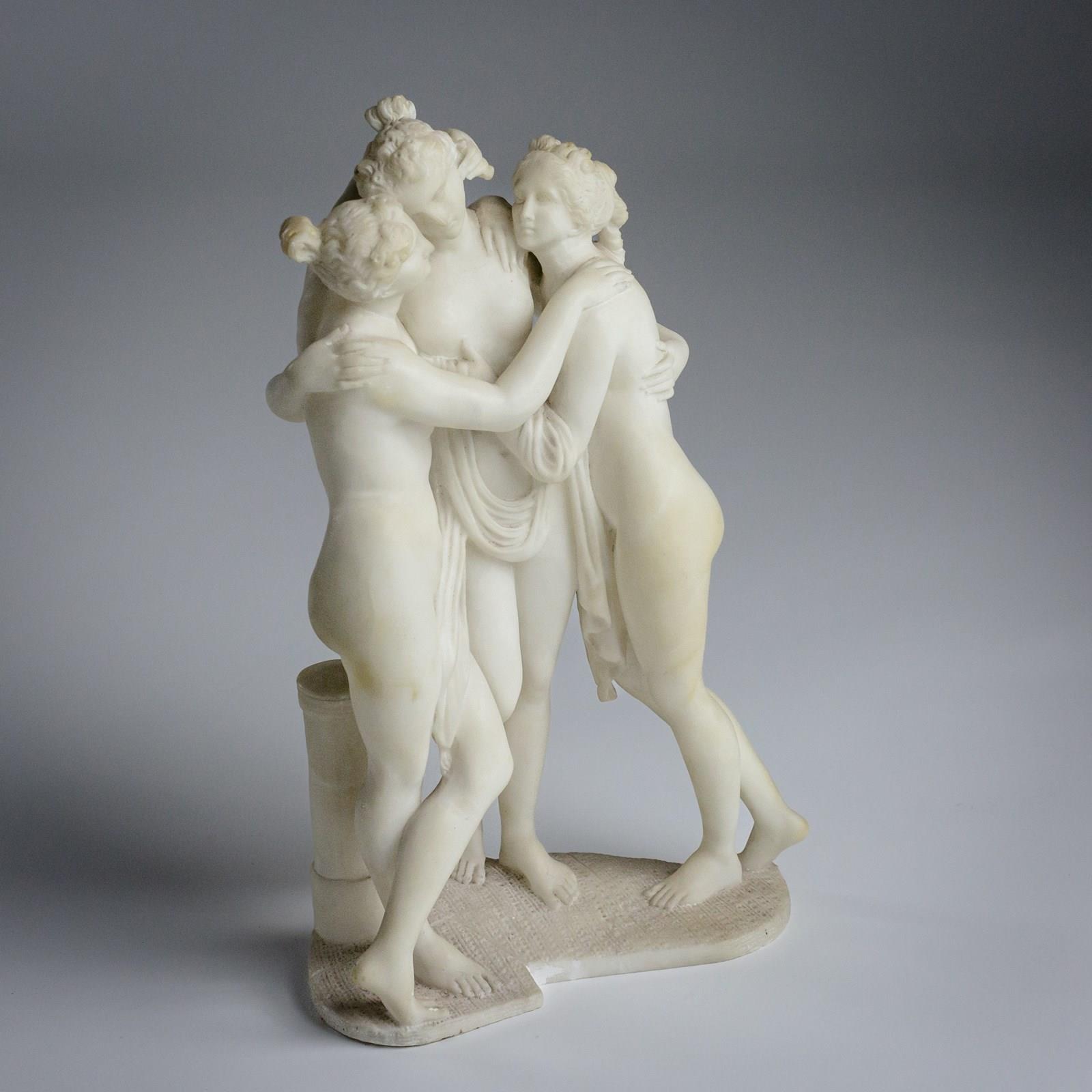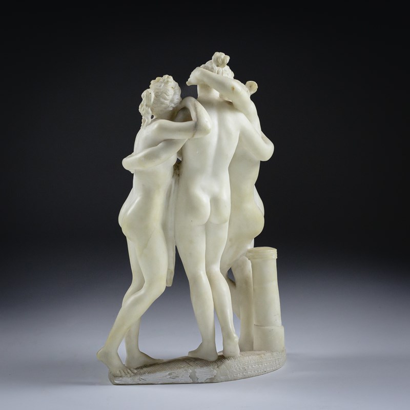 The Three Graces depicts the three daughters of Zeus, Euphrosyne, Aglaea and Thalia. Godesses of beauty, charm and joy. Shown standing close together, nude or as in this example lightly draped their bodies entwined in graceful embrace symbolising unity, love and harmony. Originating in classical Greek and Roman art the composition became beloved during the Renaissance and Neoclassical periods. Carved Marble, Early 20th Century. Condition commensurate with age. minor nibbles & discolouration. Italy.