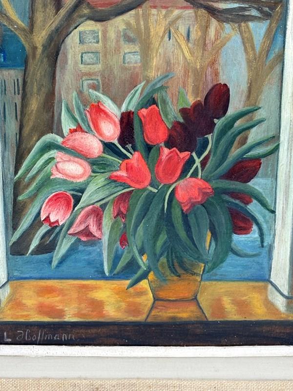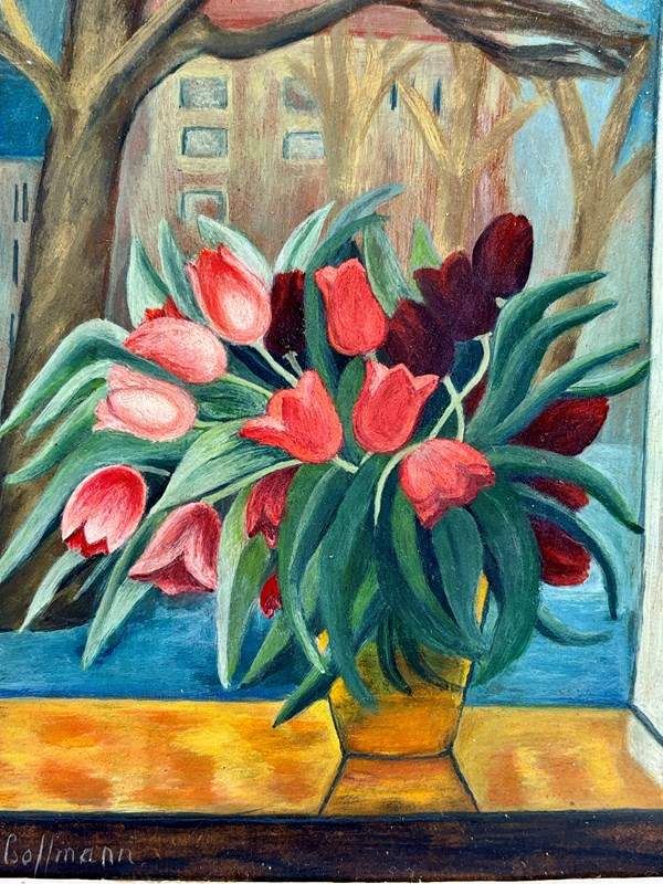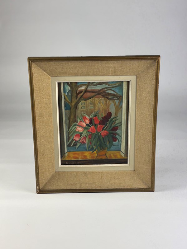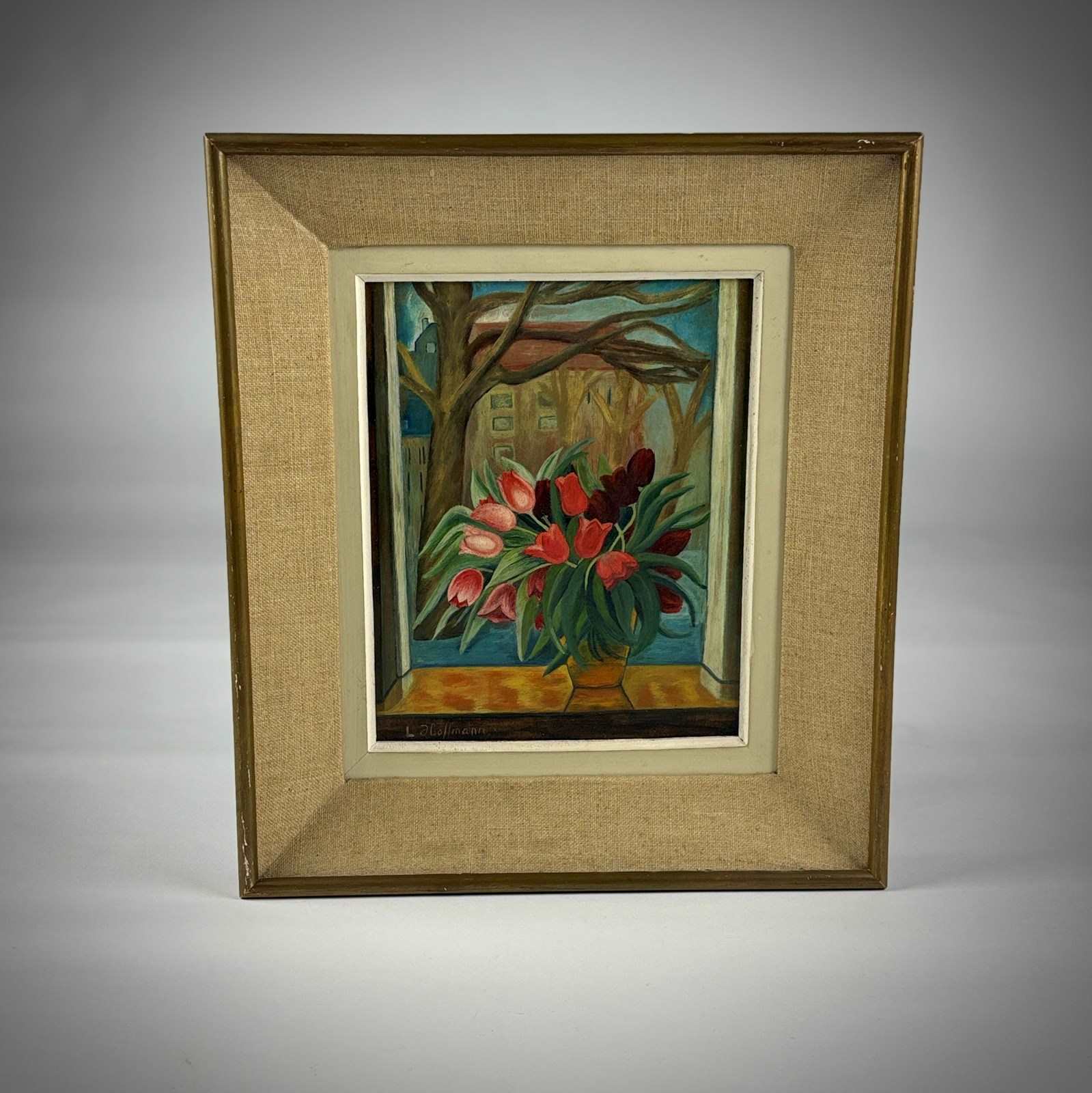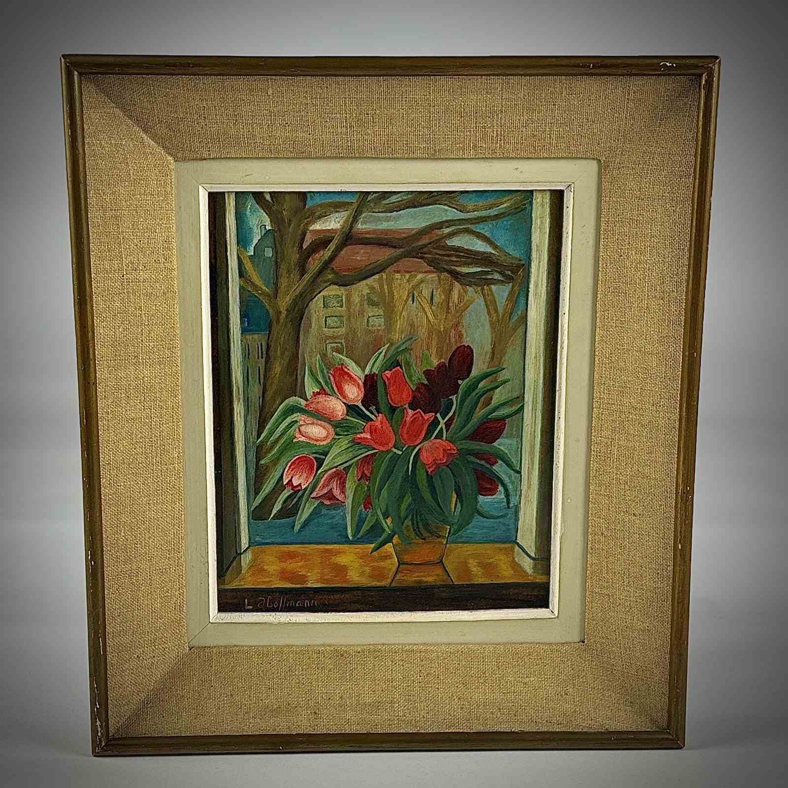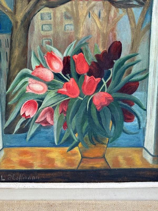 Tulips by the Window Oil on Board 20th Century (Circa 1960) Lush bouquet of red and pink tulips in a faceted golden vase placed prominently on a windowsill, the vivid tulips burst with colour against the muted late winter trees and city buildings backdrop. Signed L Hoffmann.