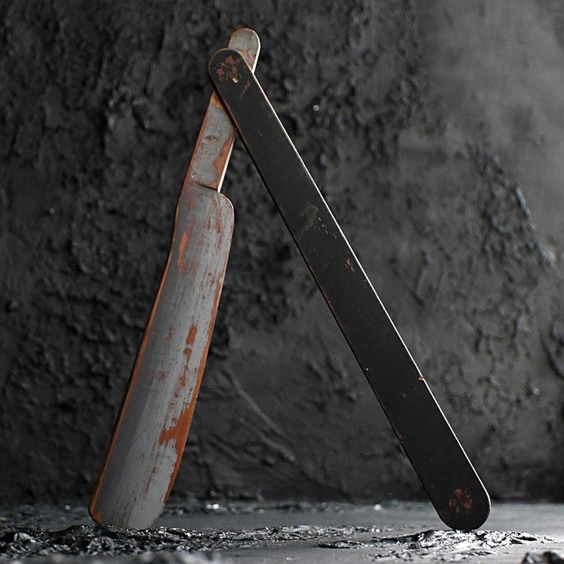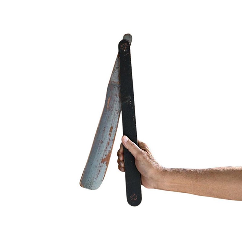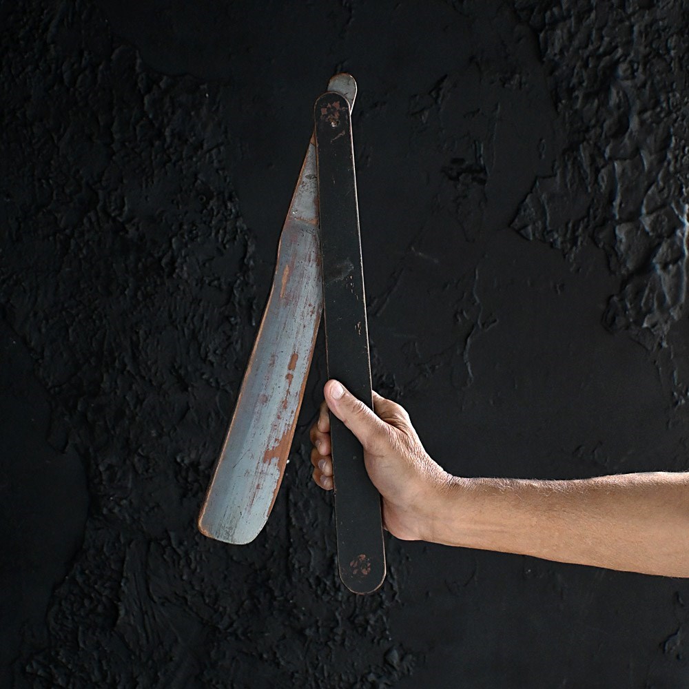 This oversized mid-20th century barbers shop trade sign would likely have sat or been hung inside the store in situ to promote shaving services. It opens completely and has a small metal nail in place for it to be opened and closed as shown.