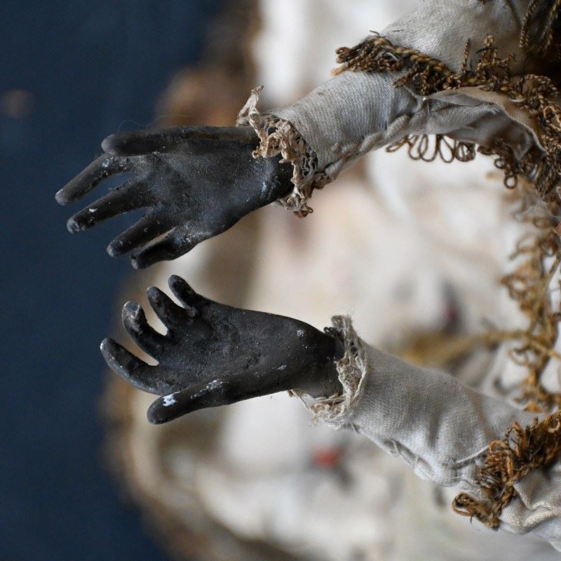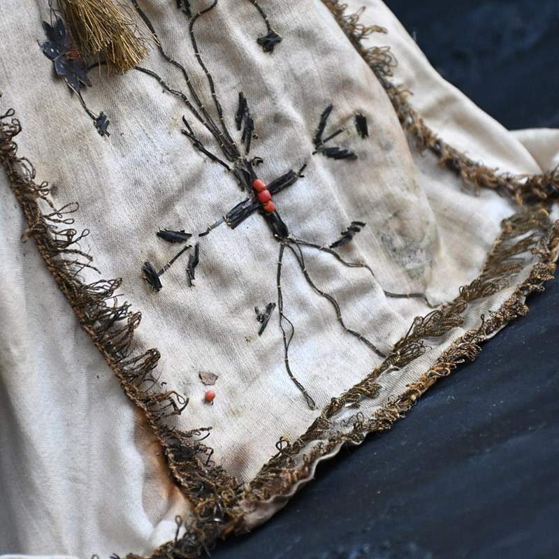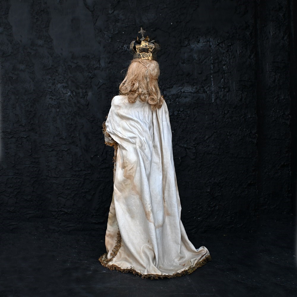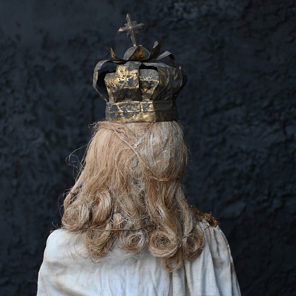 This item shows natural wear and aging with faded surfaces paint and lost detail but in overall good condition for its age. The silk material is stained and discoloured in sections as shown. The crown is detachable and is firm in form with light loss and shape distortion as shown. This object is more than a 100 years old so please expect this in its overall condition.