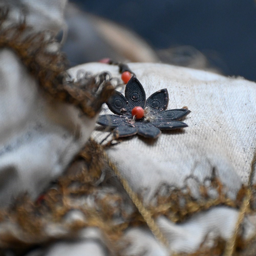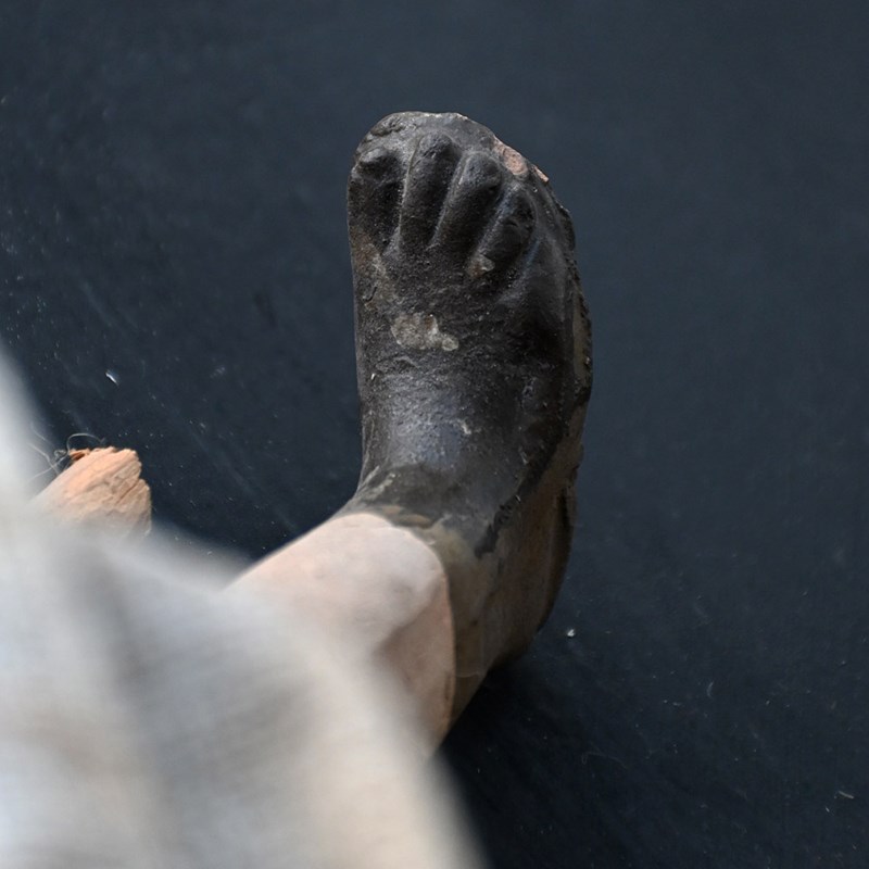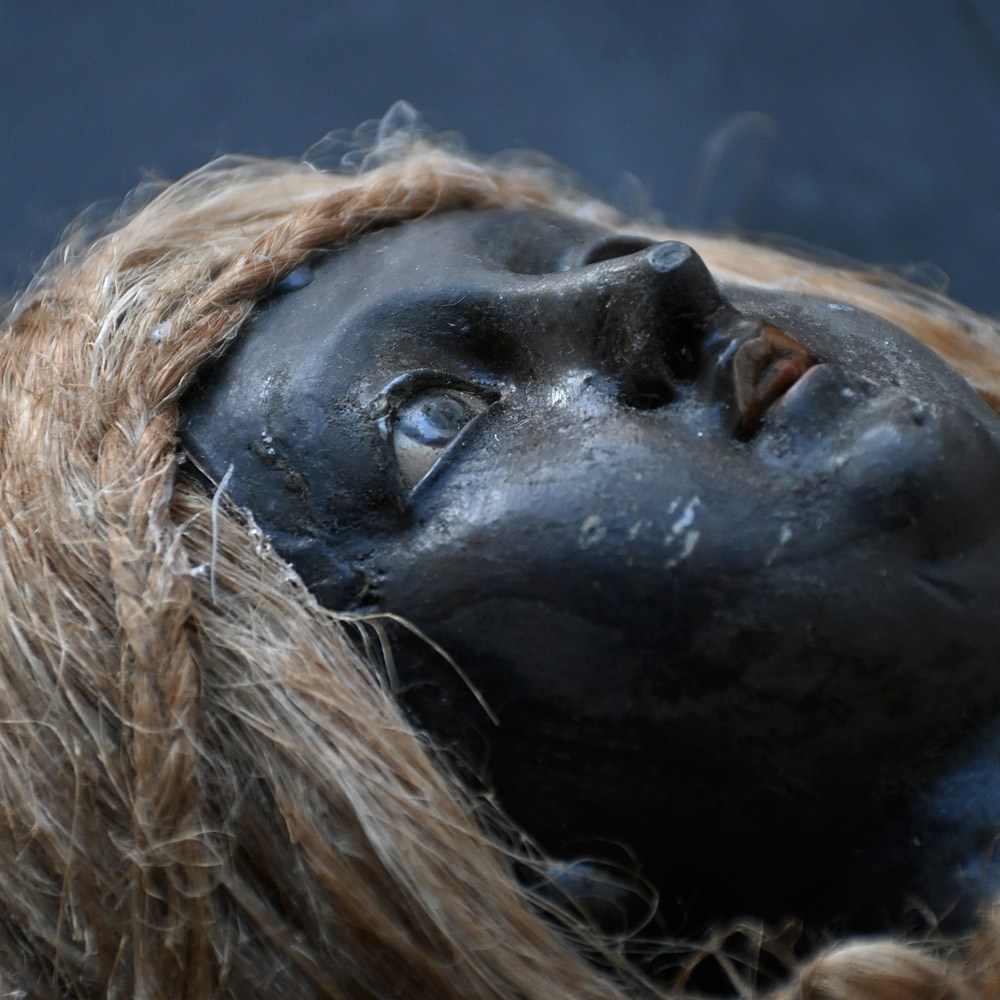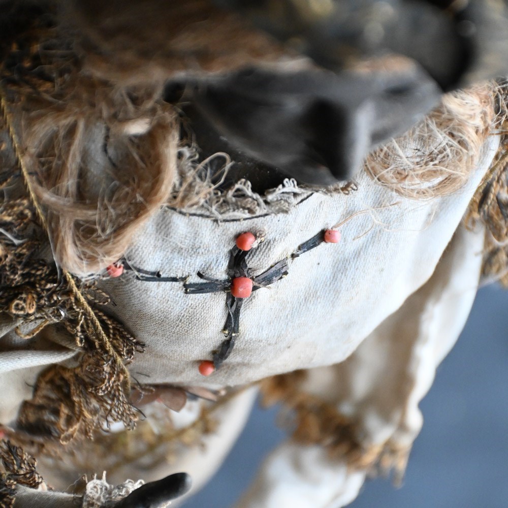 This item shows natural wear and aging with faded surfaces paint and lost detail but in overall good condition for its age. The silk material is stained and discoloured in sections as shown. The crown is detachable and is firm in form with light loss and shape distortion as shown. This object is more than a 100 years old so please expect this in its overall condition.