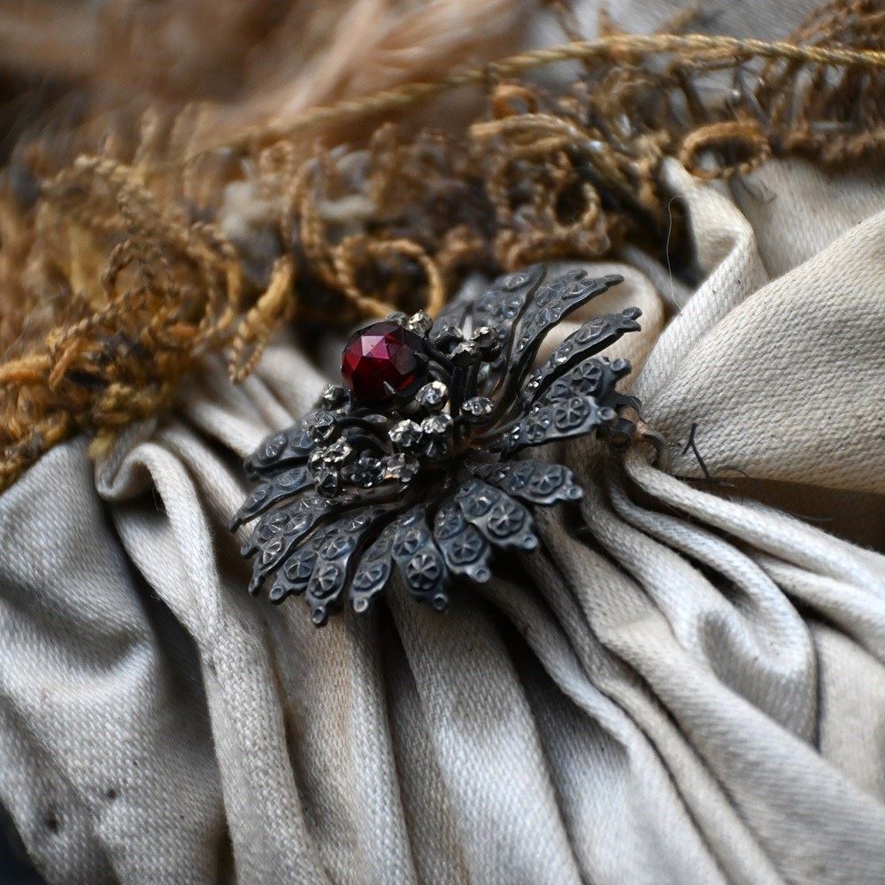 A hand crafted and rare example of an early to mid-19th century black Madonna figure. Dressing in its original embroidered silk gown with gold threaded tassels. Real hair, glass eyes and brass fitted crown. The figure is made from hand painted terracotta and stood on a bespoke cast metal stand. The form underneath is supported by pine and hessian material as shown. Wearing a stunning brass and red stone brooch, a truly special religious and highly decorative example.