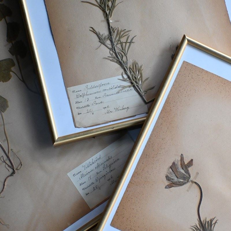 Six early 20th Century pressed botanic samples signed and dated 1906. Each example has a handwritten paper description of the specimen shown. Framed in acrylic gold front covered display and ready to be hung.