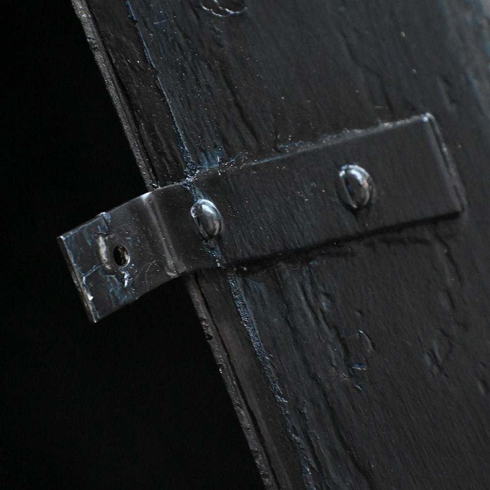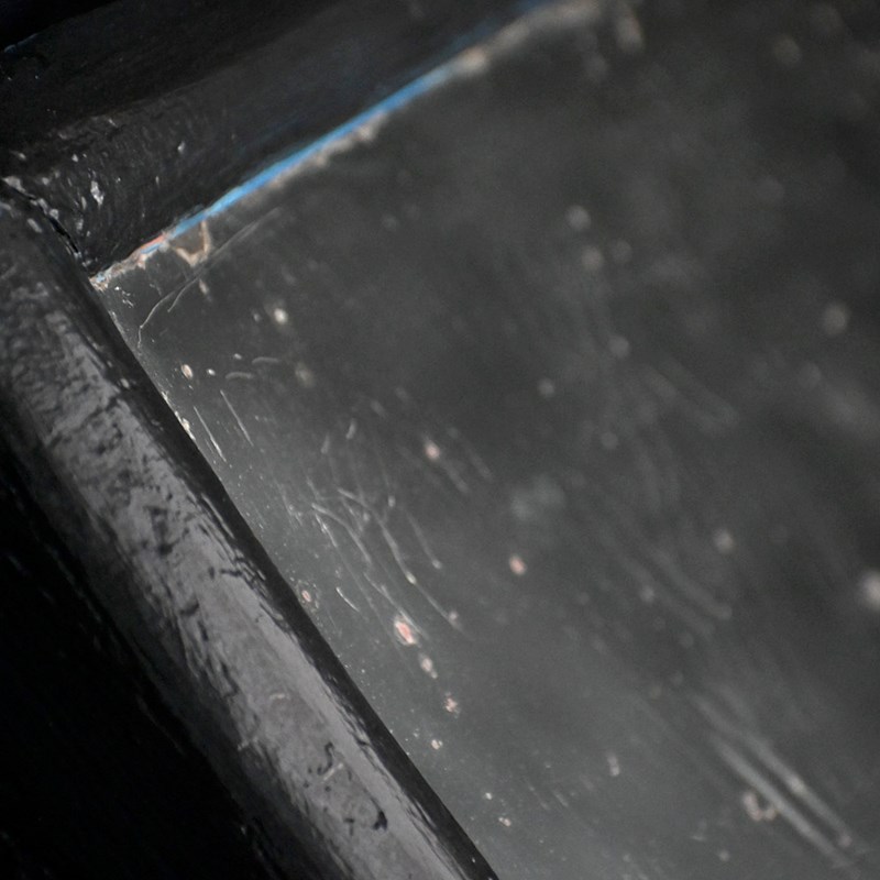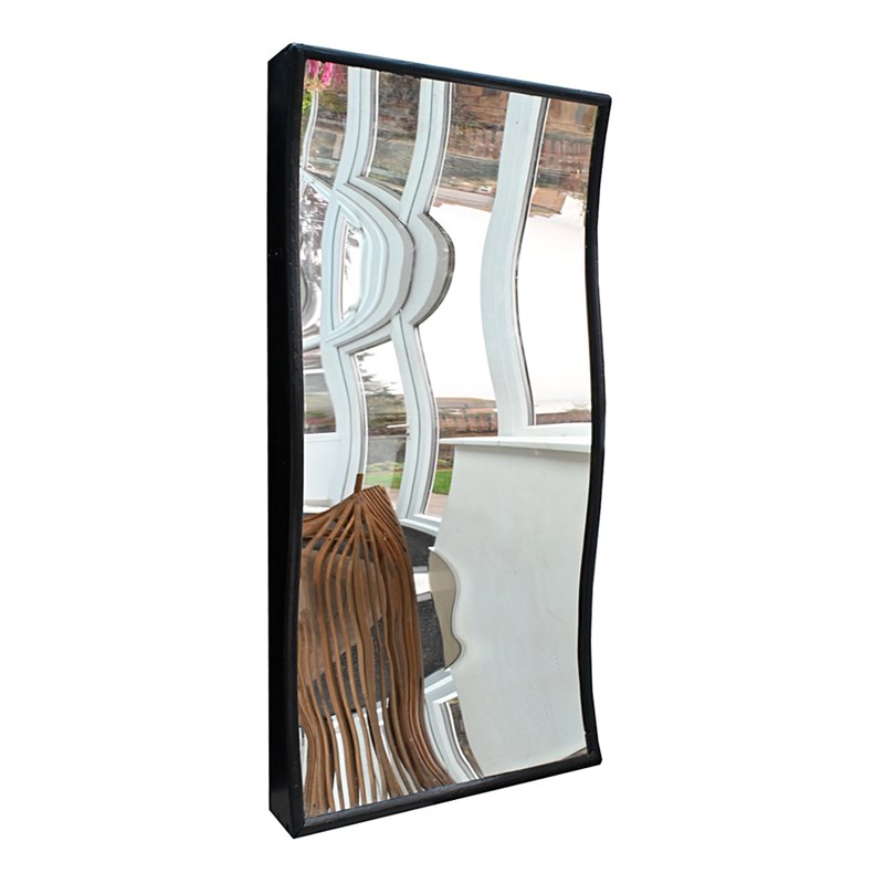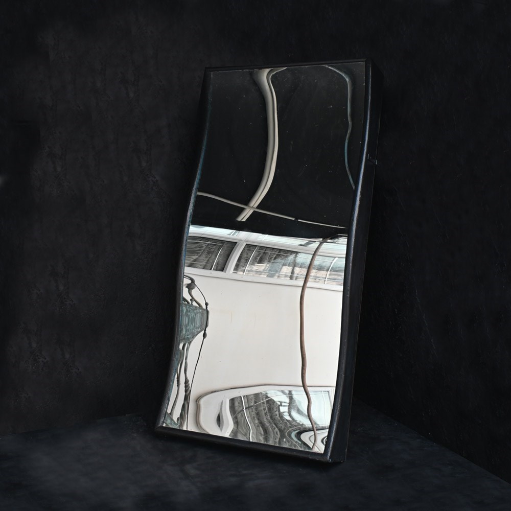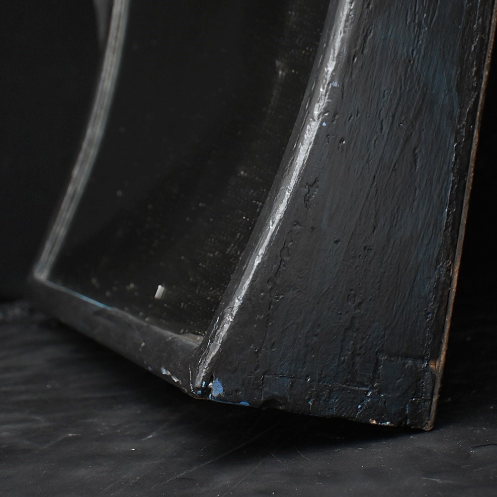 A large example of an English distorted original fairground mirror, dated to the early part of the 20th century. This example is unusually wide, it has been repainted from light blue to black as this can be seen. The mirror is also aged well with natural mercury spots and aged scratches more to one side than the other. With 2 support brass brackets still in place, this mirror weighs roughly 40kgs but can be attached to a wall. Giving a great, strong distorted effect to brighten up any hallway.
