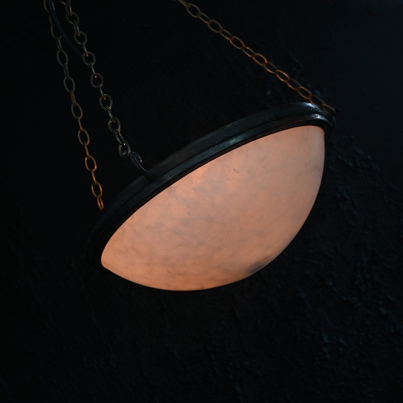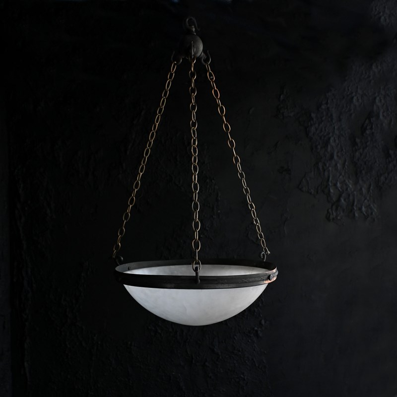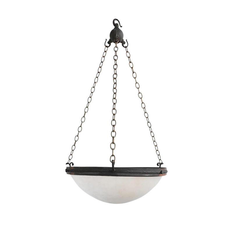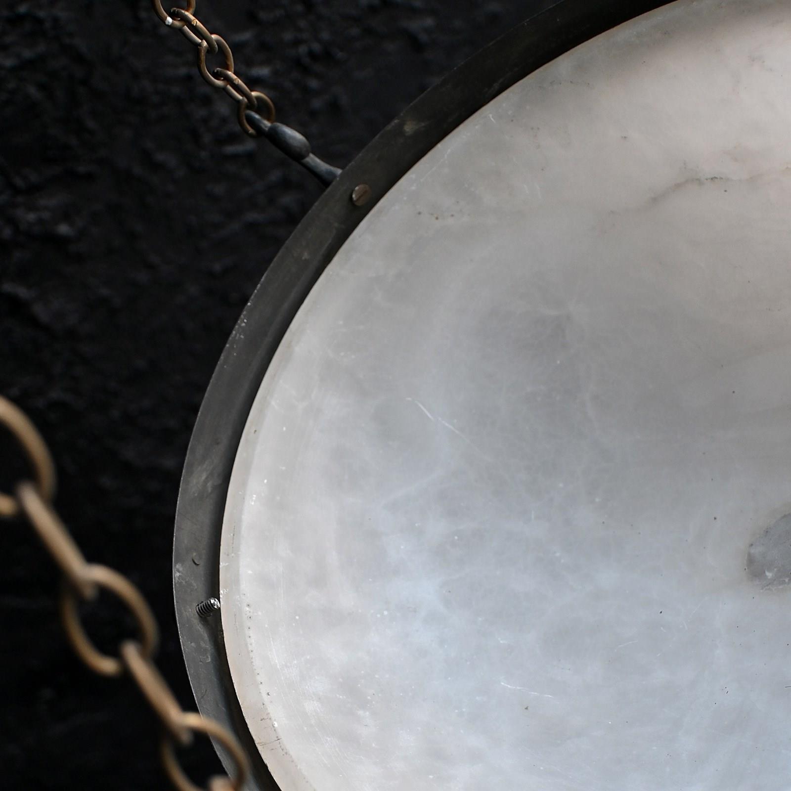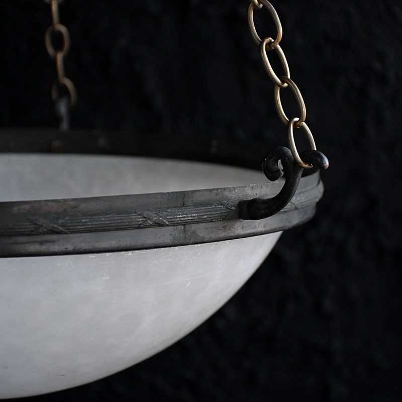A naturally aged copper and alabaster plafonnier chain light. With original period ring fittings and ceiling support hook.