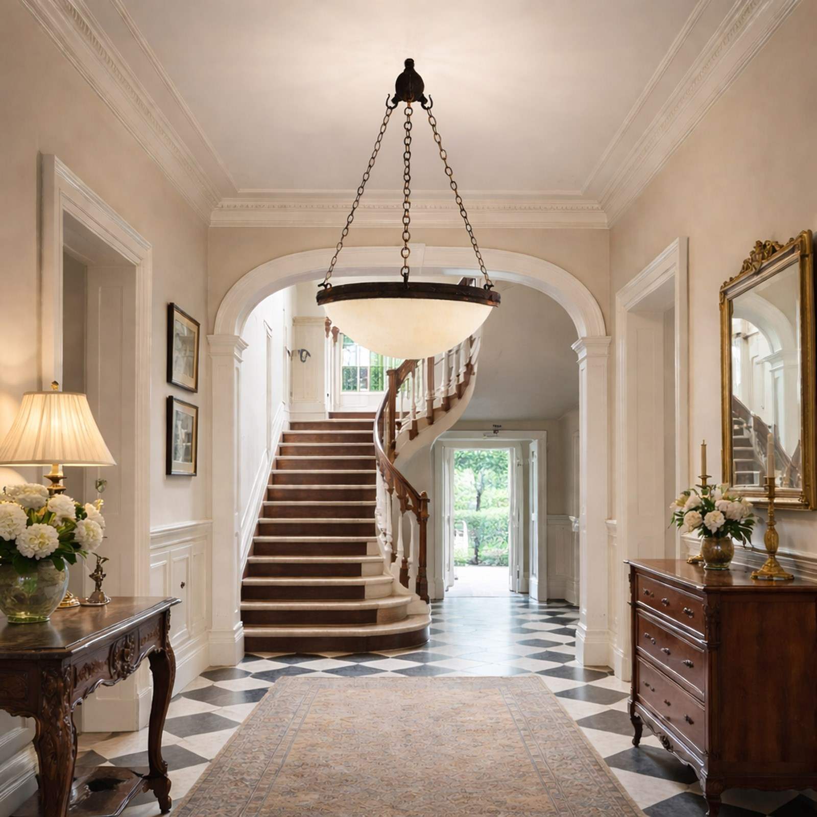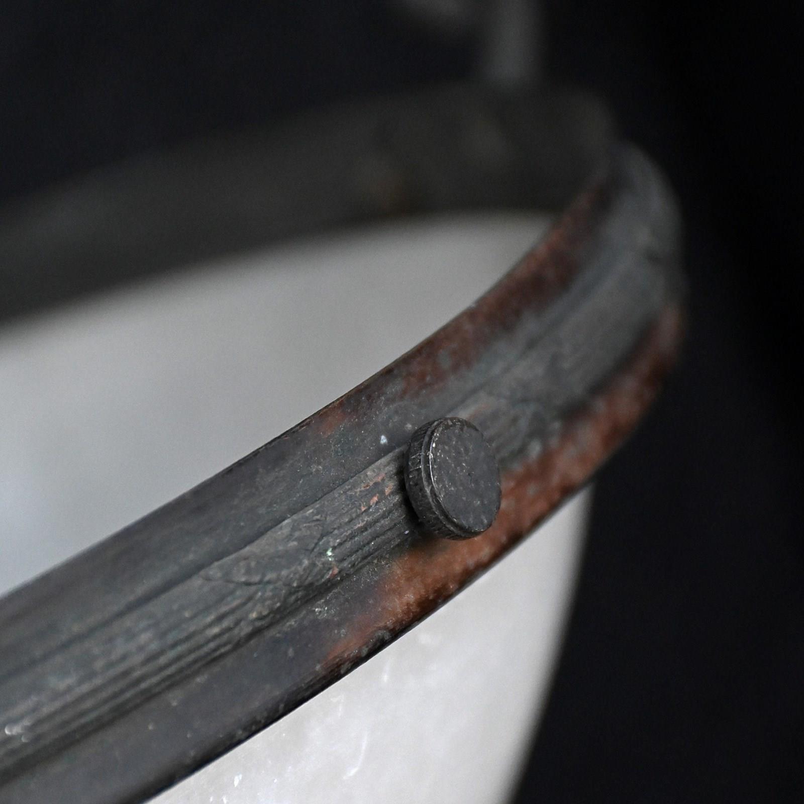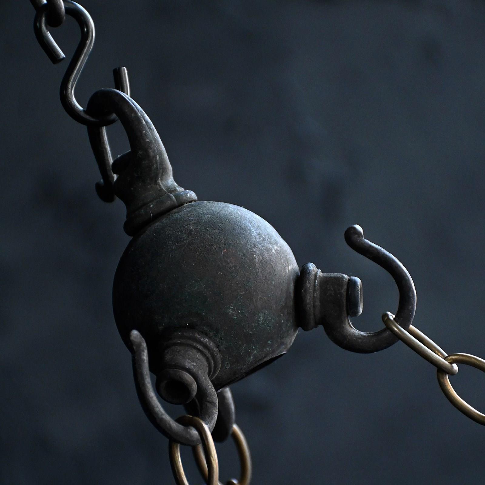 A naturally aged copper and alabaster plafonnier chain light. With original period ring fittings and ceiling support hook.