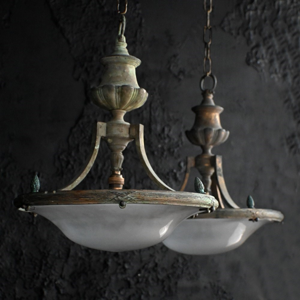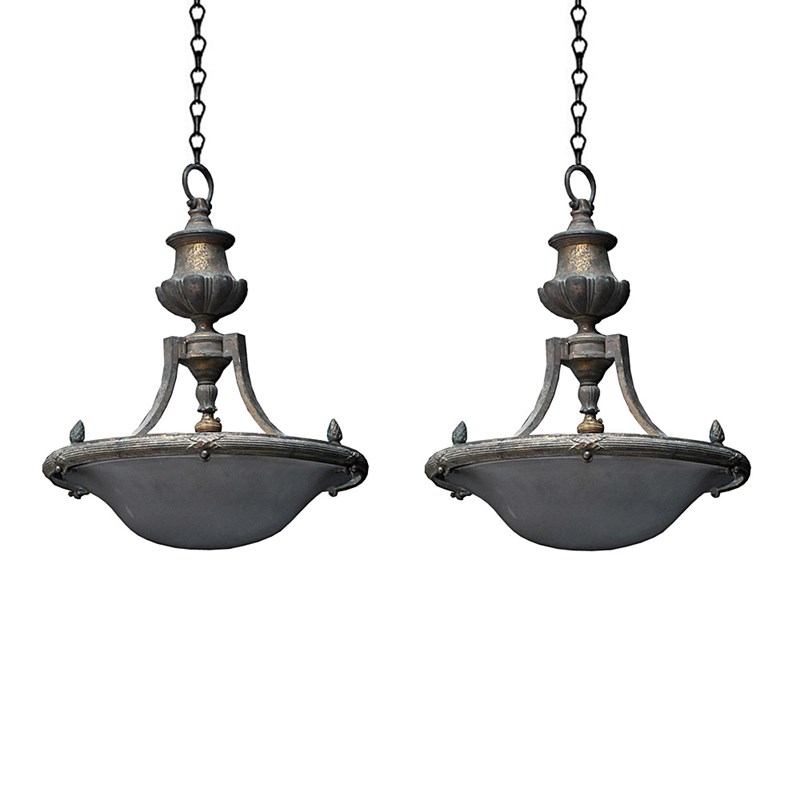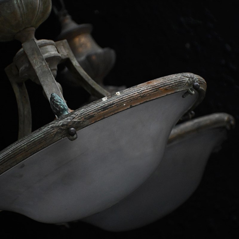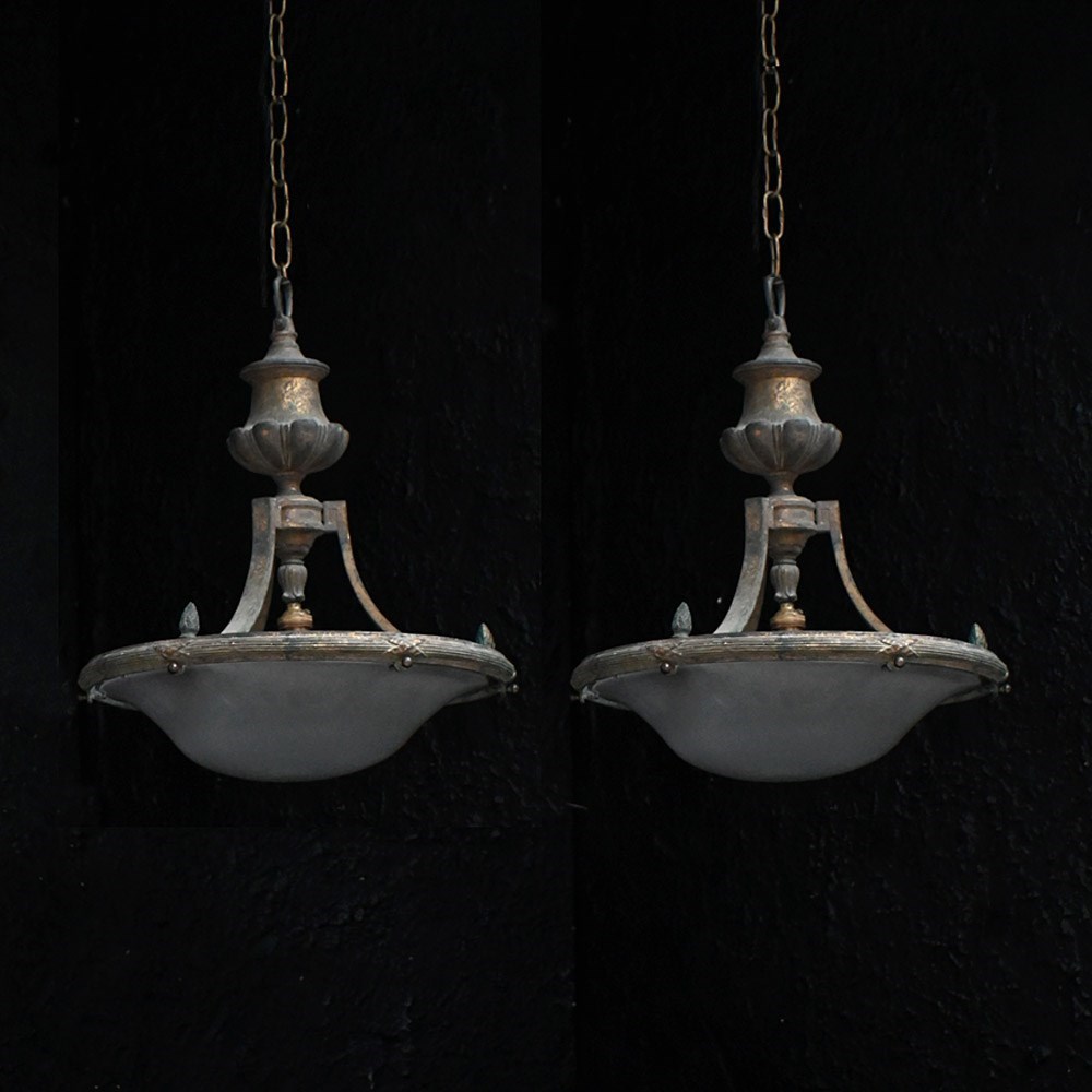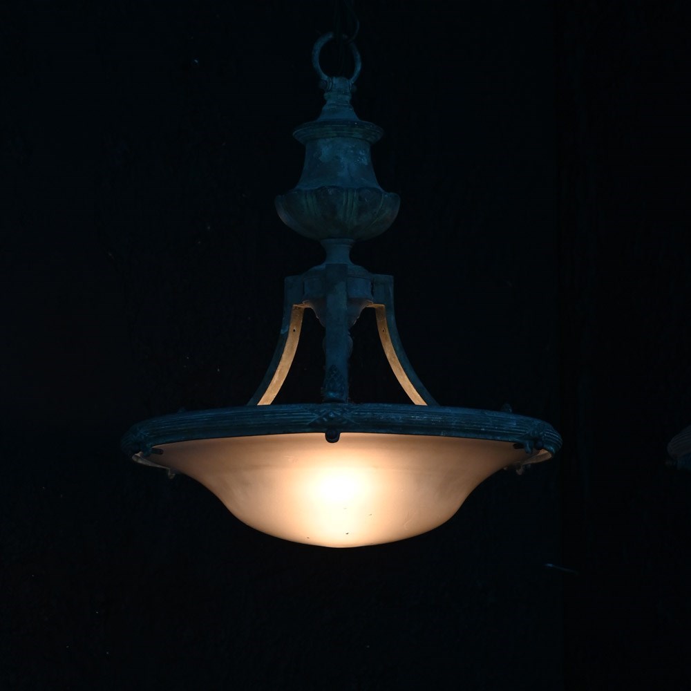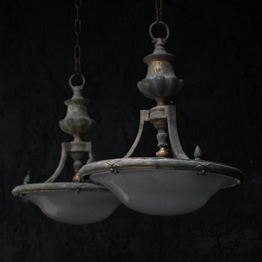 A very stylish matched pair of late 19th Century English bronze ceiling lights. With brass bayonet light fittings in place and black cords rewired. Ornate decorative detail including central rose shaped gallery with acorn edge finish. With their original milk tone glass shades which are detachable.