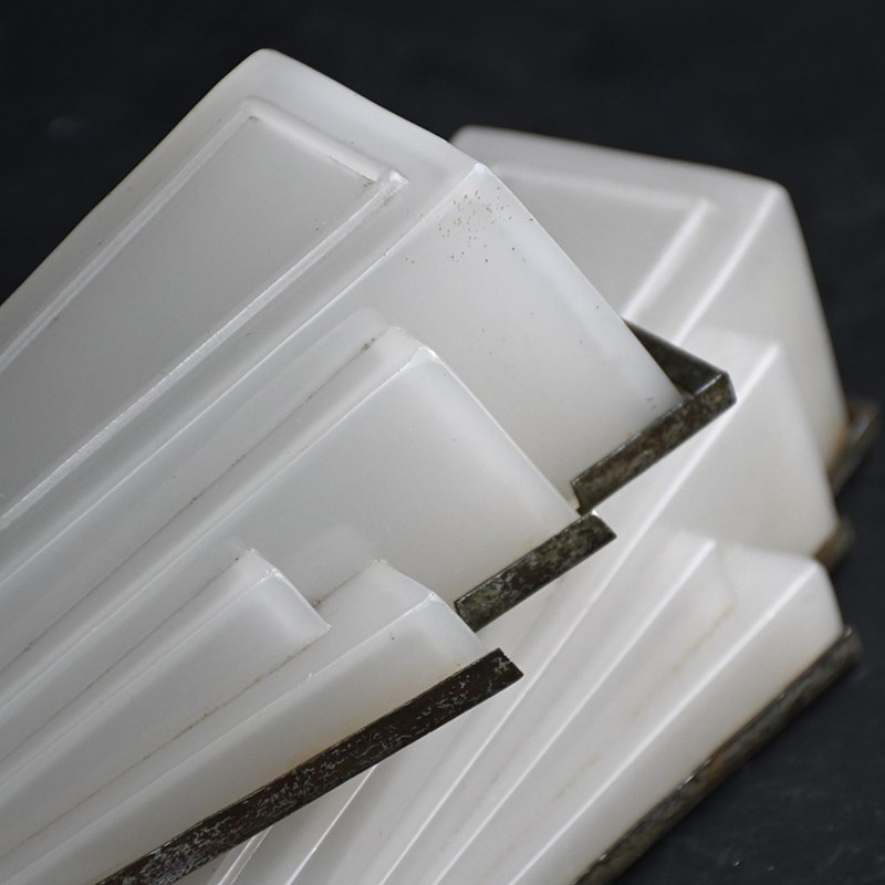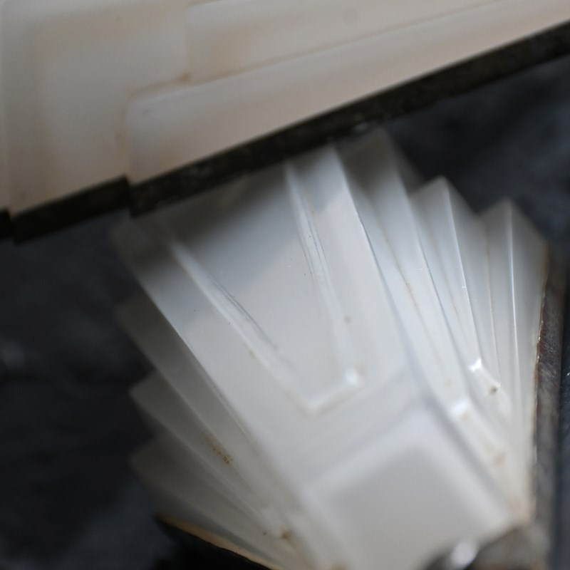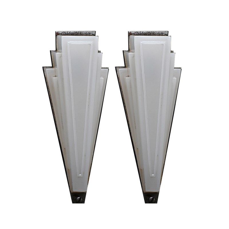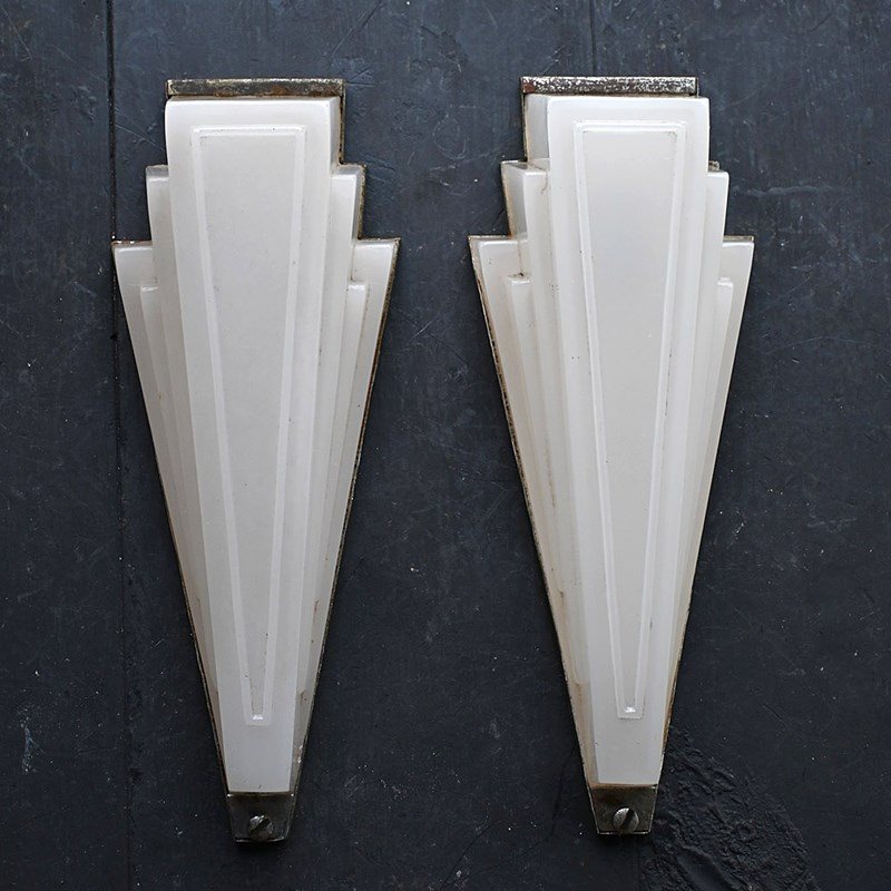 An amazing untouched, matched pair of art deco glass opaline English cinema wall lights. With original nickel plated back sections for mounting. These lights are unwired but can easily be adapted to suit your needs by a professional electrician once in situ.