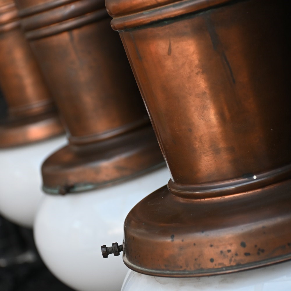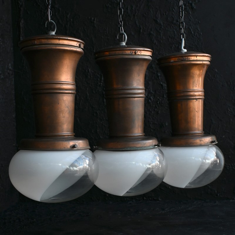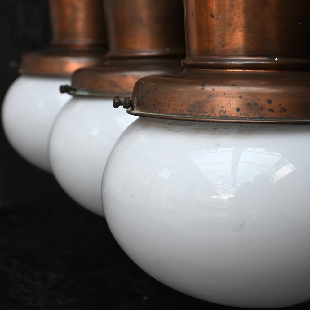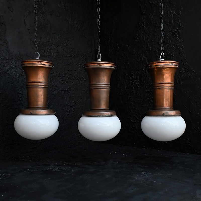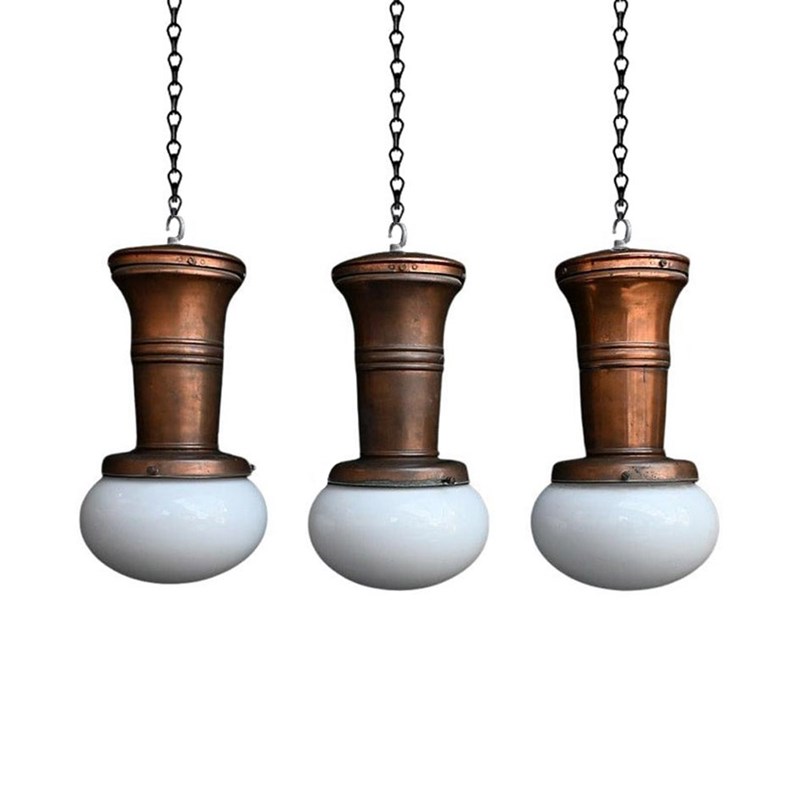 A set of three early 20th century copper and milk glass unusually shaped pendants. Chains are not included in the sale of these lights. These lights would have originally hung outside due to the fact they have condensation release holes at the base of the glass shades, which are also split clear on one side and milk glass on the other as shown. They still have their brass bayonet fittings inside with 3 cord wiring, but we would suggest they are fitted by a professional for safety reason. They would look brilliant hung over a central kitchen island or industrial interior space.