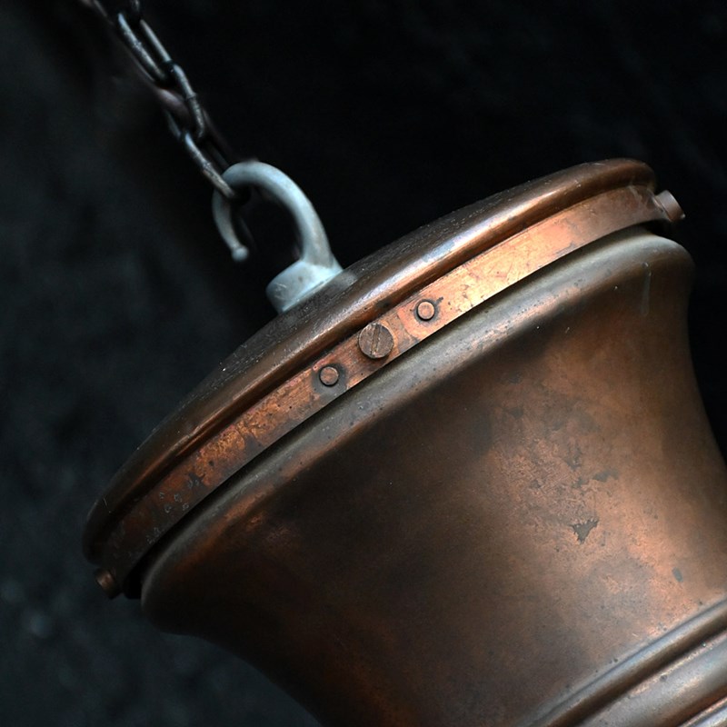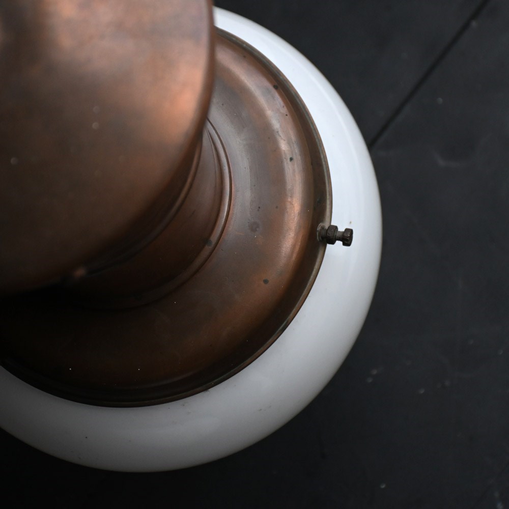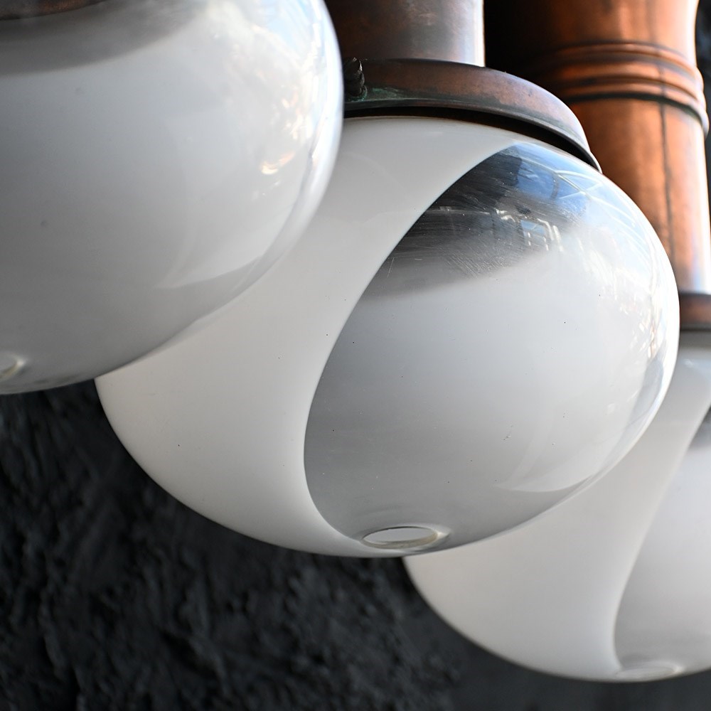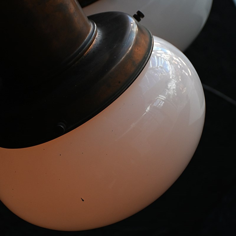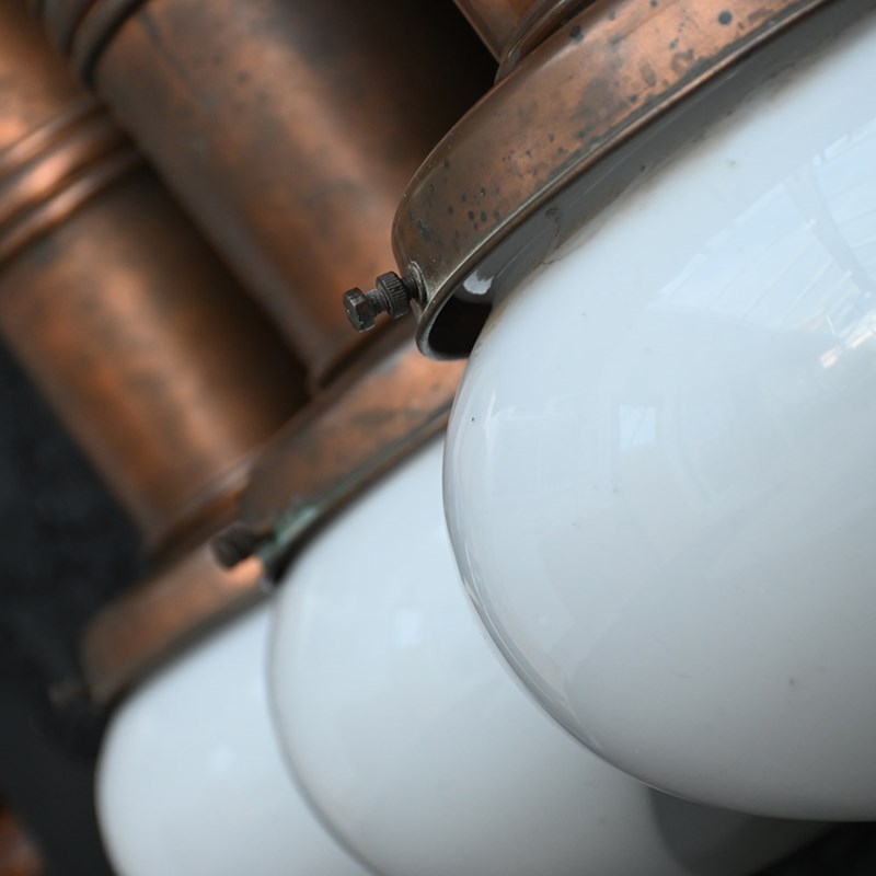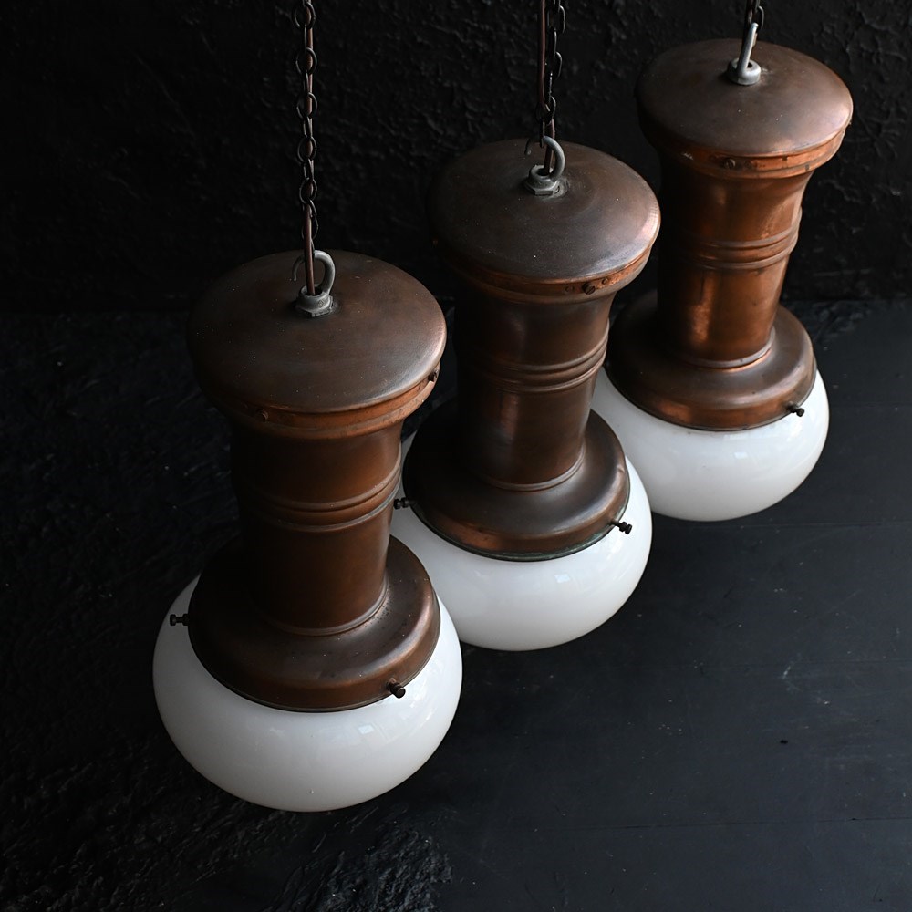 A set of three early 20th century copper and milk glass unusually shaped pendants. Chains are not included in the sale of these lights. These lights would have originally hung outside due to the fact they have condensation release holes at the base of the glass shades, which are also split clear on one side and milk glass on the other as shown. They still have their brass bayonet fittings inside with 3 cord wiring, but we would suggest they are fitted by a professional for safety reason. They would look brilliant hung over a central kitchen island or industrial interior space.