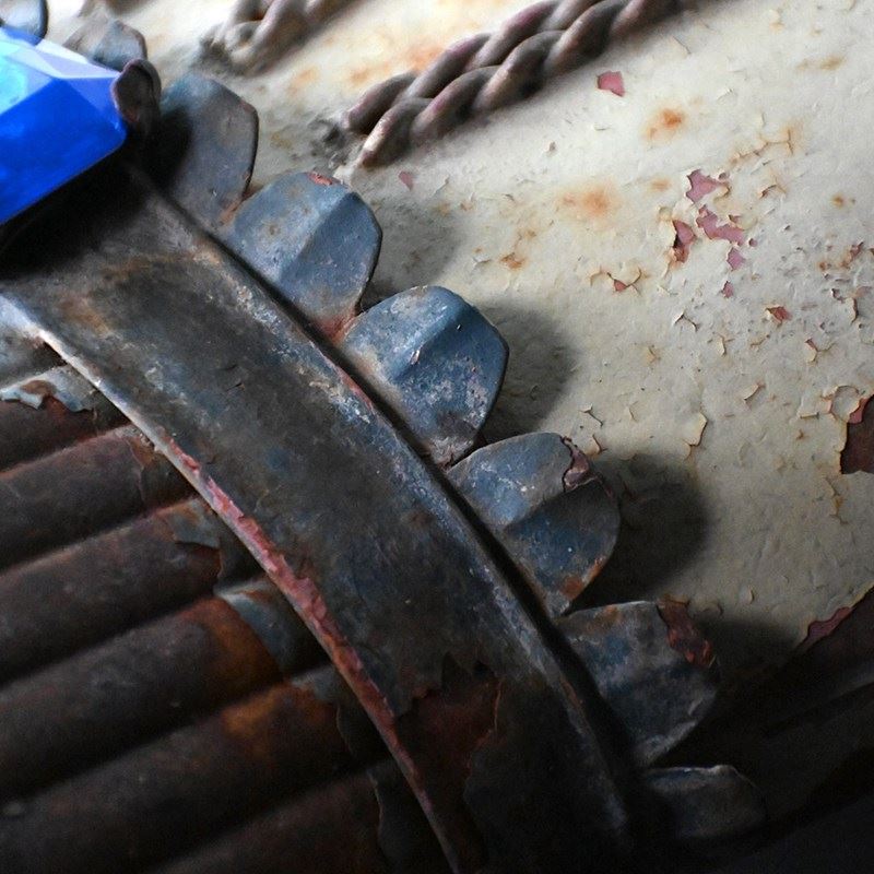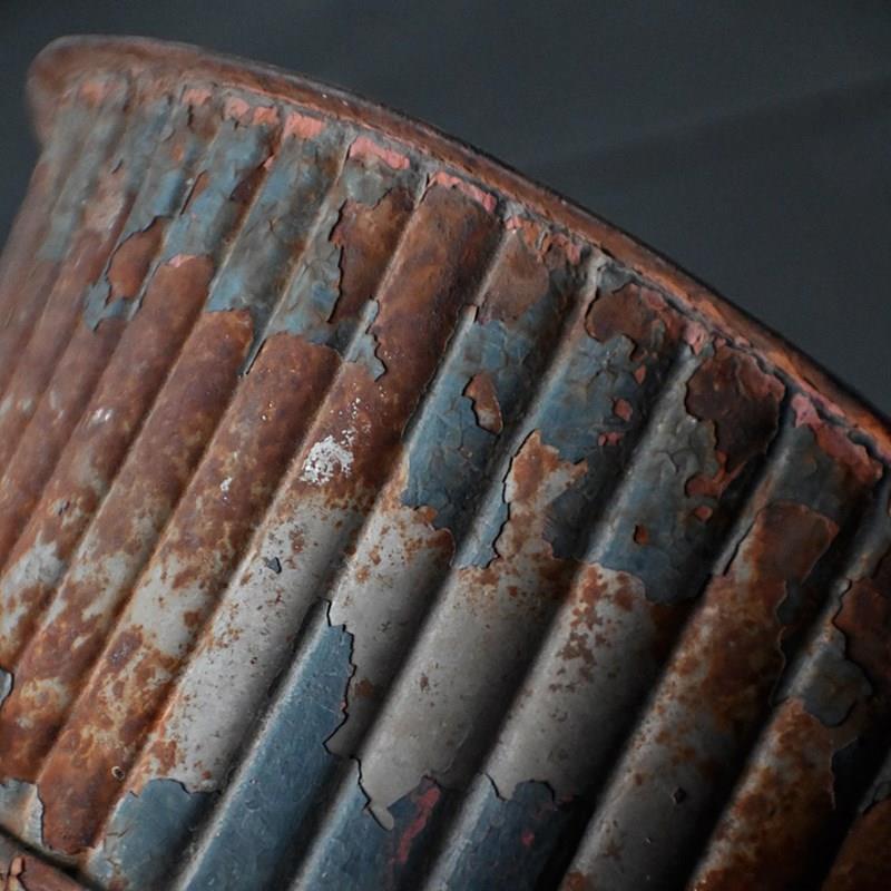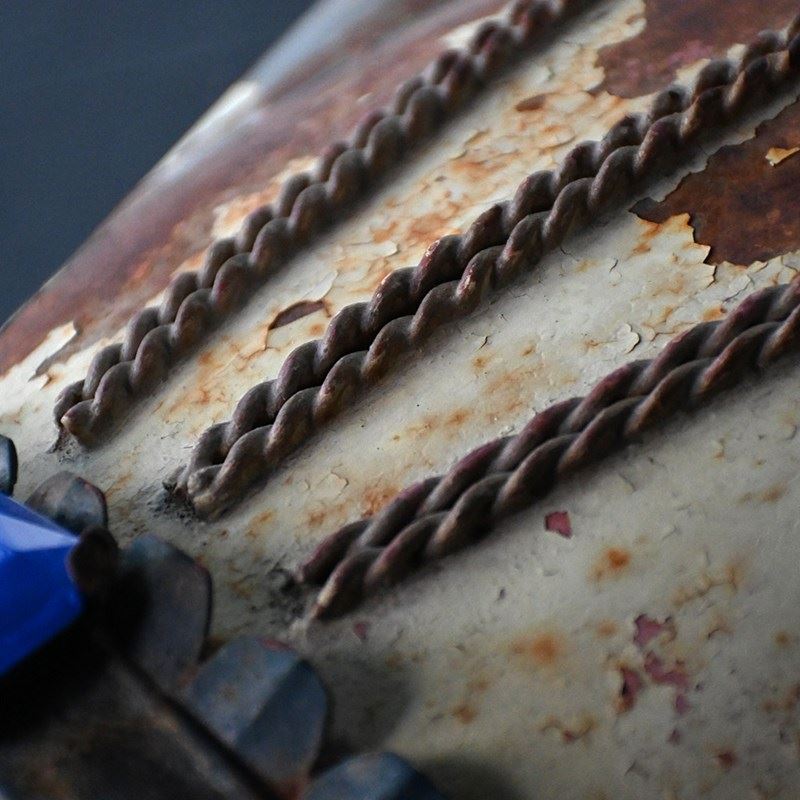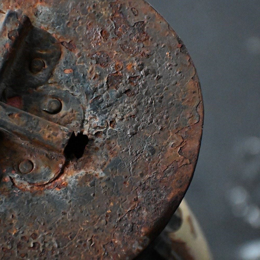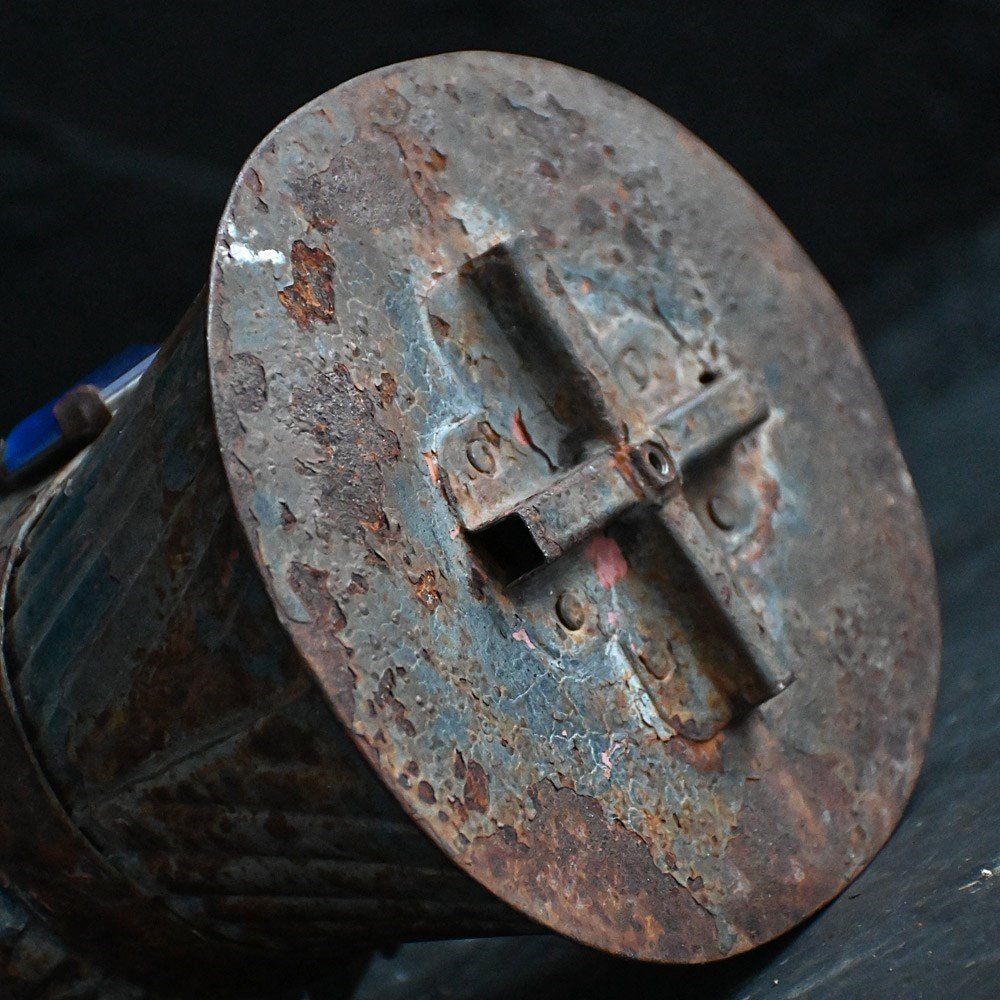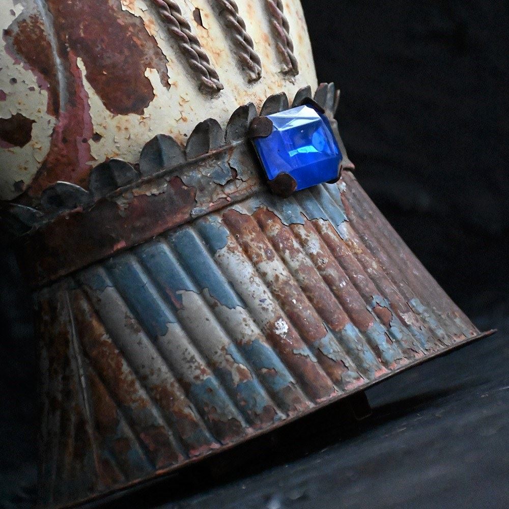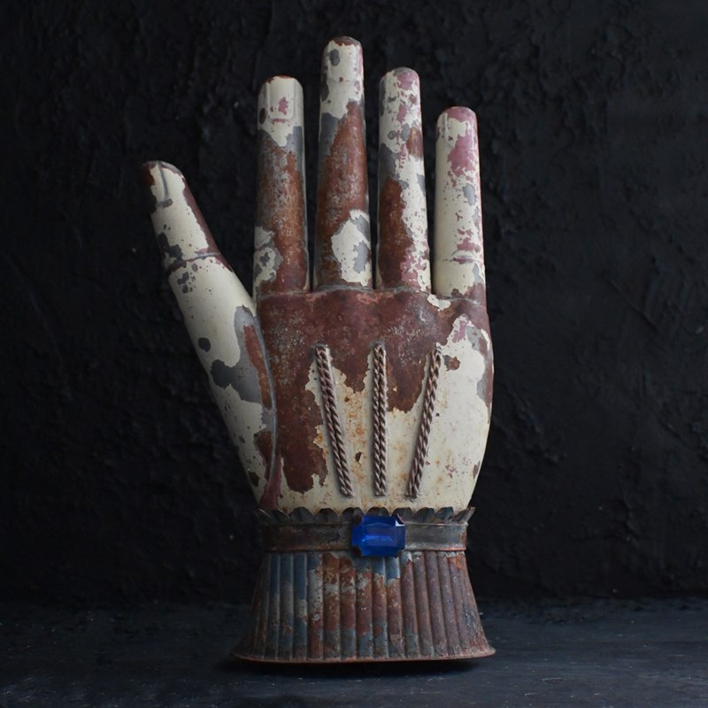 A highly decorative example of a mid-20th century hand crafted French hand painted metal glove makers trade sign. This item has its original support hanging hole at the base, allowing it to be hung if you wish (chain not included). With a blue glass gem centrally placed. This item is hollow in form and weighs about 4kg.