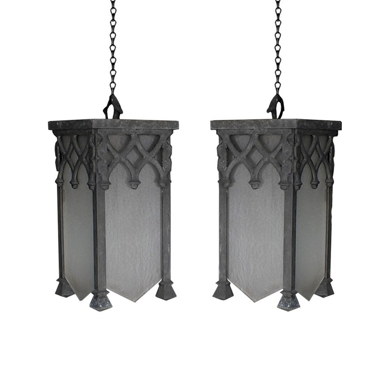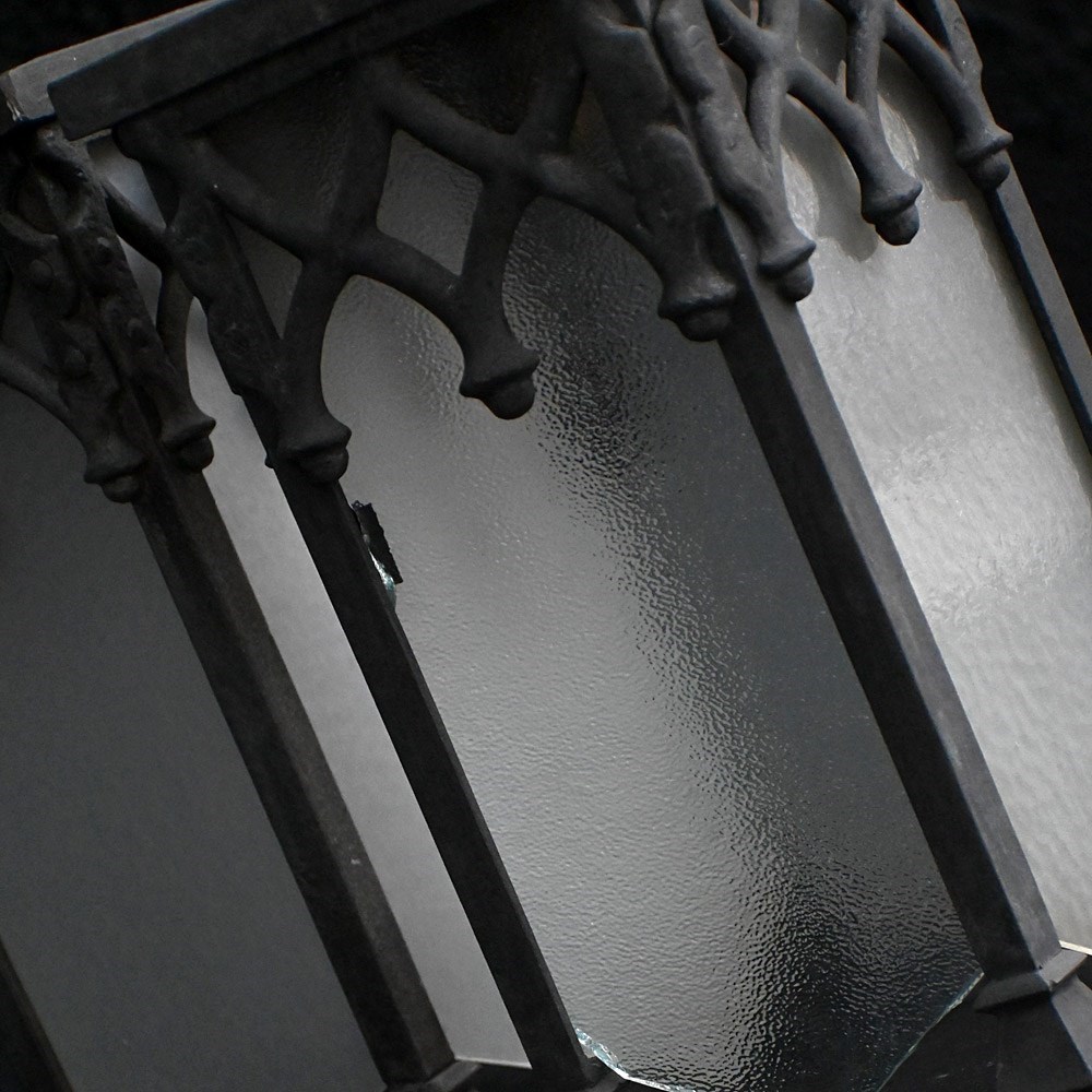 A nice set of turn of the century metal and glass gothic style lights, rewired and with one replacement glass panel. With hanging chains in place and ready to use.