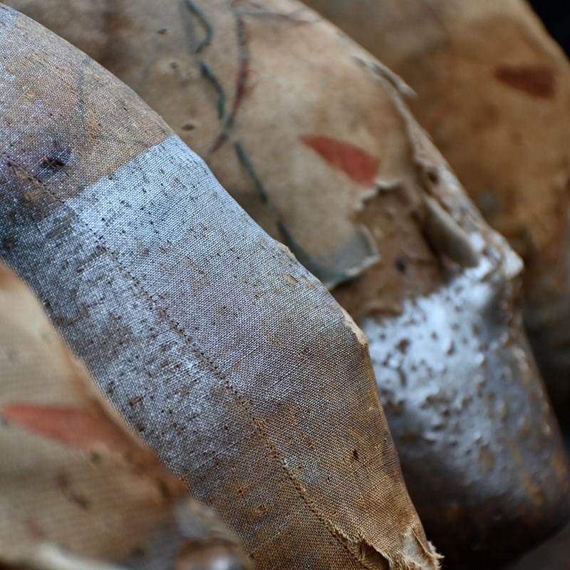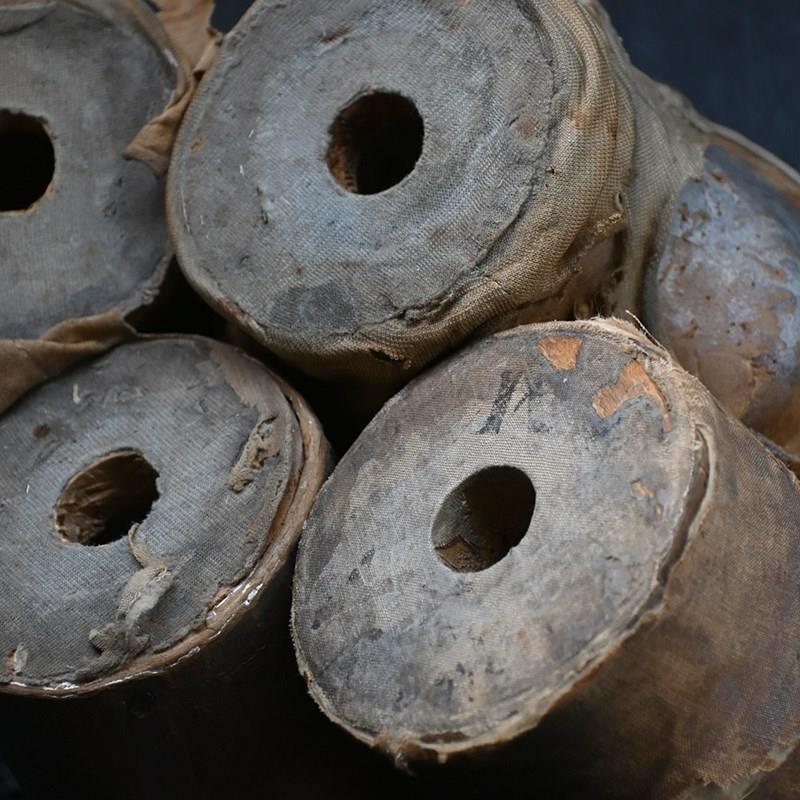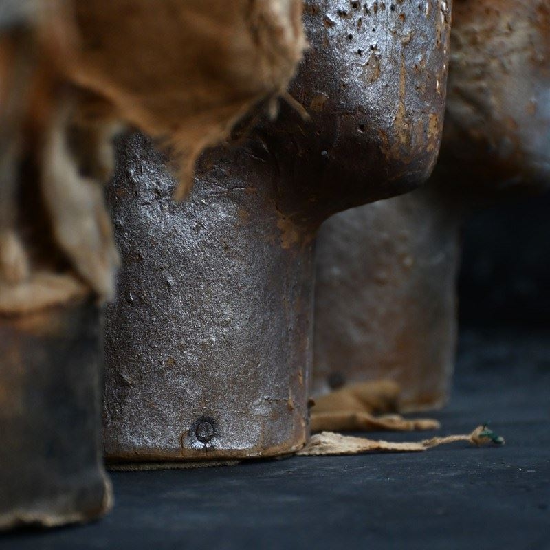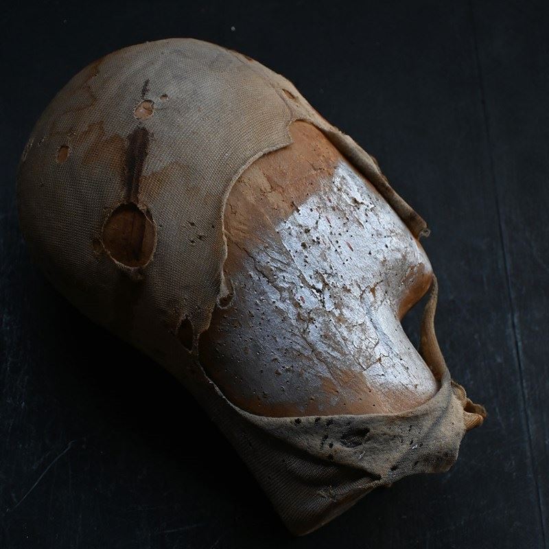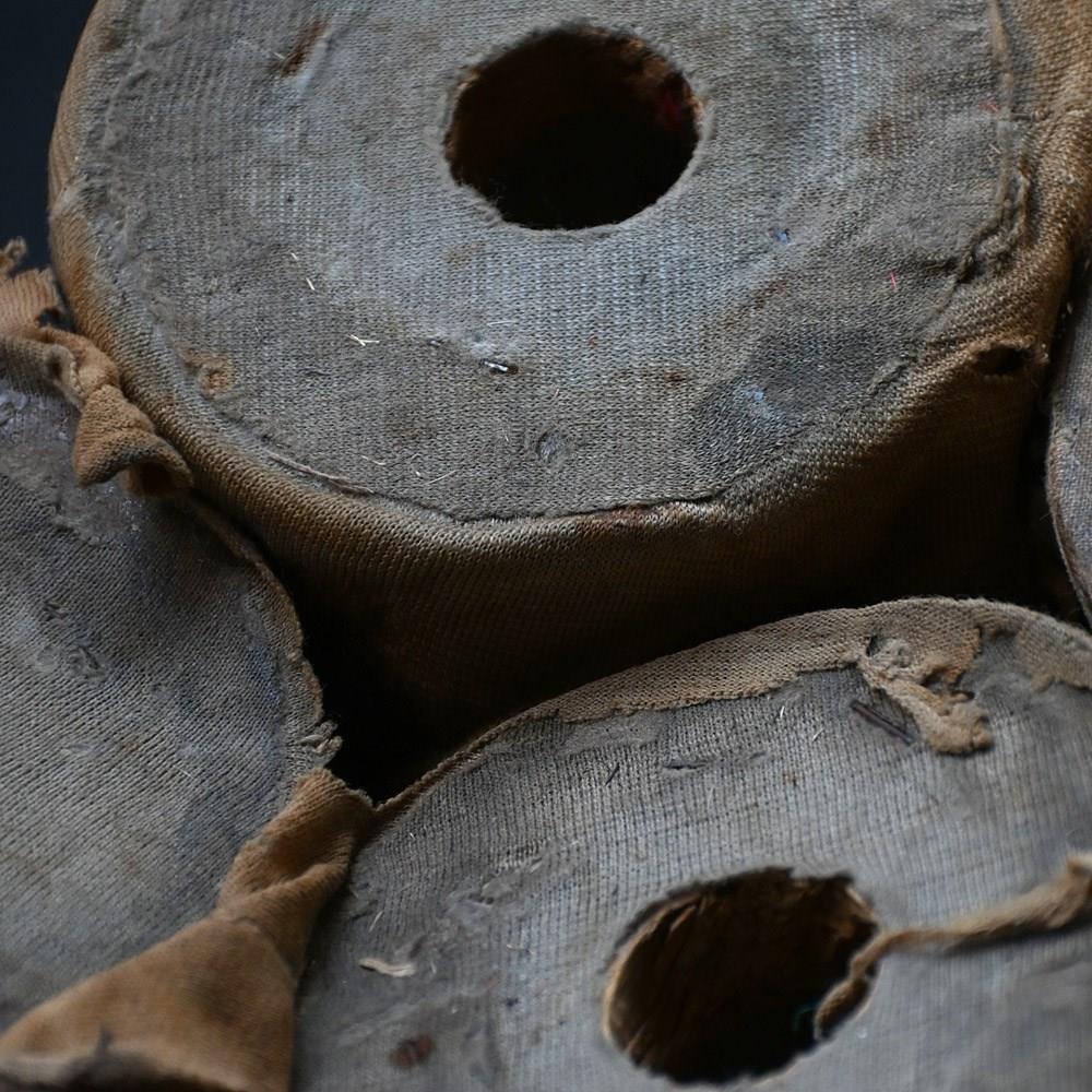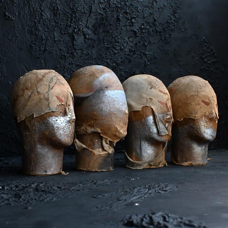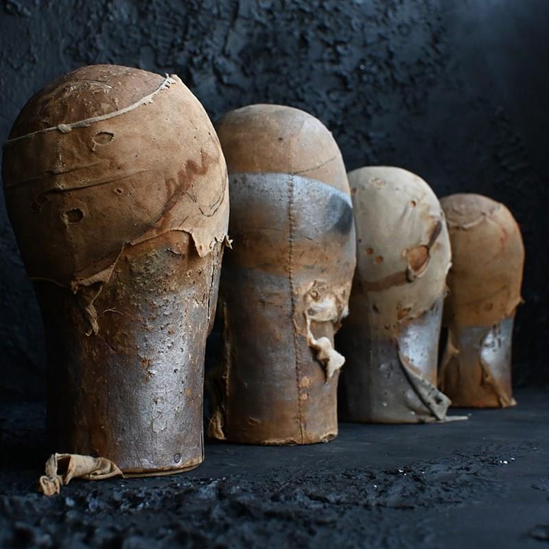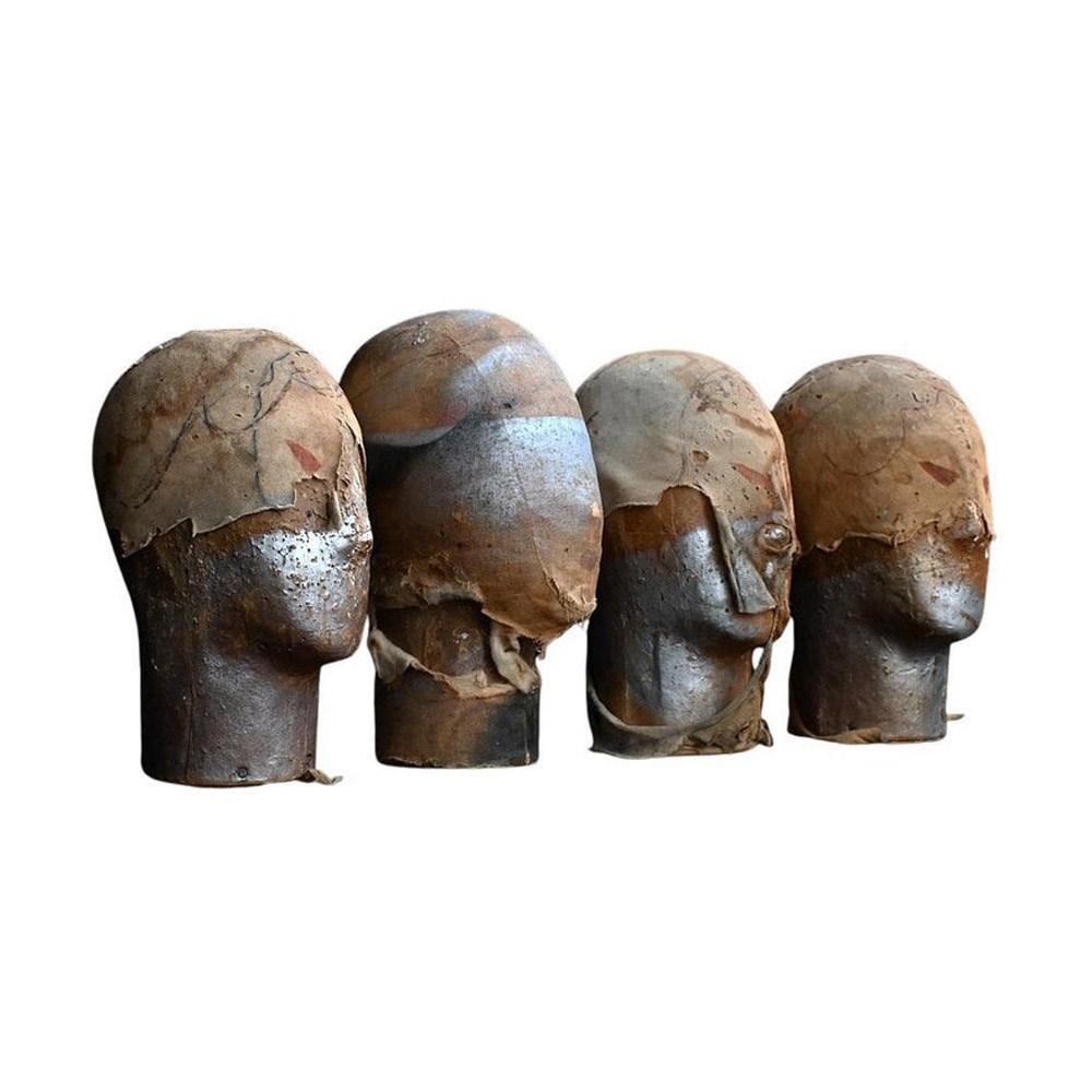 Made from Papier Mache and supported by pine wooden blocks at the base, these highly unusual or even macabre hat makers forms have most certainly a spooky and distinctive look. Covered in pin holes and old weathered material. With old, measured stitch marks and even eye placements, they would have at one point helped a wig or hat maker measure and hold tailer items. Uncovered from a private collection in Wales earlier this month.