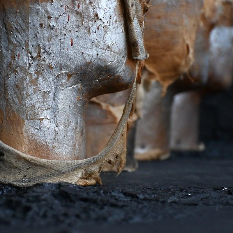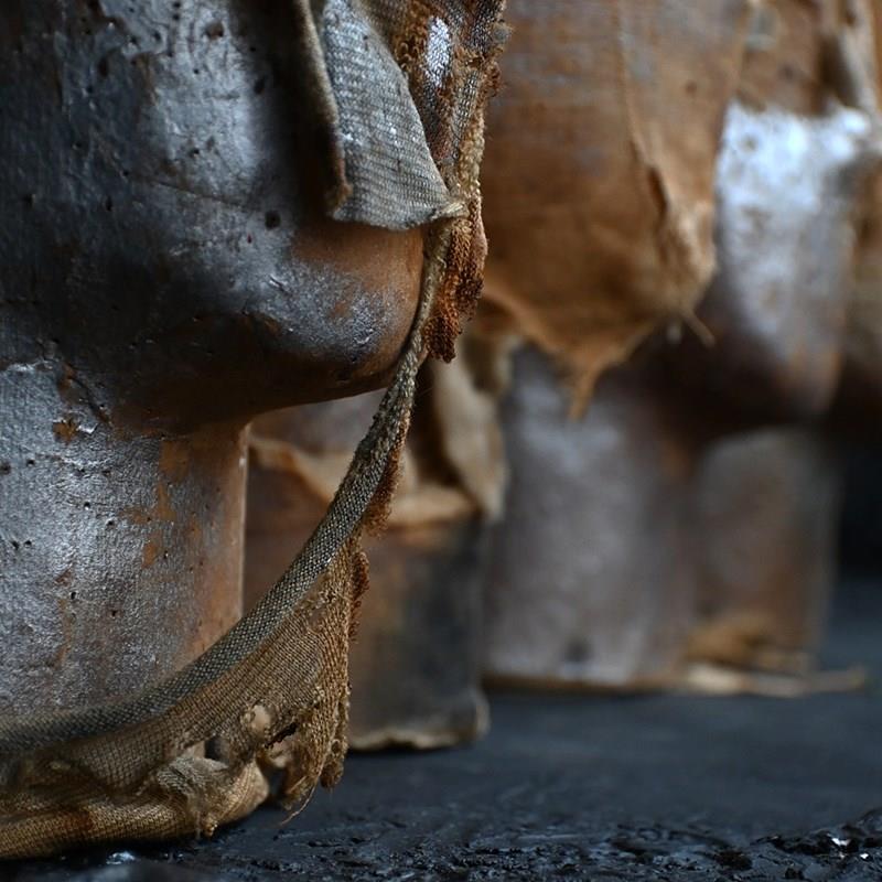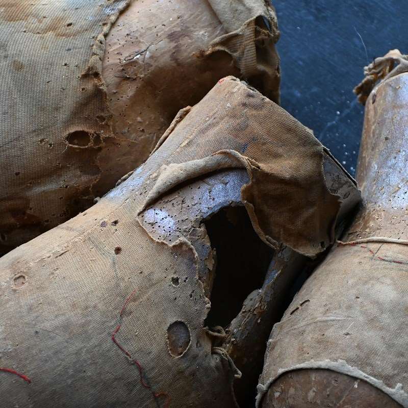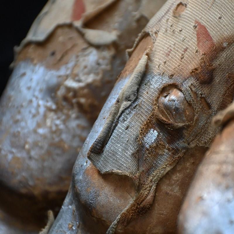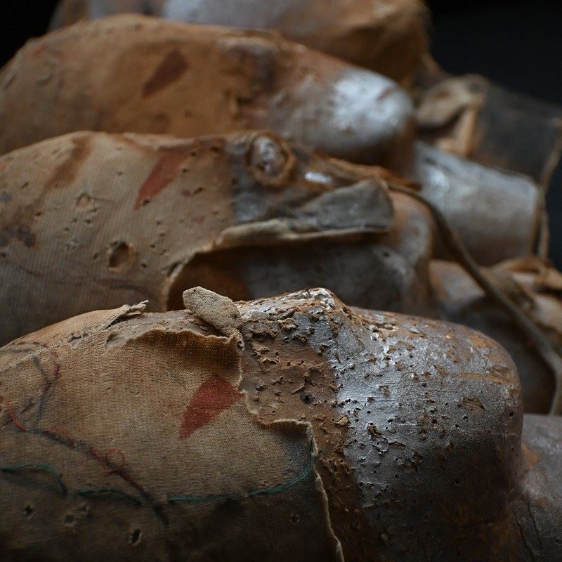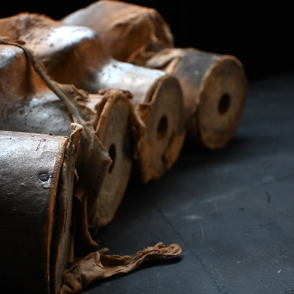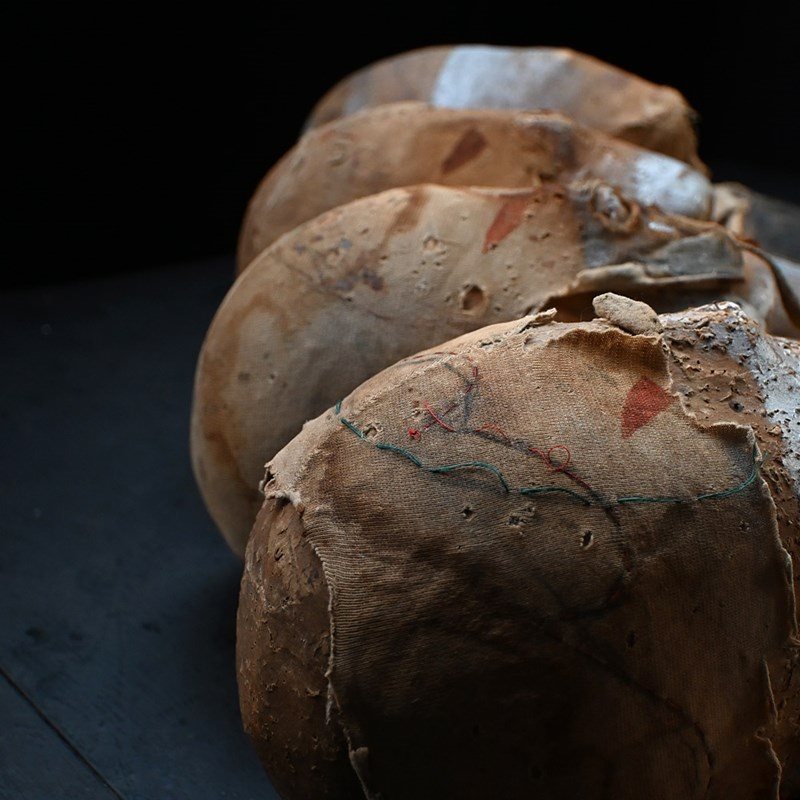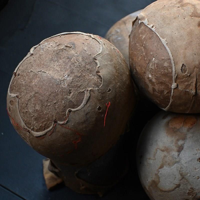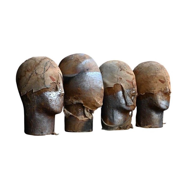 With natural wear and tear due to their age and obvious use. One of the heads has a dent to the side of the neck which reveals the inside. With worn material that still holds strong the forms. Pin markers that cover most of the surface and stains as shown. All for item are strong in form and now loose in structure. They are hollow and light weight due to the material used.