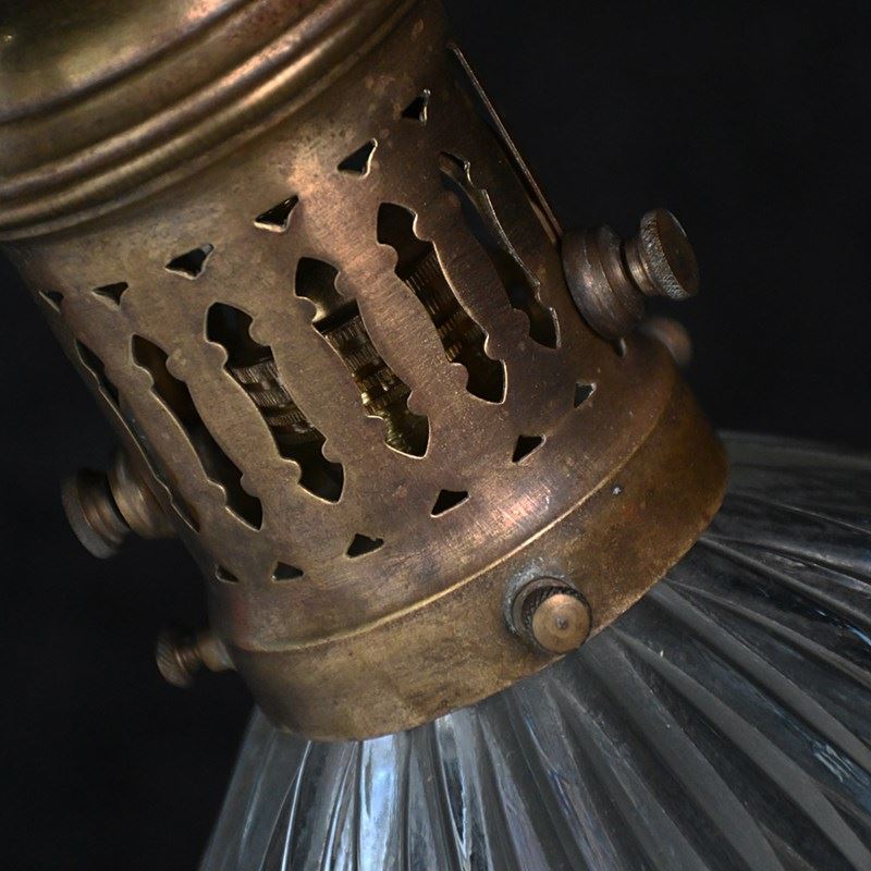 A good example of a mid-20th century French glass Holophane light with brass cage. This is unwired but comes with its original hanging chain and ceiling rose as shown.