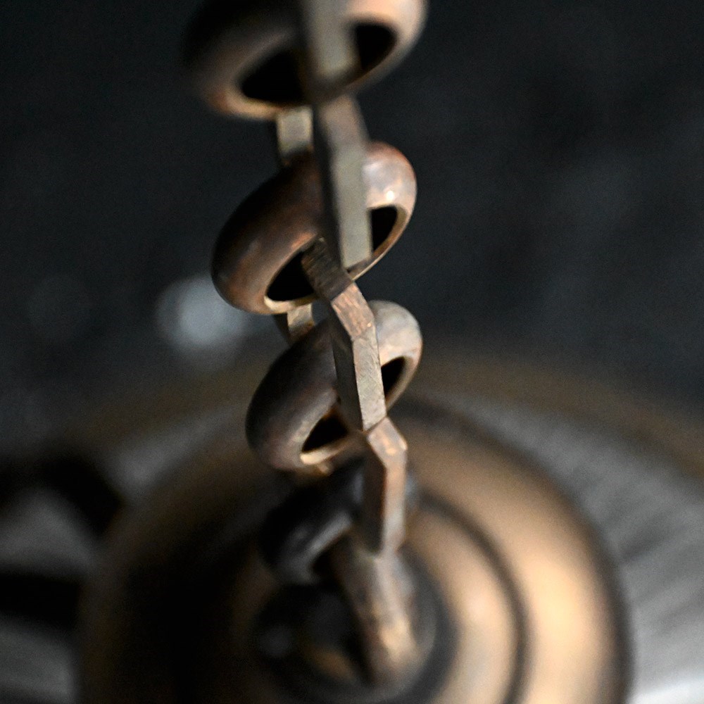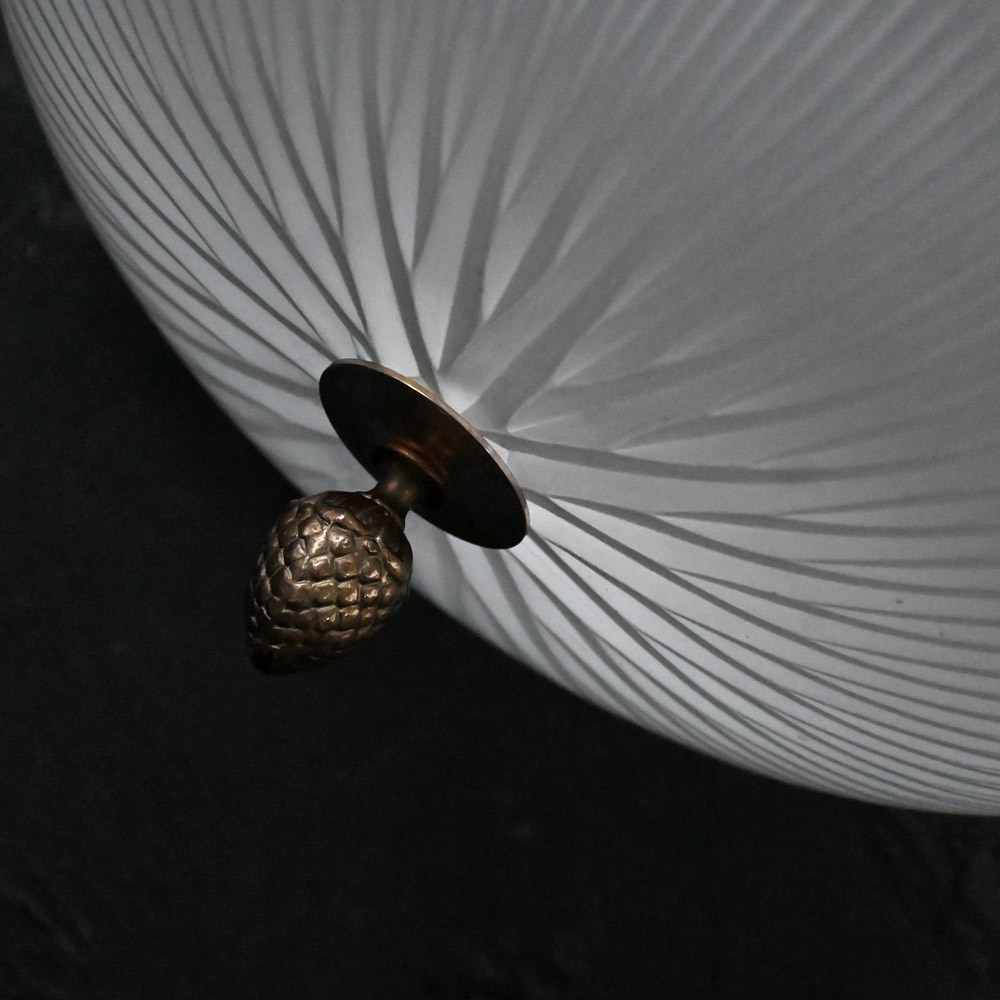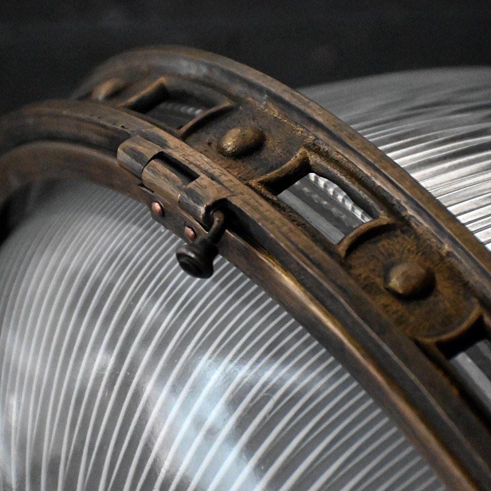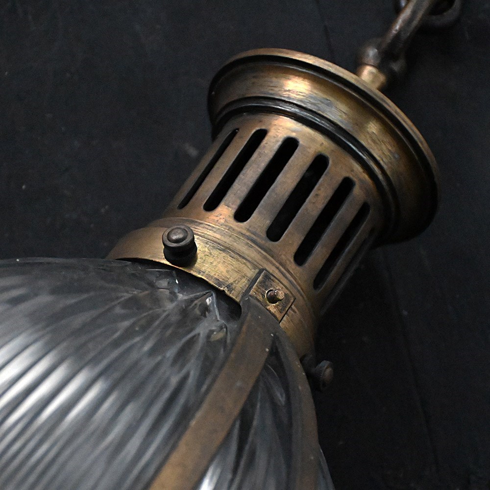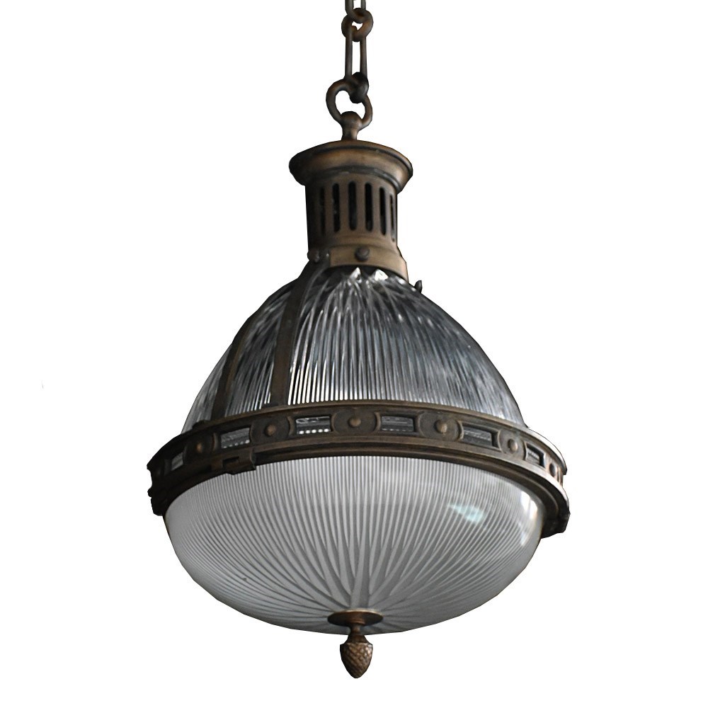 A huge early 20th century French Holophane glass and brass caged gallery with hanging chain. With a stunning illuminated glow and small acorn addition to its base. This item is not wired but can be by a professional to your needs.