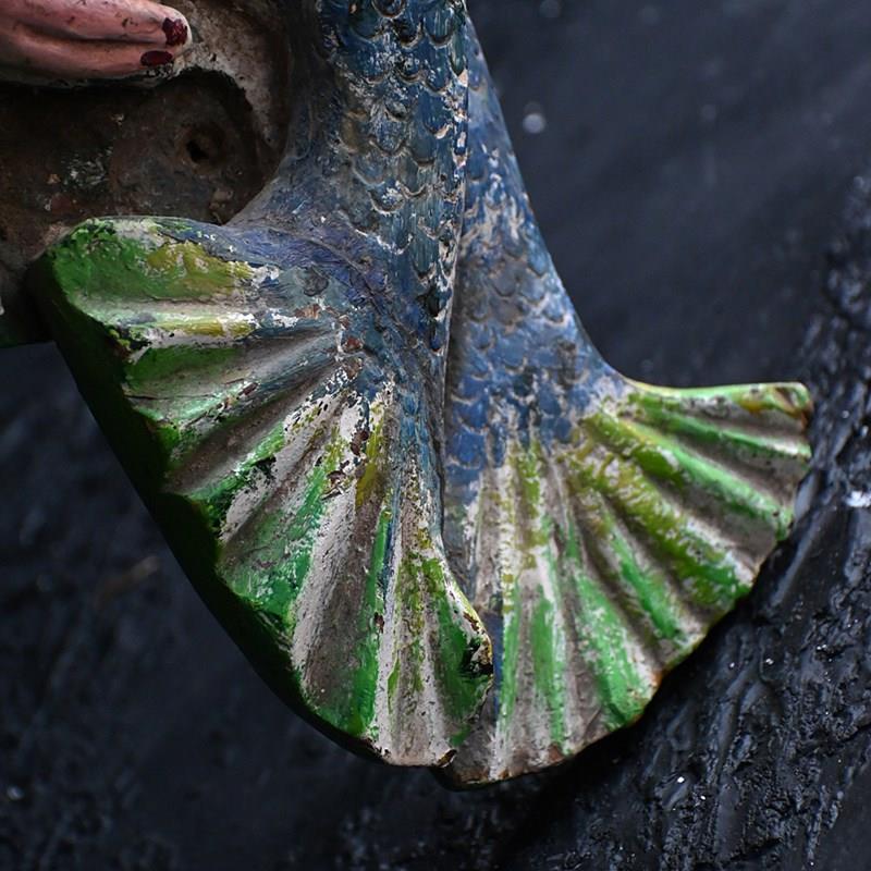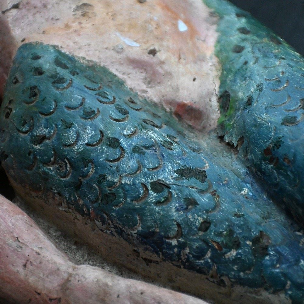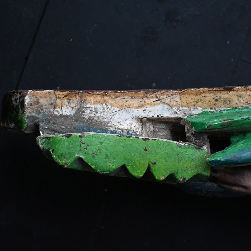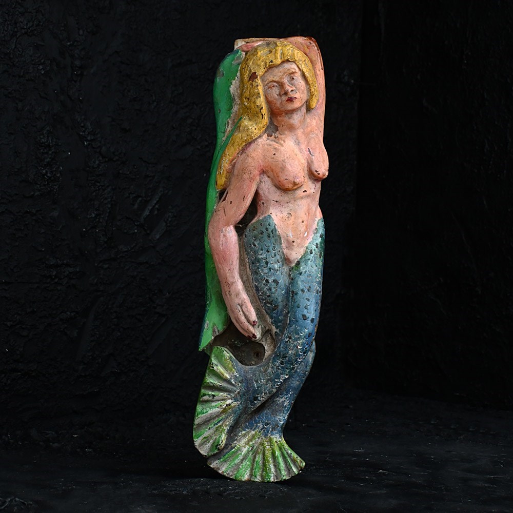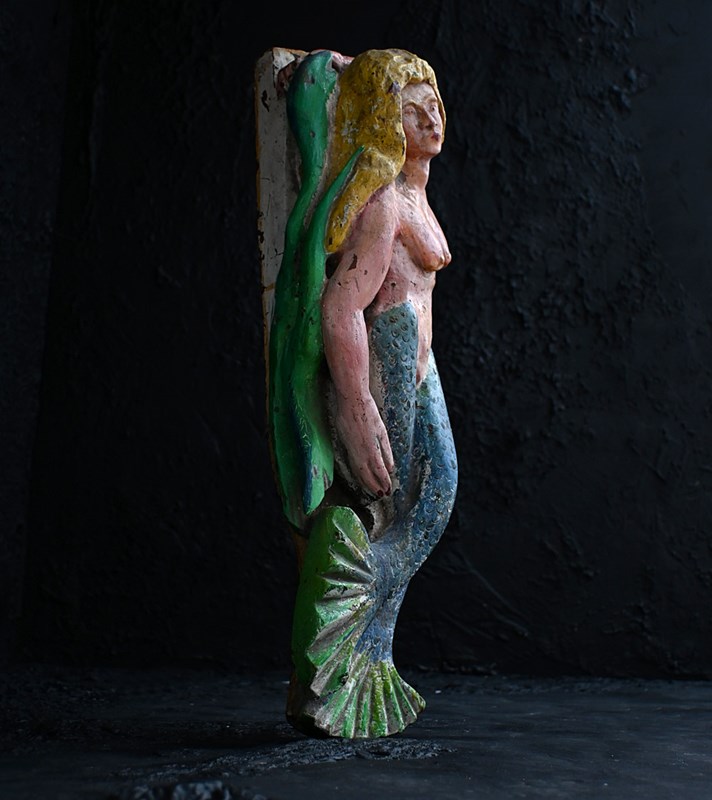 An early 20th century English maritime folk-art carving depicting a twin tailed mermaid surrounded by sea serpents. Hand carved from a single piece of dense wood, this sculptural fragment is believed to have originally formed part of a paired set and was likely mounted within a ship’s interior.