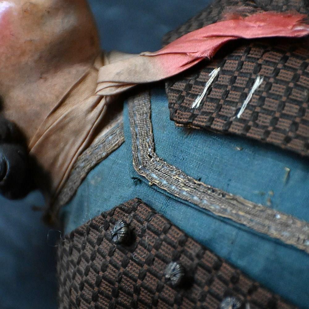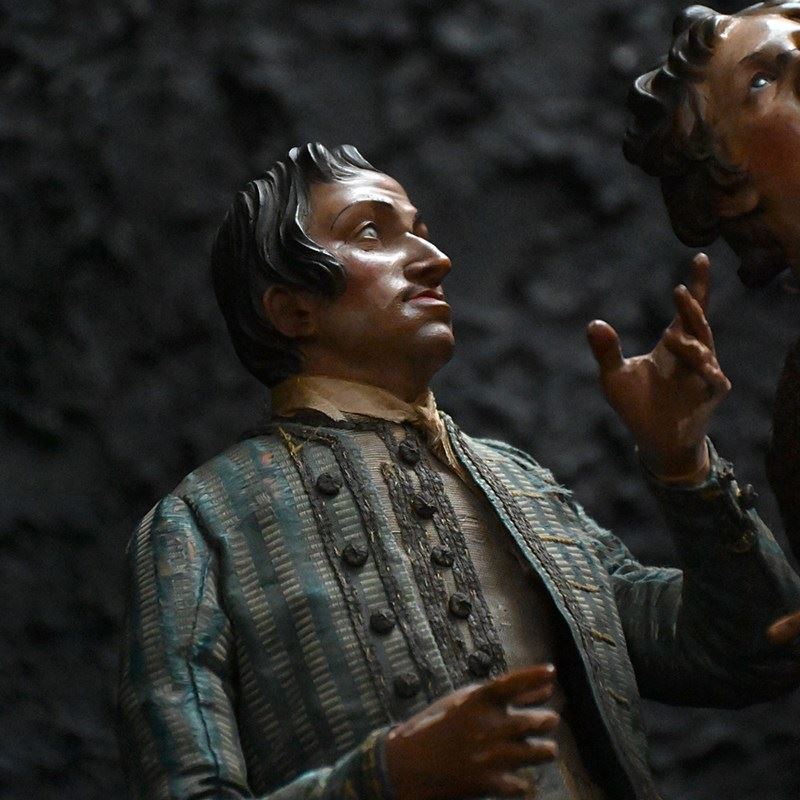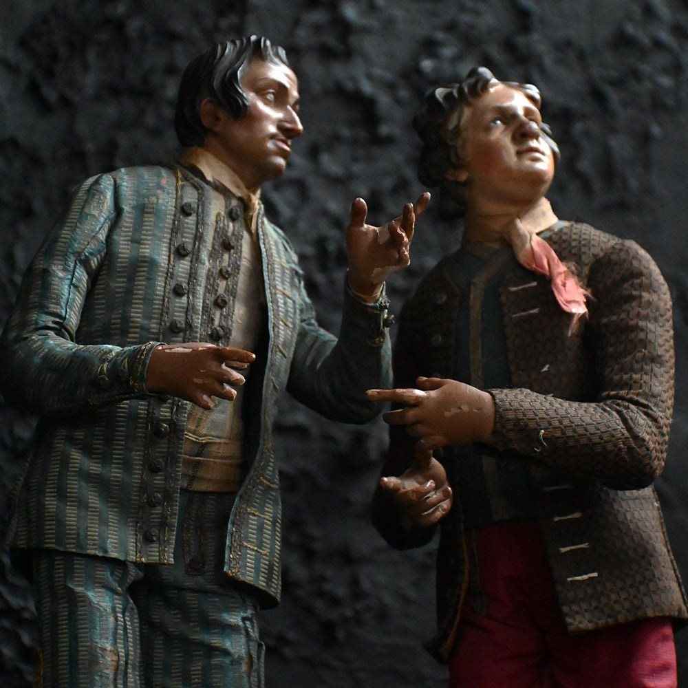A stunning pair of museum quality hand carved pine Napoleonic crib figures, in the form of two well-dressed Gentleman. With hand stitched silk and cotton garments, leather and wooden shoes and glass eyes still in place. Encased in a 19th century French glass dome for display purposes.