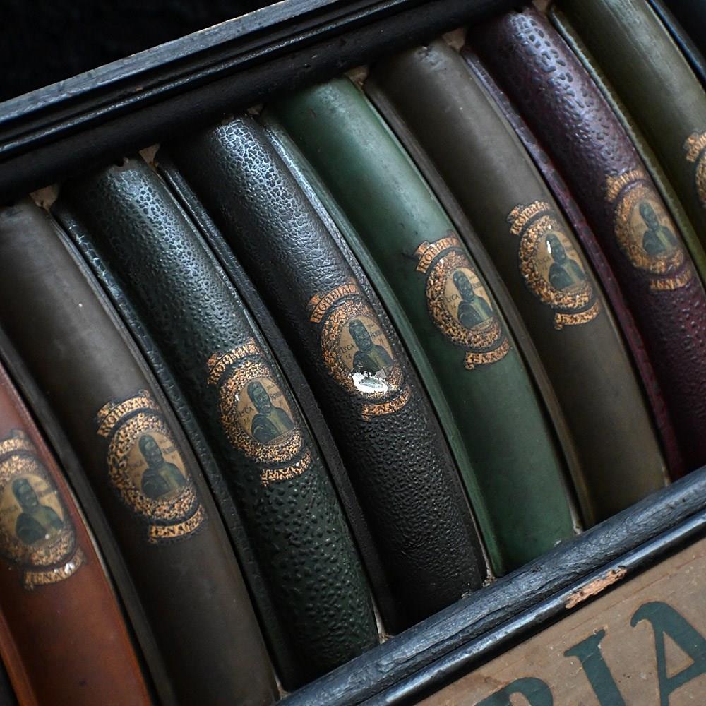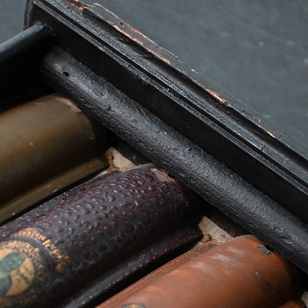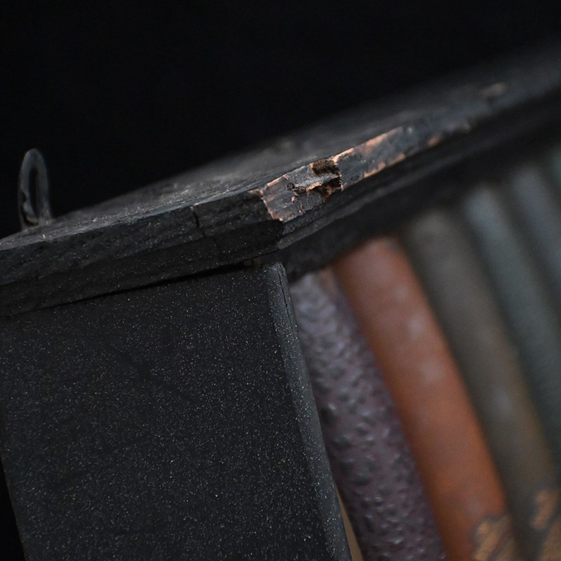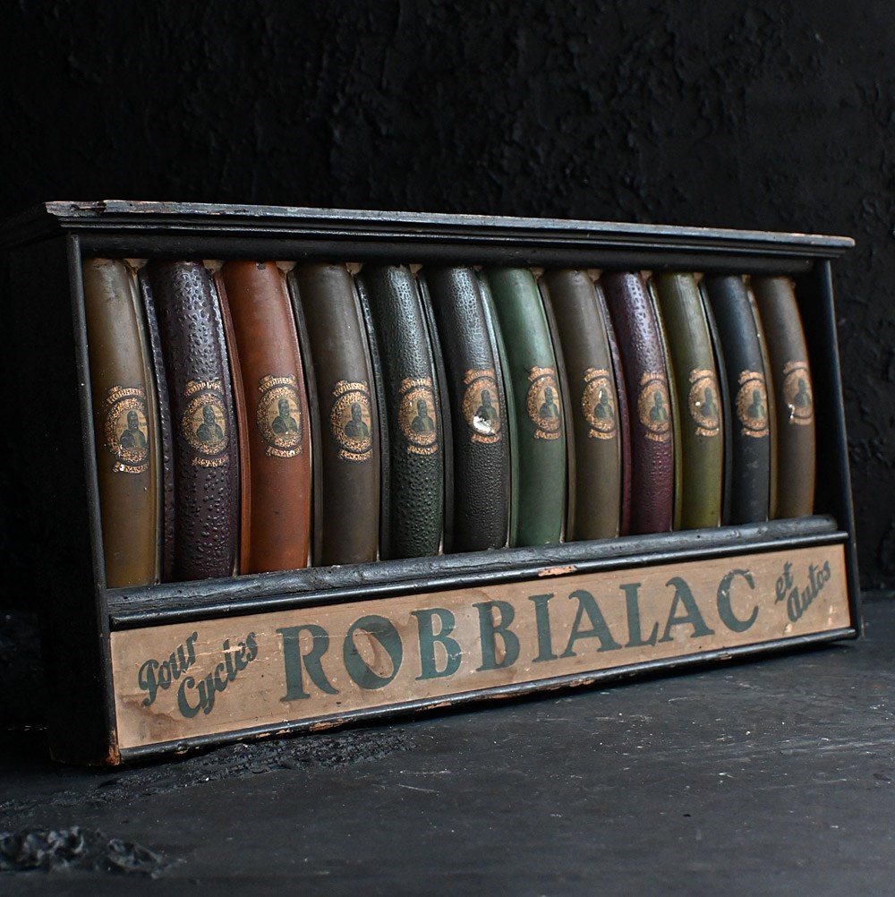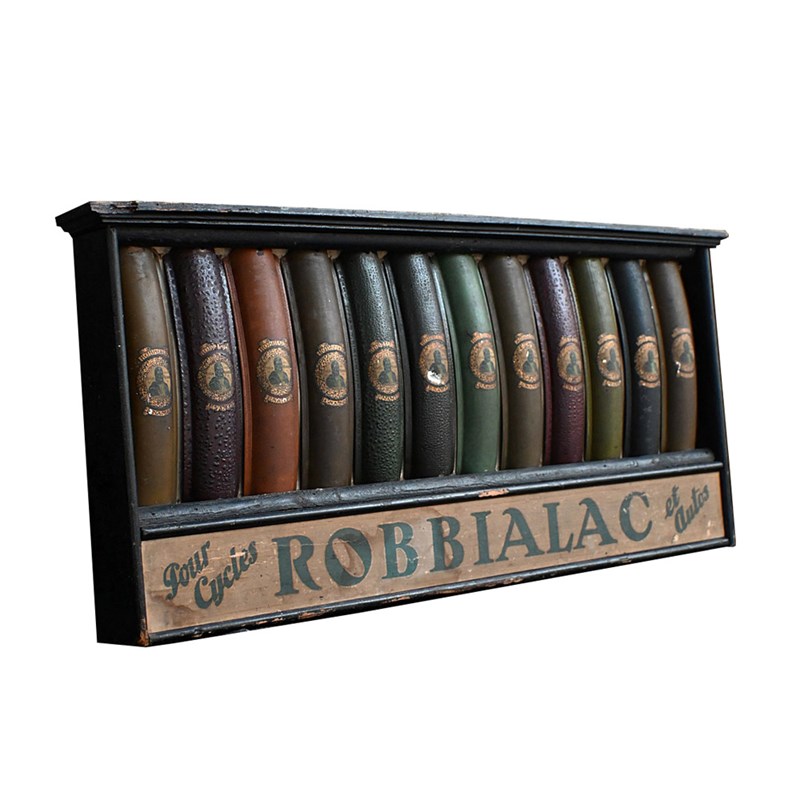 Every now and again we uncover truly on off artifacts, this is one of those items in the form an early 20th century paint manufactures (ROBBIALAC) point of sale / advertising display. The display is encased in an ebonised pine frame with sections of painted metal bicycle mud guards and stamped with gold leaf manufactures logos centrally. With its original support hooks still in place at the rear, lots of lovely, crackled paint as shown. Just a brilliant thing for any automotive or cycle enthusiast to own.