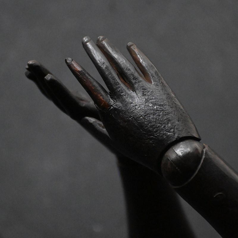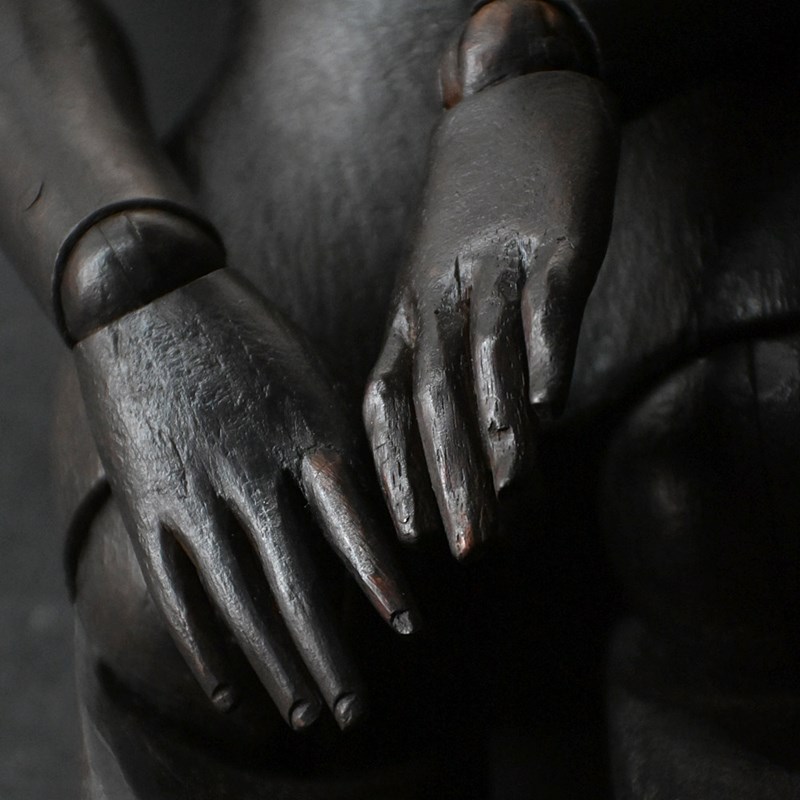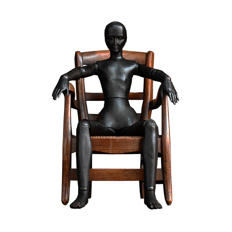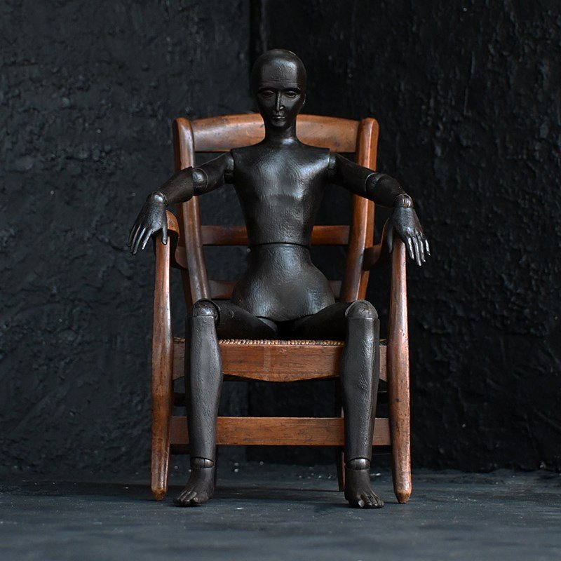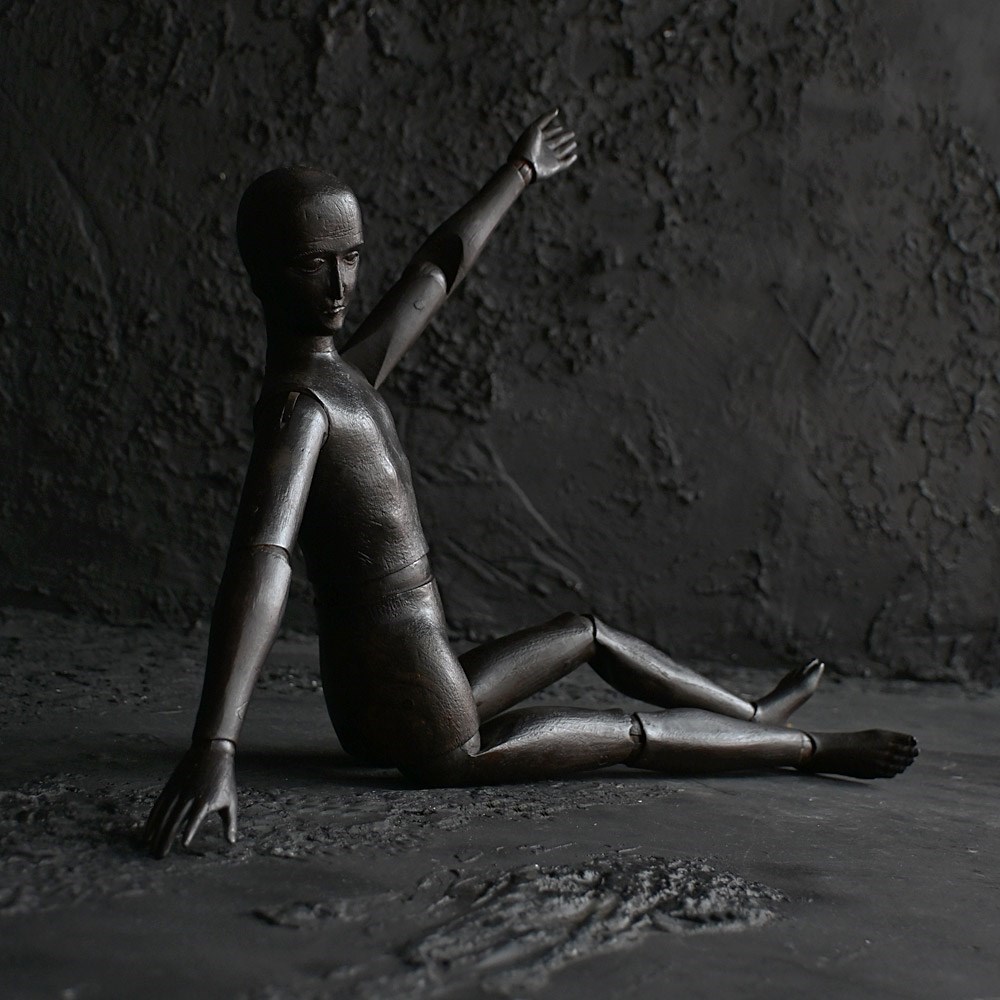 A detailed hand carved artists layfigure, in an ebonised colour with fully articulated parts.