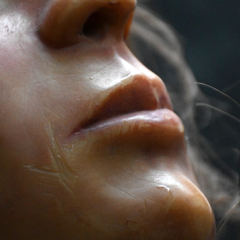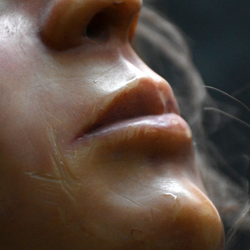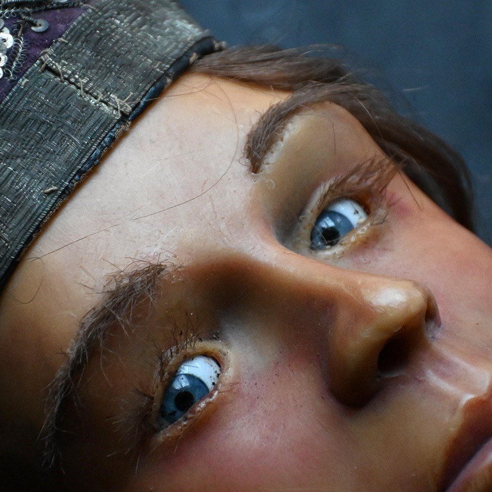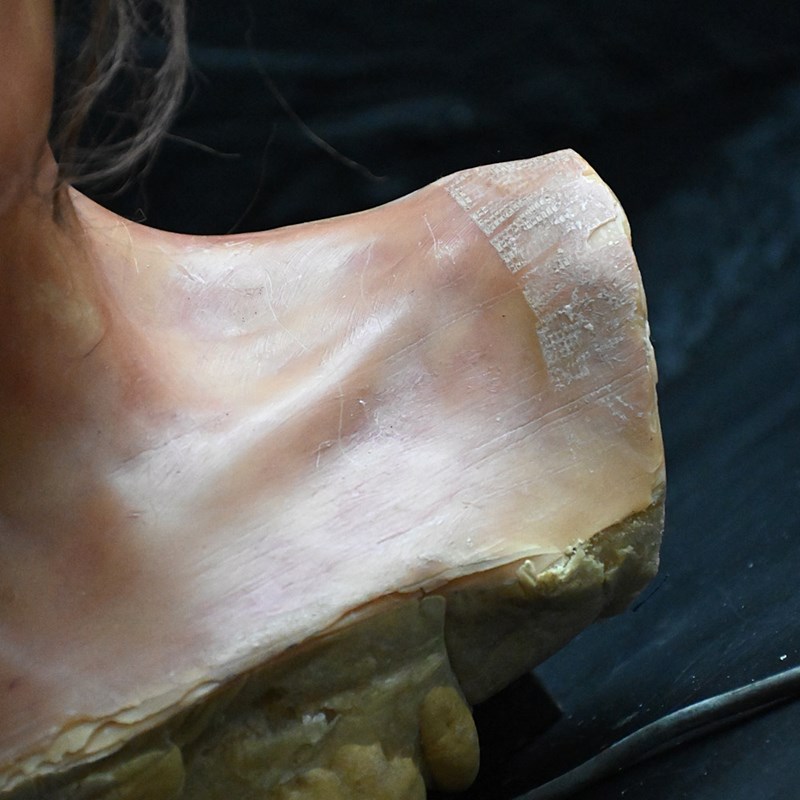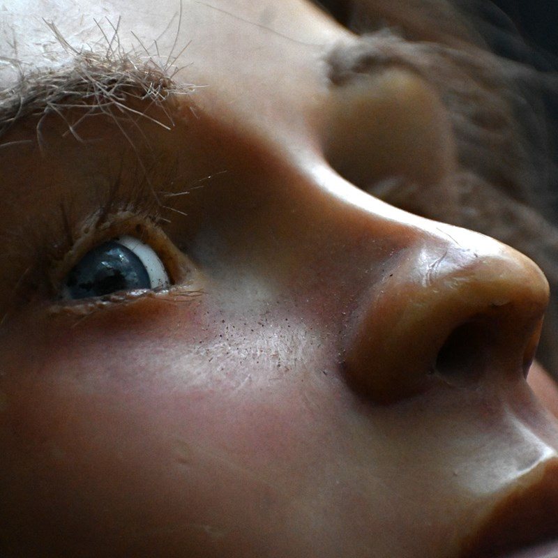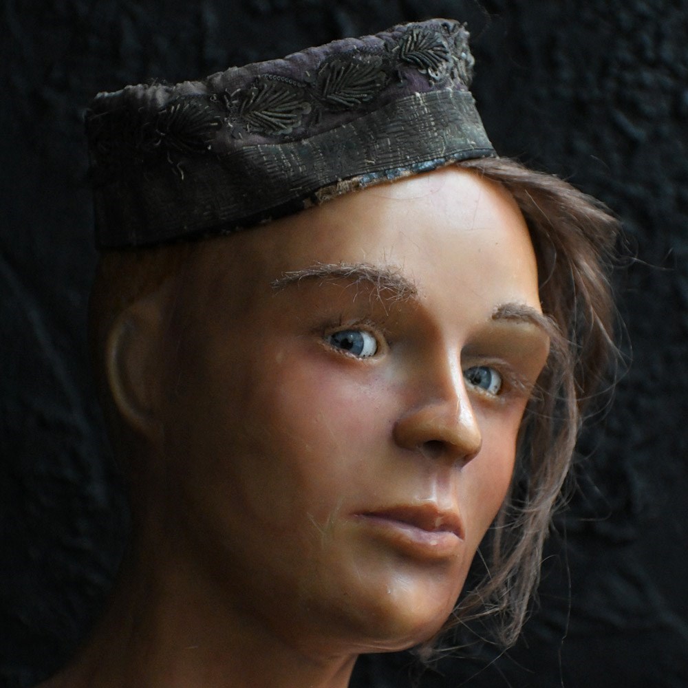 A creepy mid-20th Century English wax bust with glass eyes and synthetic hair. Wax moulded over a hard foam support as shown with 2 metal rods in place. Likely to come from a wax museum setting or fairground amusement of sorts.