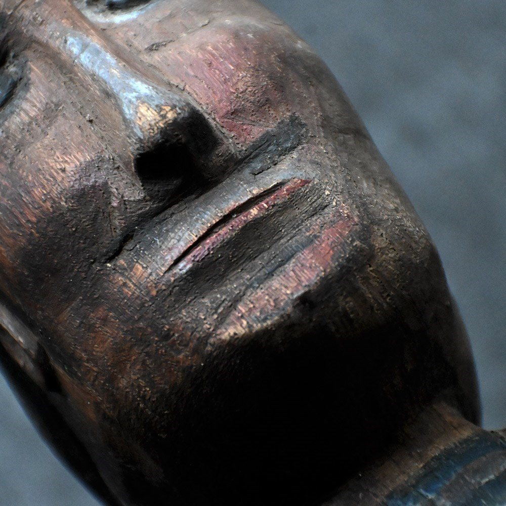 An unusual 19th Century hand carved folk art sailors stump carving. Many sailors would passed the time on long journeys at sea by creating a variety of sculptures from disregarded and found objects to sell and pass on as gifts to loved ones when they returned to land. This example is mounted onto a steal stand for display purposes.