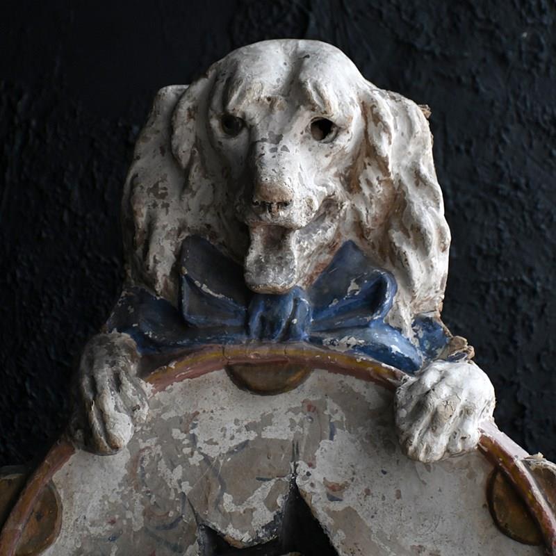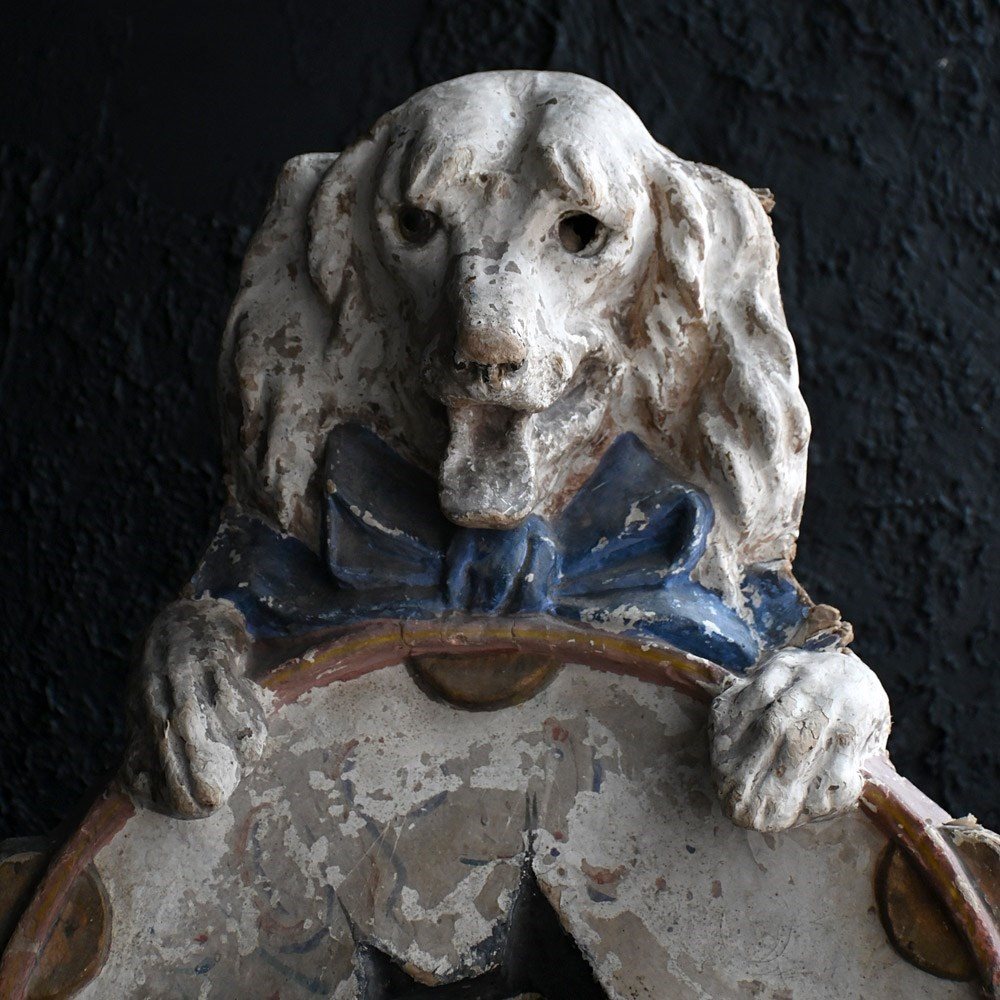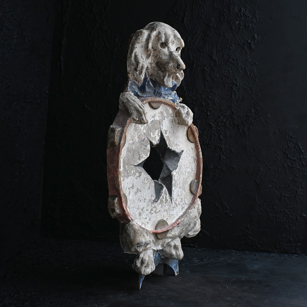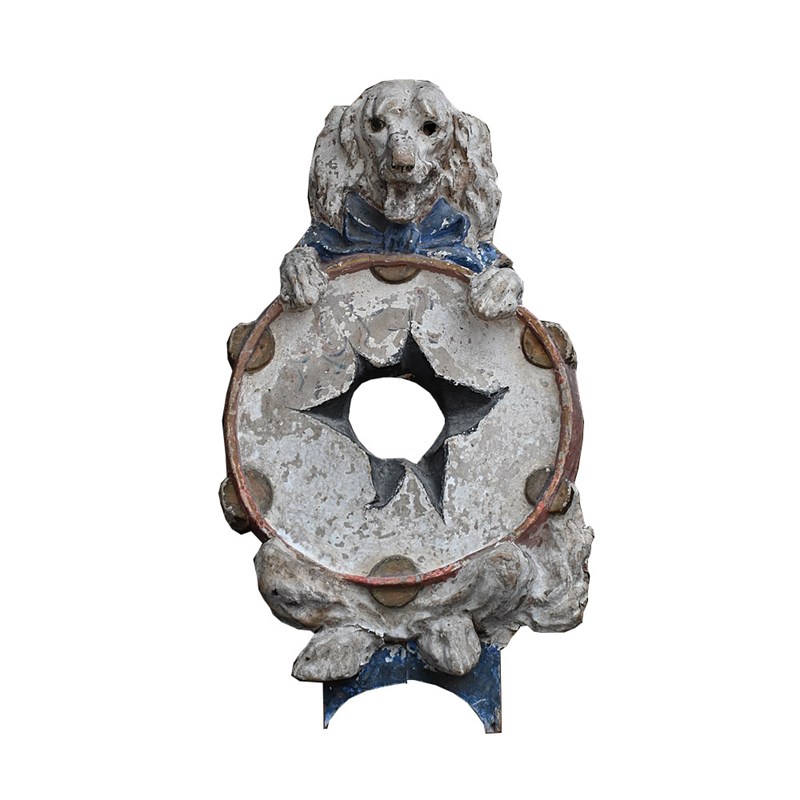 A section pine backed, papier mache front hand painted early 20th century fairground/carnival French amusement target / passe boule. This rare form of a spaniel dog is holding a large musical tambourine. People would try and throw a small wooden or rubber ball through the hole in the centre of the panel to get a prize.