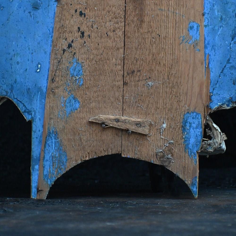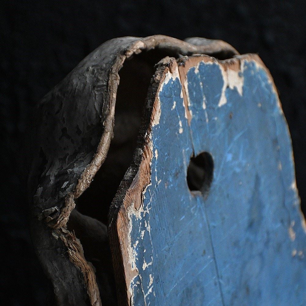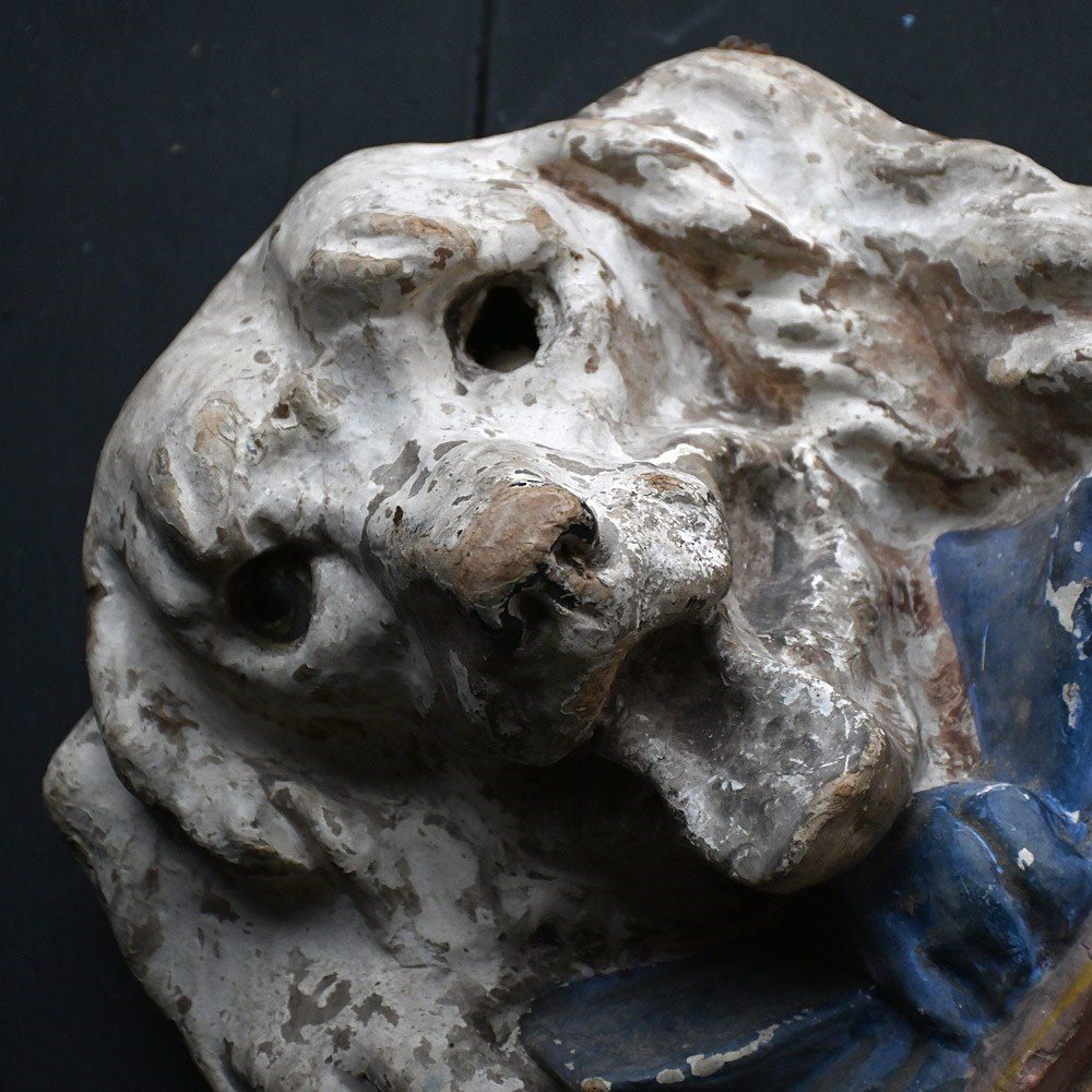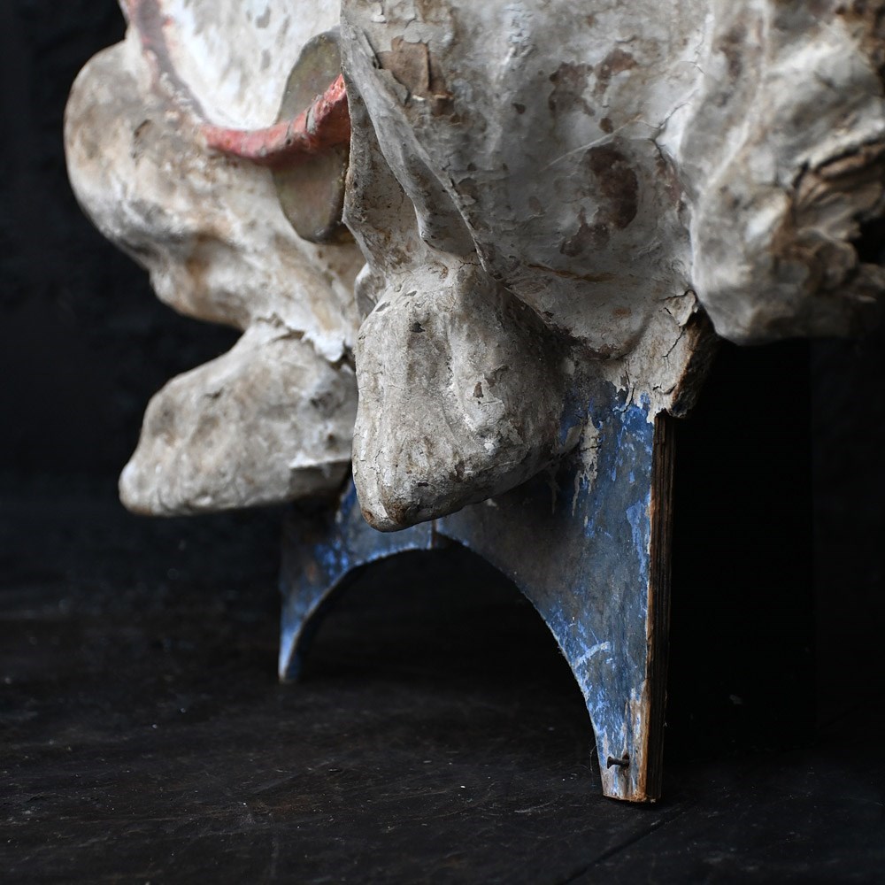 A worn authentic fairground artifact, the object is firmly in place however the pine base is away from the top head section. This item doesn’t stand alone, and the painted surface and paper is worn in sections as shown in the photos provided. The right-hand side eye is missing also leaving a hole.