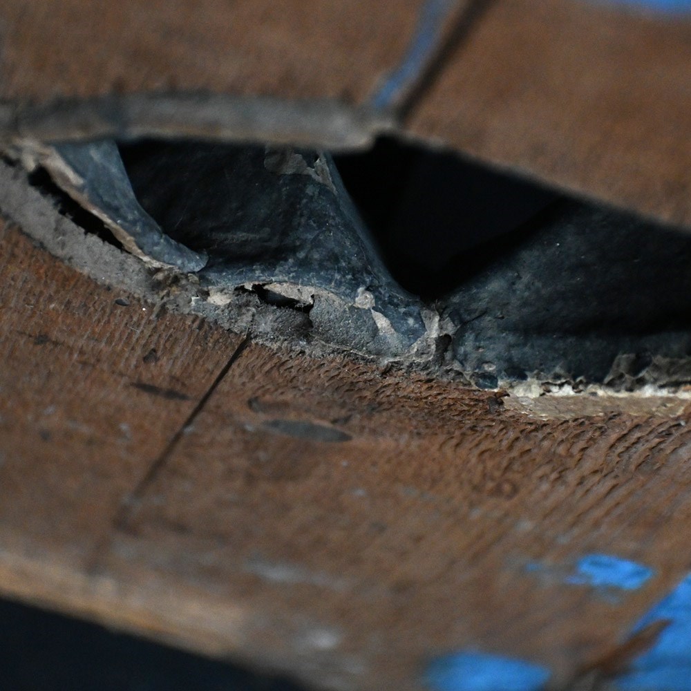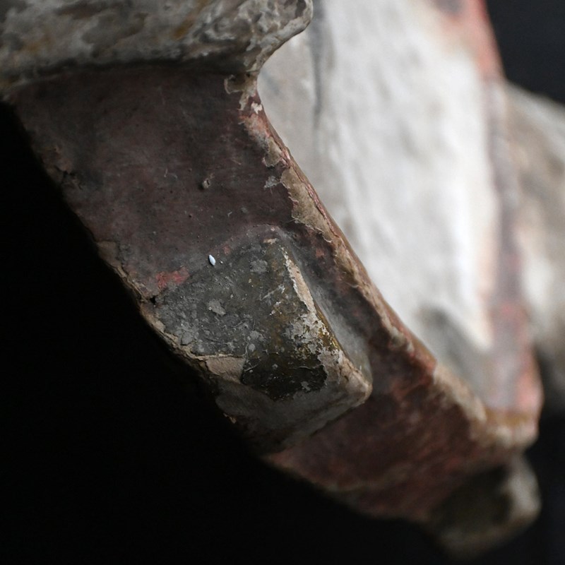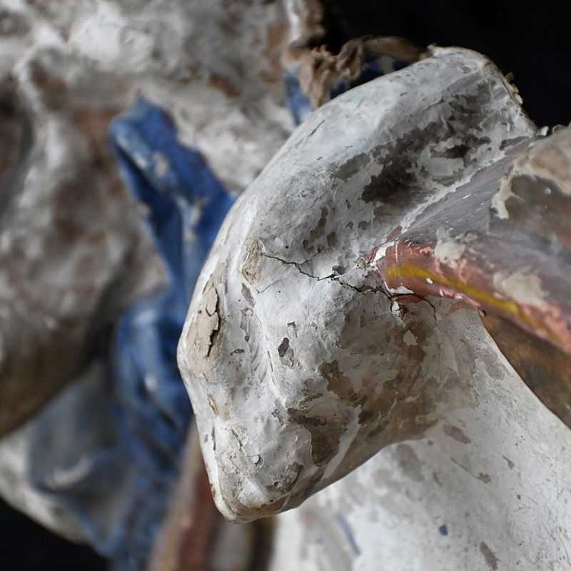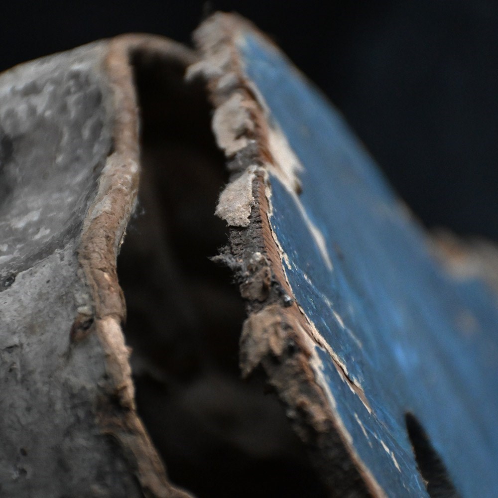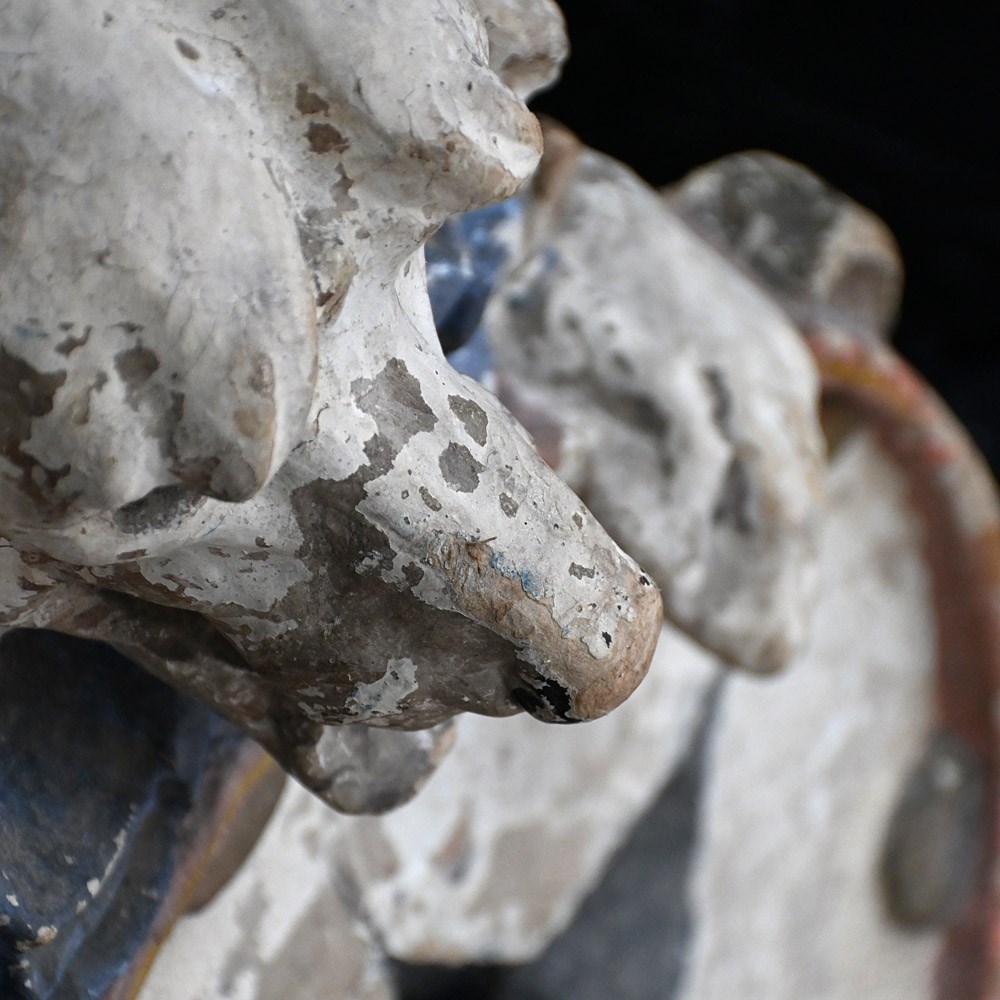A worn authentic fairground artifact, the object is firmly in place however the pine base is away from the top head section. This item doesn’t stand alone, and the painted surface and paper is worn in sections as shown in the photos provided. The right-hand side eye is missing also leaving a hole.