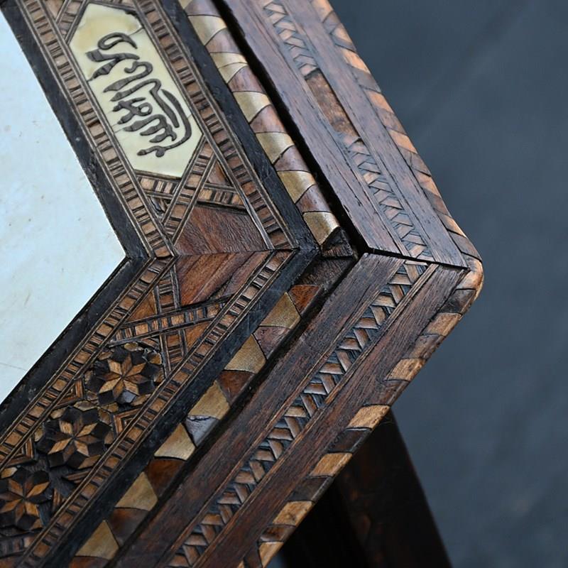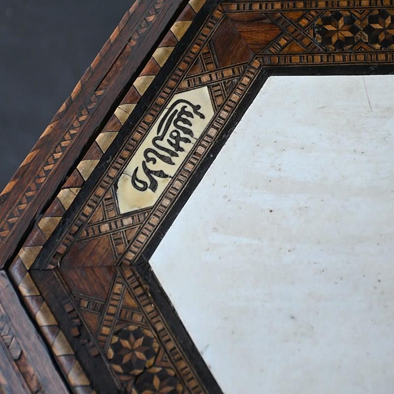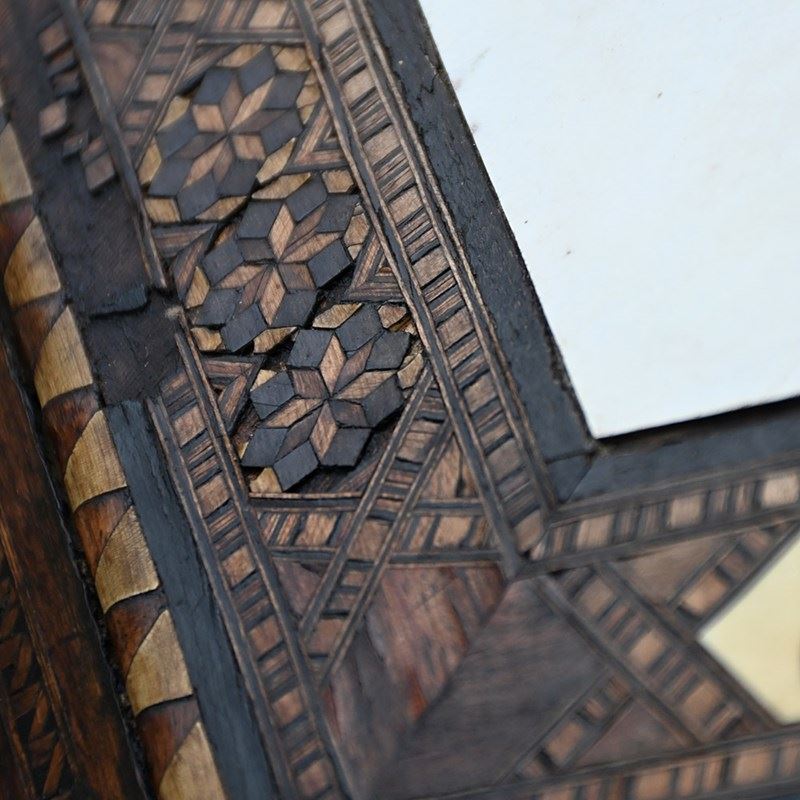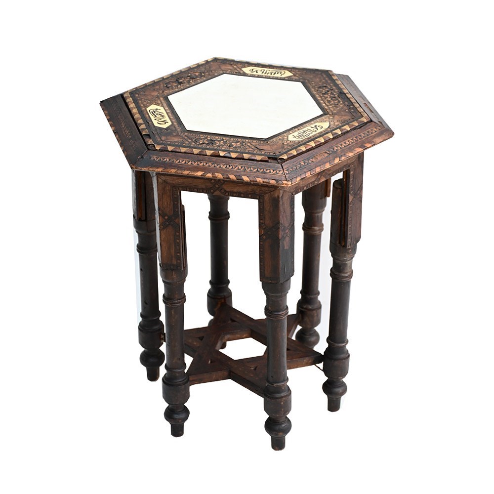 With inlaid hand carved detail, this is a true example of good quality Syrian furniture. With lots of natural age as shown, this is a well-used example. A lovely star shape sets the table base with metal support pins. Inlaid sections of different dyed piece of fine wood cover this table. The to section has been replaced dur to loss.
