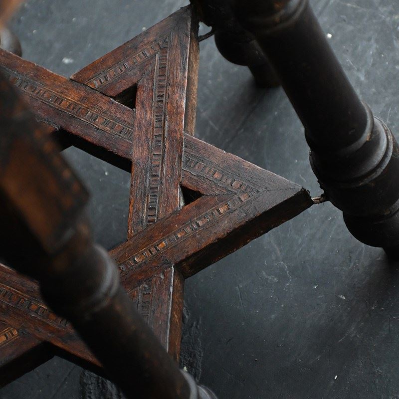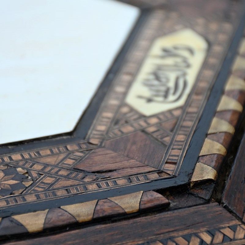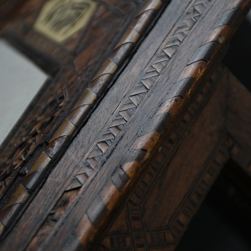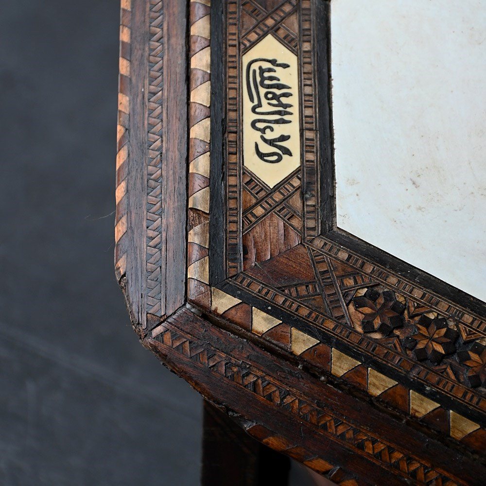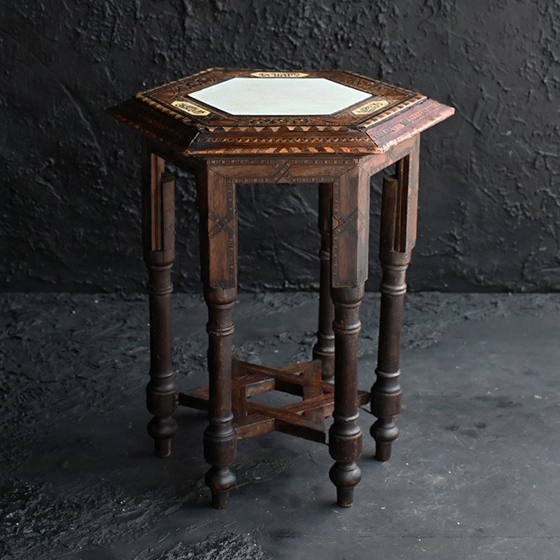 With inlaid hand carved detail, this is a true example of good quality Syrian furniture. With lots of natural age as shown, this is a well-used example. A lovely star shape sets the table base with metal support pins. Inlaid sections of different dyed piece of fine wood cover this table. The to section has been replaced dur to loss.