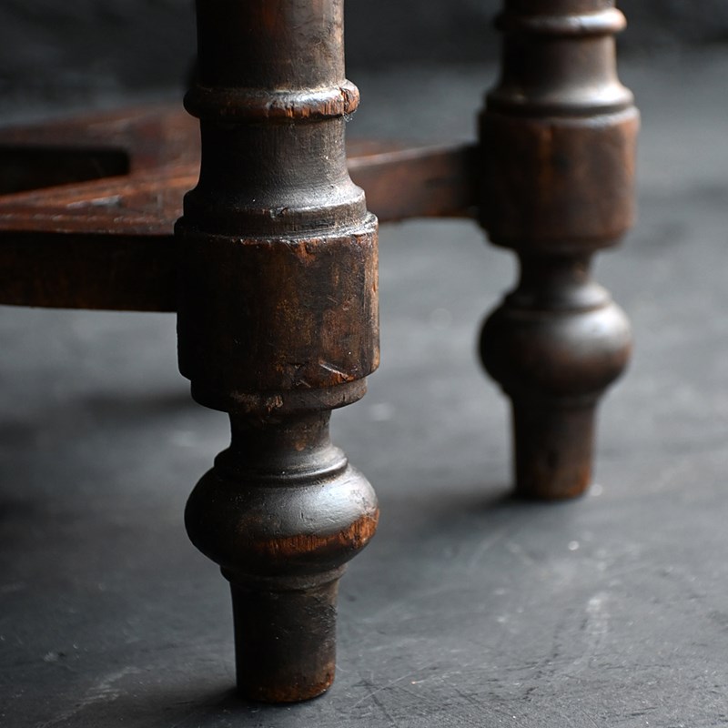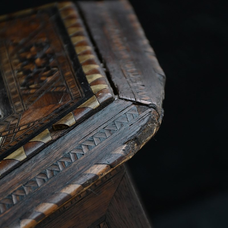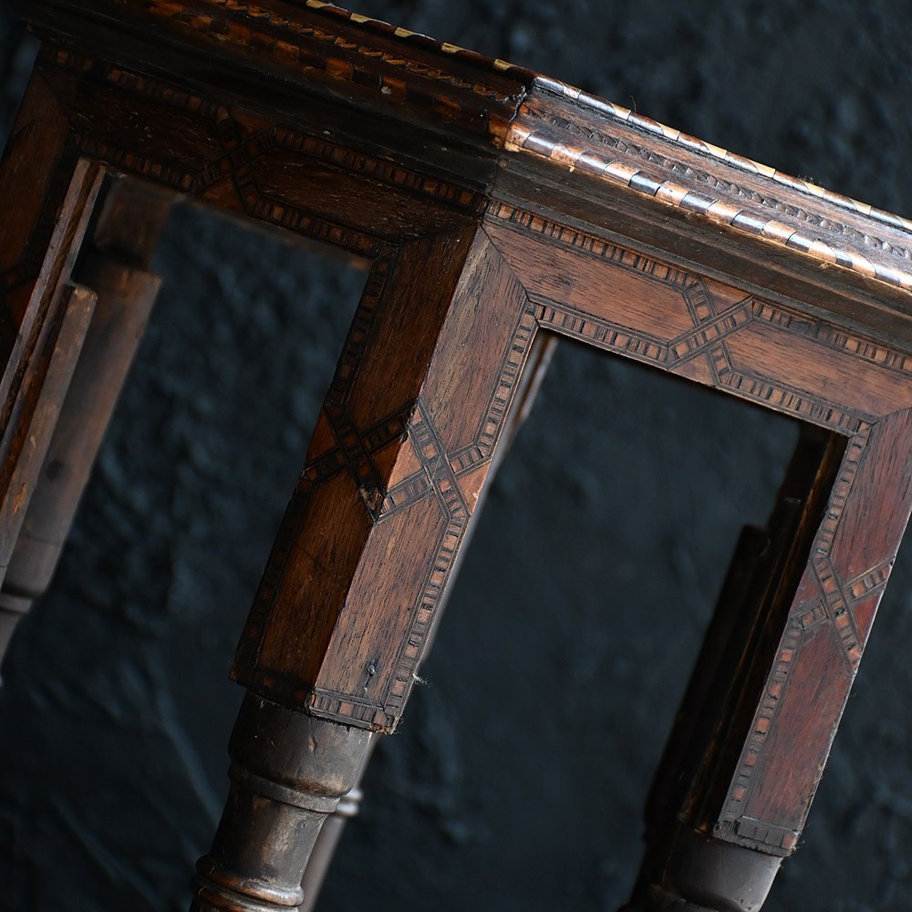 Aged naturally over time, one corner has worn away with damage as shown, sections of inlayed detail are missing, the top section (in white) has been replaced due to loss. This item stands firm and secure without movement. Please consider this is an authentic piece of well used antique furniture, which reflects in its condition as we have tried to show in the photos.