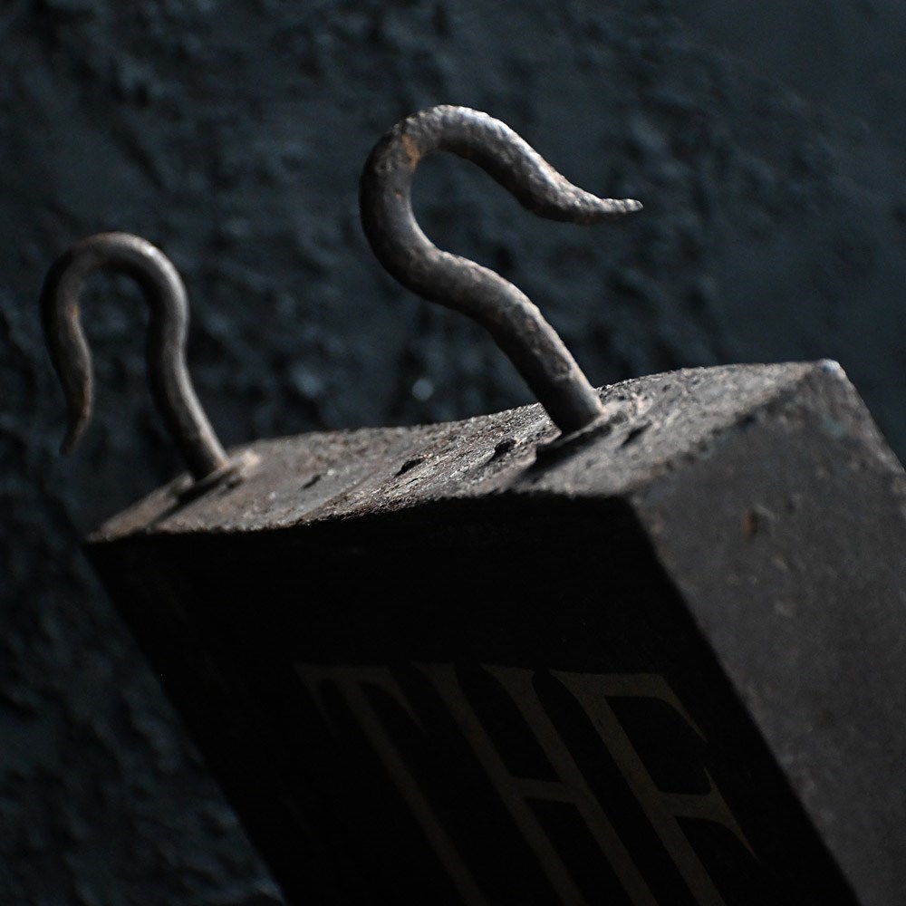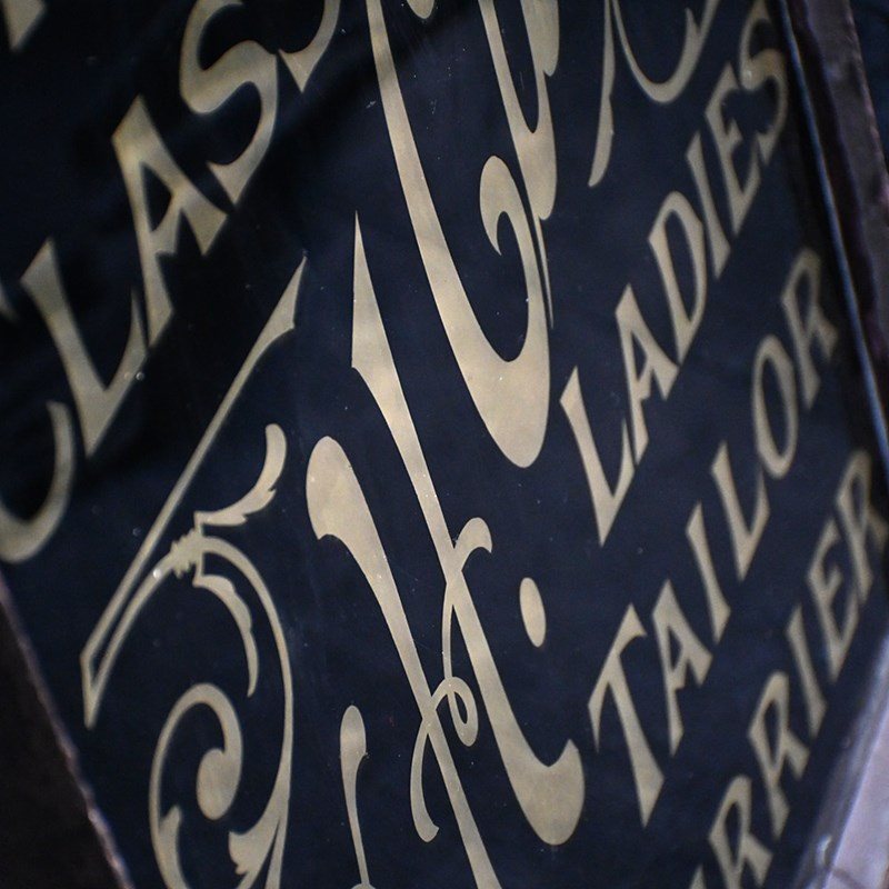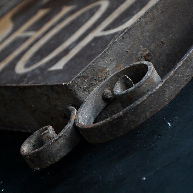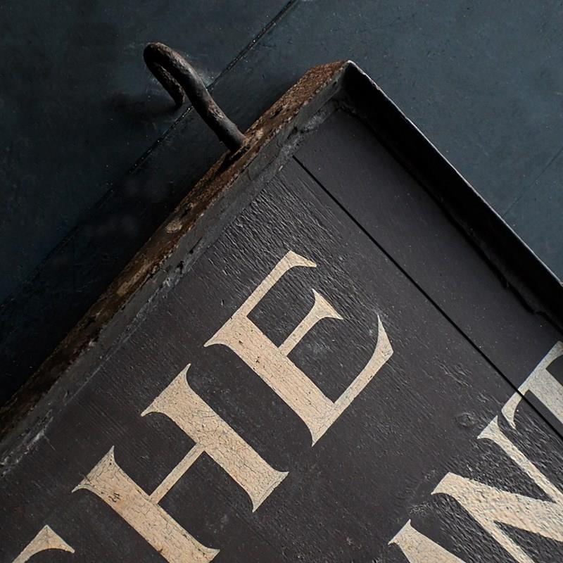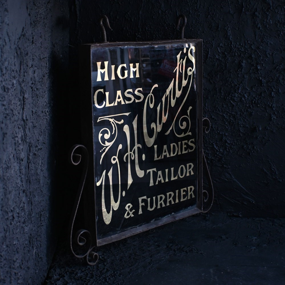 A rare example of a double-sided early 20th century English tailors trade sign. One side in reverse painted glass and the other in hand painted detail. Supported with a cast iron frame and supported hanging hooks in place. With great natural ages surface.