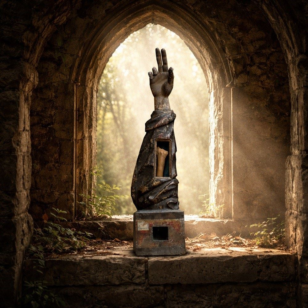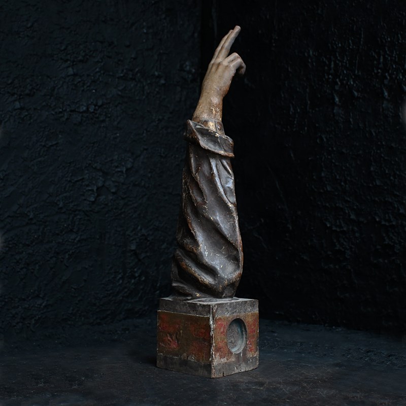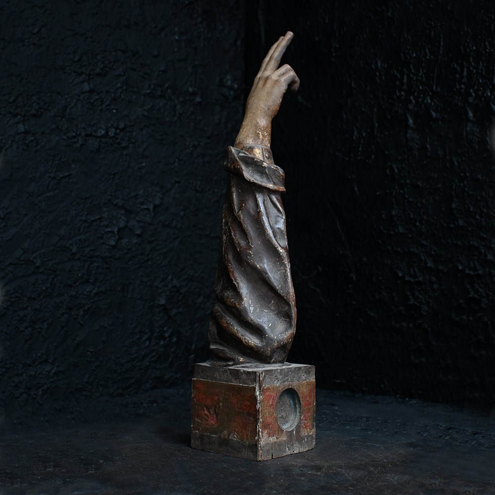An arm reliquary (or bras-reliquaries) is a "speaking reliquary"—a sacred vessel shaped like the body part it was intended to house. Beyond being a container for a saint's remains, every detail of its design served a specific theological and liturgical purpose. The extended index and middle fingers represent the Latin gesture of blessing.