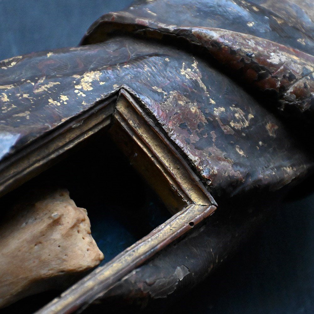This example is aged naturally as you may expect as its over 300 years, it still has a museum stamp to the front sections as shown. The crystal panel that would have been positioned centrally is missing.